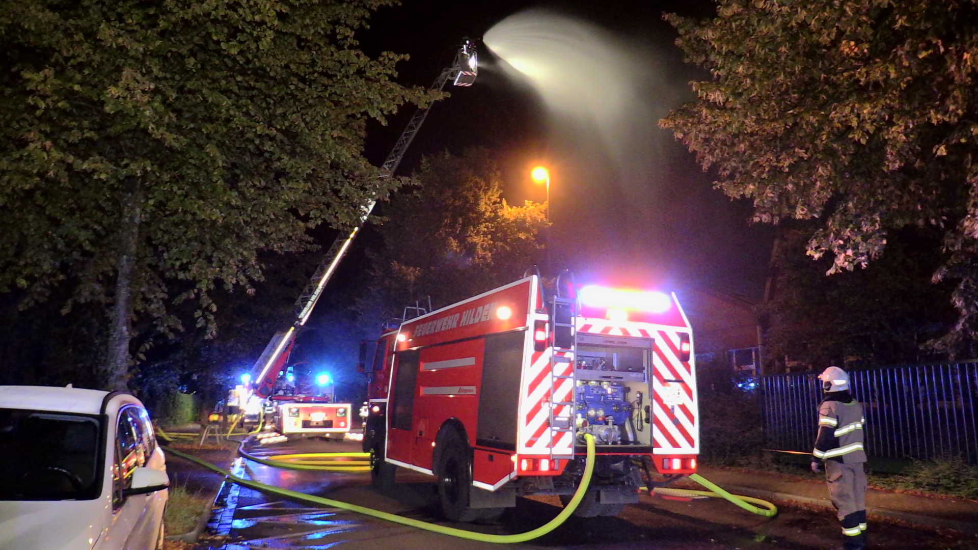 Die Feuerwehr Hilden wurde am 26.08.2021 gegen 23:50 Uhr zu einer Feuermeldung, auf die Max-Volmer-Straße, alarmiert. Bei Eintreffen der ersten Einsatzkräfte stellte sich heraus, dass es zu einem ausgedehnten Brandereignis, in einer Halle, gekommen war. Unverzüglich wurde der Löschangriff eingeleitet. Während der Einsatzmaßnahmen wurde die Alarmstufe auf „Vollalarm mit Sirene“ erhöht. Nachdem das Feuer unter Kontrolle war, mussten umfangreiche Entrauchungsmaßnahmen und Nachlöscharbeiten