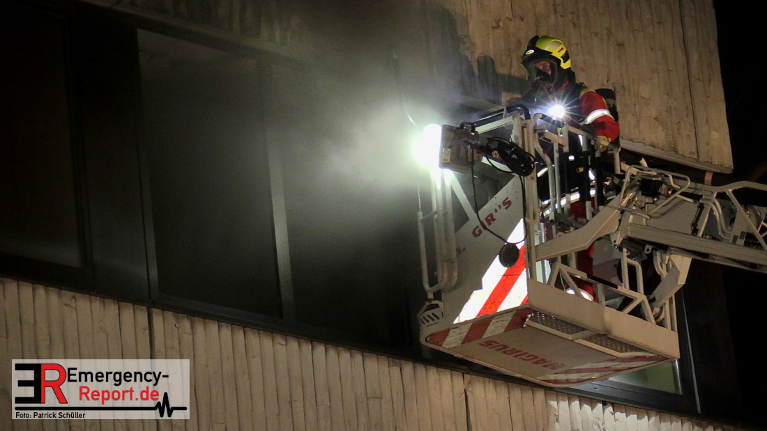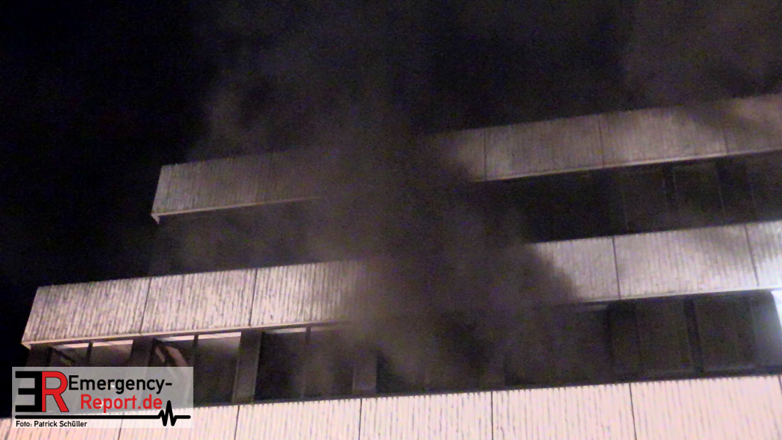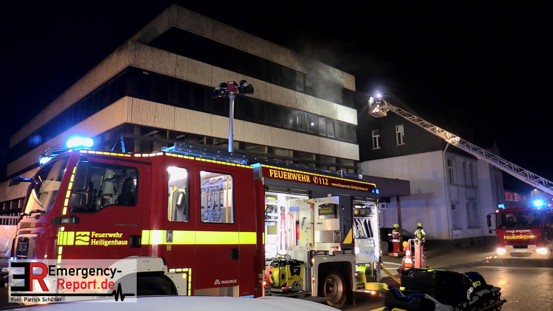 Um 00:03 Uhr wurde die Feuerwehr Heiligenhaus zur Mozartstraße alarmiert. Anwohner meldeten, dass die oberste Etage eines leerstehenden Bürogebäudes in Vollbrand steht und sich noch Personen darin befinden. Als die ersten Kräfte eintrafen stellten sie eine massive Verrauchung und Feuerschein aus den oberen Etagen des Gebäudes fest. Auf der Rückseite des Gebäudes drang Rauch durch die bereits geborsten Scheiben. Umgehend ging ein Trupp in das Gebäude vor, parallel wurden weitere Kräfte aus Heiligenhaus alarmiert, im Stadtgebiet heulten die Sirenen und ein weiterer Löschzug der Feuerwehr Ratingen wurde alarmiert.