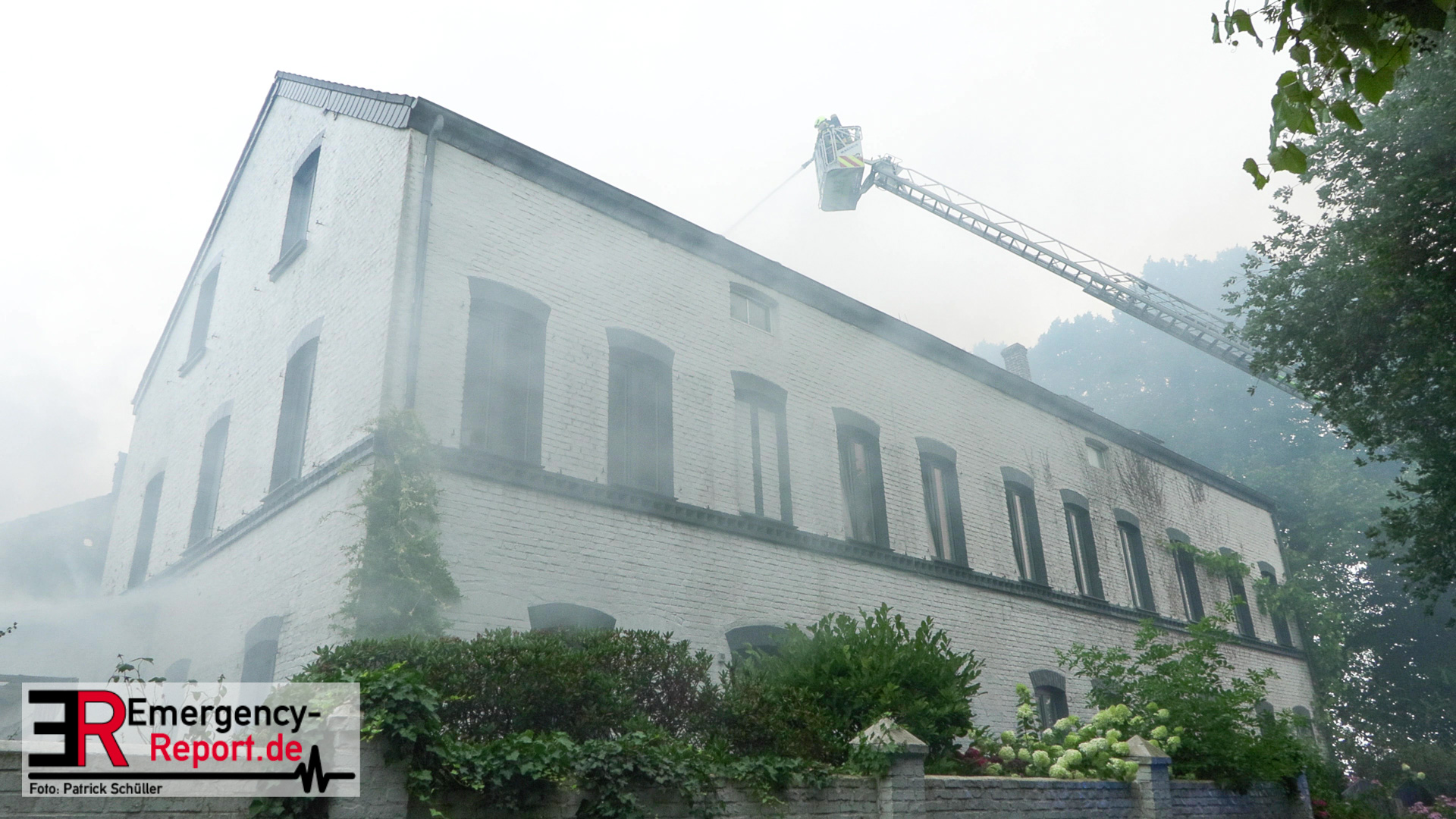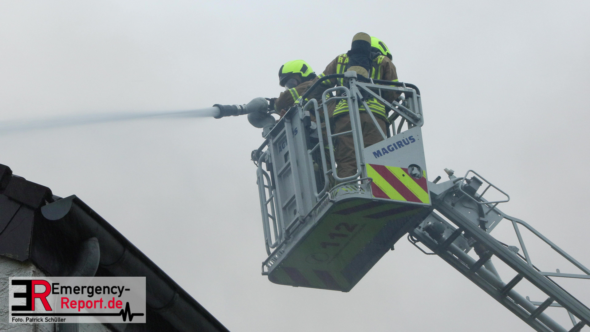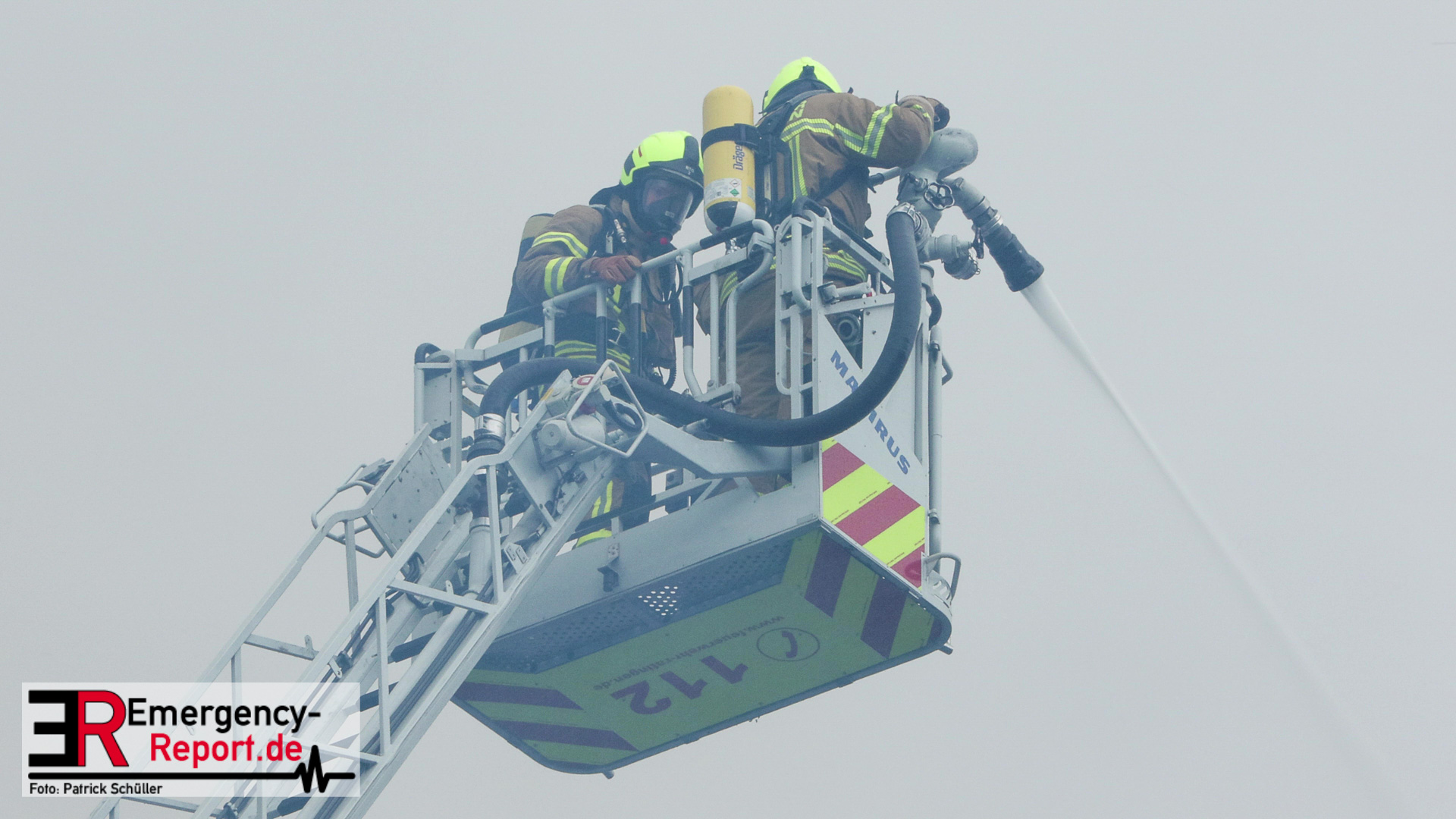 Da das Feuer zu diesen Zeitpunkt bereits das angrenzende Wohngebäude bedrohte, wurden zwei weitere Drehleitern in Stellung gebracht, um eine Ausbreitung effektiv zu verhindern. Äußerst hilfreich sowohl bei der Lagebeurteilung als auch bei der gezielten Kräftekoordination erwies sich der Einsatz einer Drohne mit Wärmebildkamera.