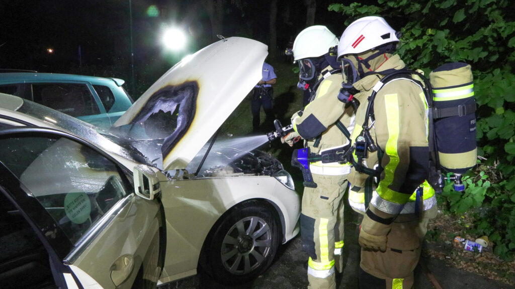 Nur einige Minuten später erhielten die Einsatzkräfte einen weiteren Brandeinsatz an der nur wenige Gehminuten entfernten Paul-Lincke-Straße. Ein aufmerksamer Anwohner eines Mehrfamilienhauses hatte gegen 22 Uhr den Brandausbruch an einem vor einer Garage abgestellten Mercedes Benz C200 bemerkt und den Fahrzeuginhaber informiert. Dieser konnte die brennenden Scheibenwischer eigenständig löschen. Dennoch wurde sowohl der Lüftungseinlass an der Windschutzscheibe als auch der Lack an der Motorhaube durch die Hitze beschädigt. Die Polizei schätzt den Sachschaden auf circa 3.000 Euro.