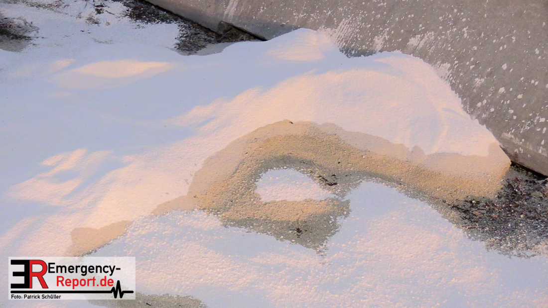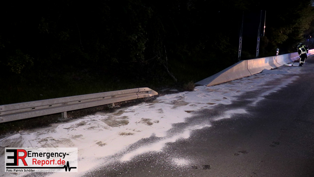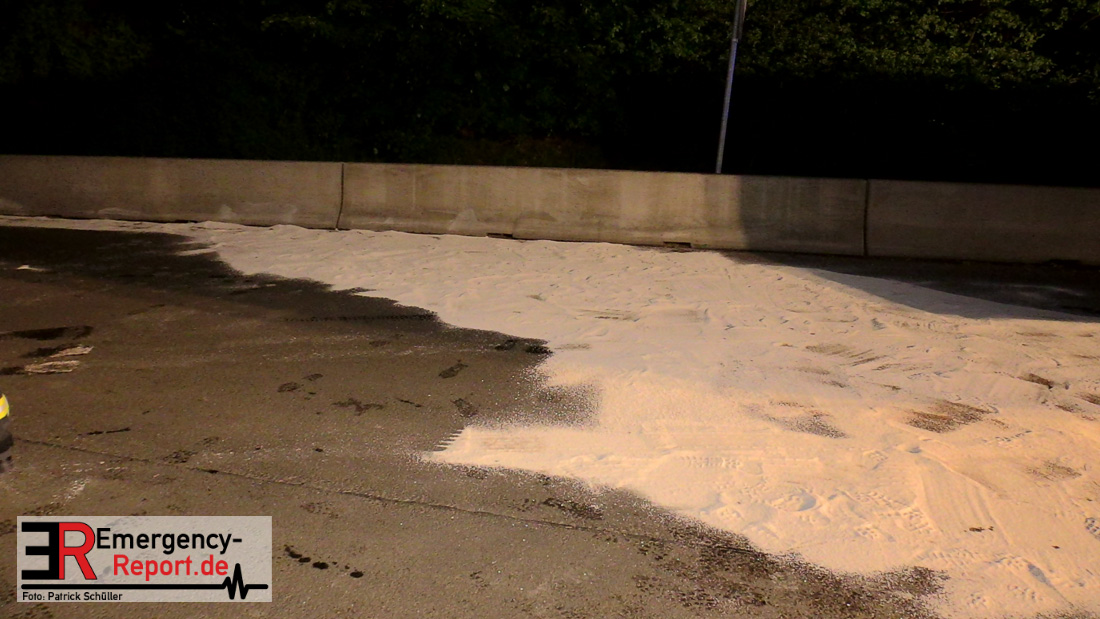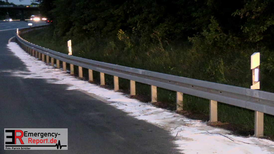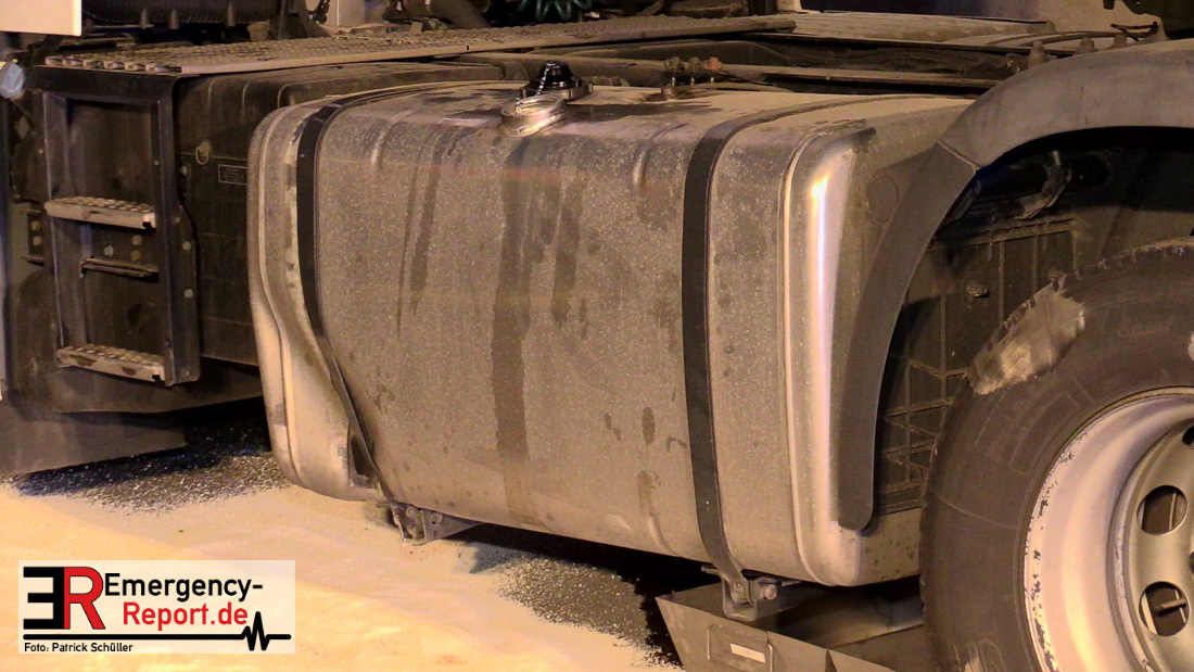 Unverzüglich rückten das Hilfeleistungslöschfahrzeug (HLF), der Rüstwagen (RW) und der Gerätewagen Öl (GW ÖL) der hauptamtlichen Wache zur angegeben Adresse auf die Autobahn aus. Zusätzlich wurden zu diesem Einsatzstichwort noch die Löscheinheit 4 Wiescheid und der Löschzug 1 Innenstadt alarmiert. Auf dem Rastplatz angekommen stellte der Wachführer fest, dass der Tank an einem Lastkraftwagen erheblich beschädigt war und daher auch größere Mengen Dieselkraftstoff ausliefen. Sofort wurden hier umfangreiche Maßnahmen eingeleitet, um den auslaufenden Kraftstoff aufzufangen. Gleichzeitig wurde Ölbindemittel auf die Fahrbahn aufgebracht, um den Kraftstoff so einzudämmen. Zusätzlich kam eine explosionsgeschützte Druckluftmembranpumpe zum Einsatz, um die Restmenge aus dem Tank in ein mitgeführtes Edelstahlfass umzupumpen. Der LKW-Tank war vor der Havarie an dem Kantenstein mit ca. 350 Liter Dieselkraftstoff gefüllt.
