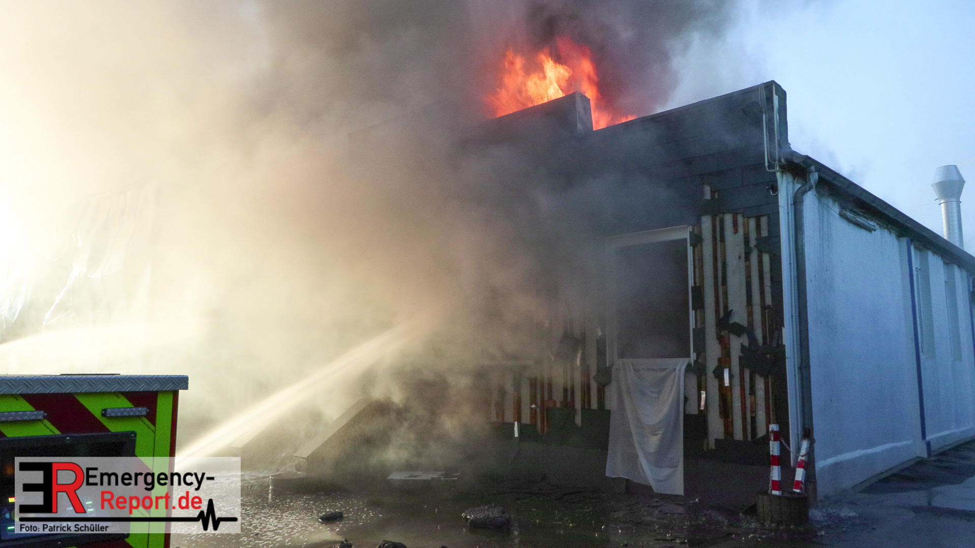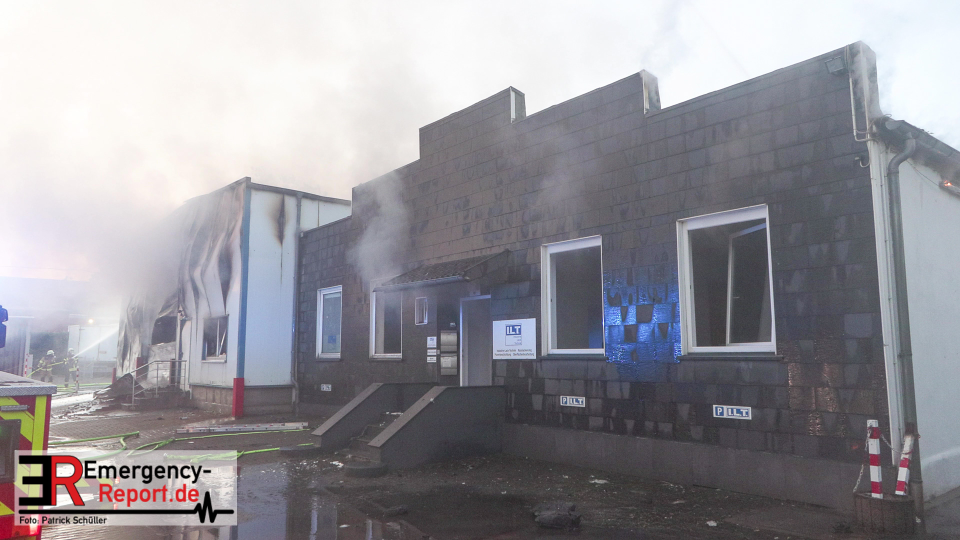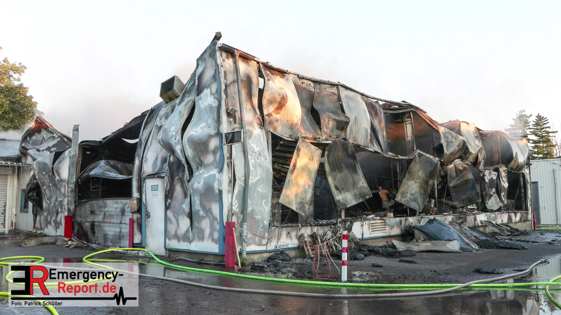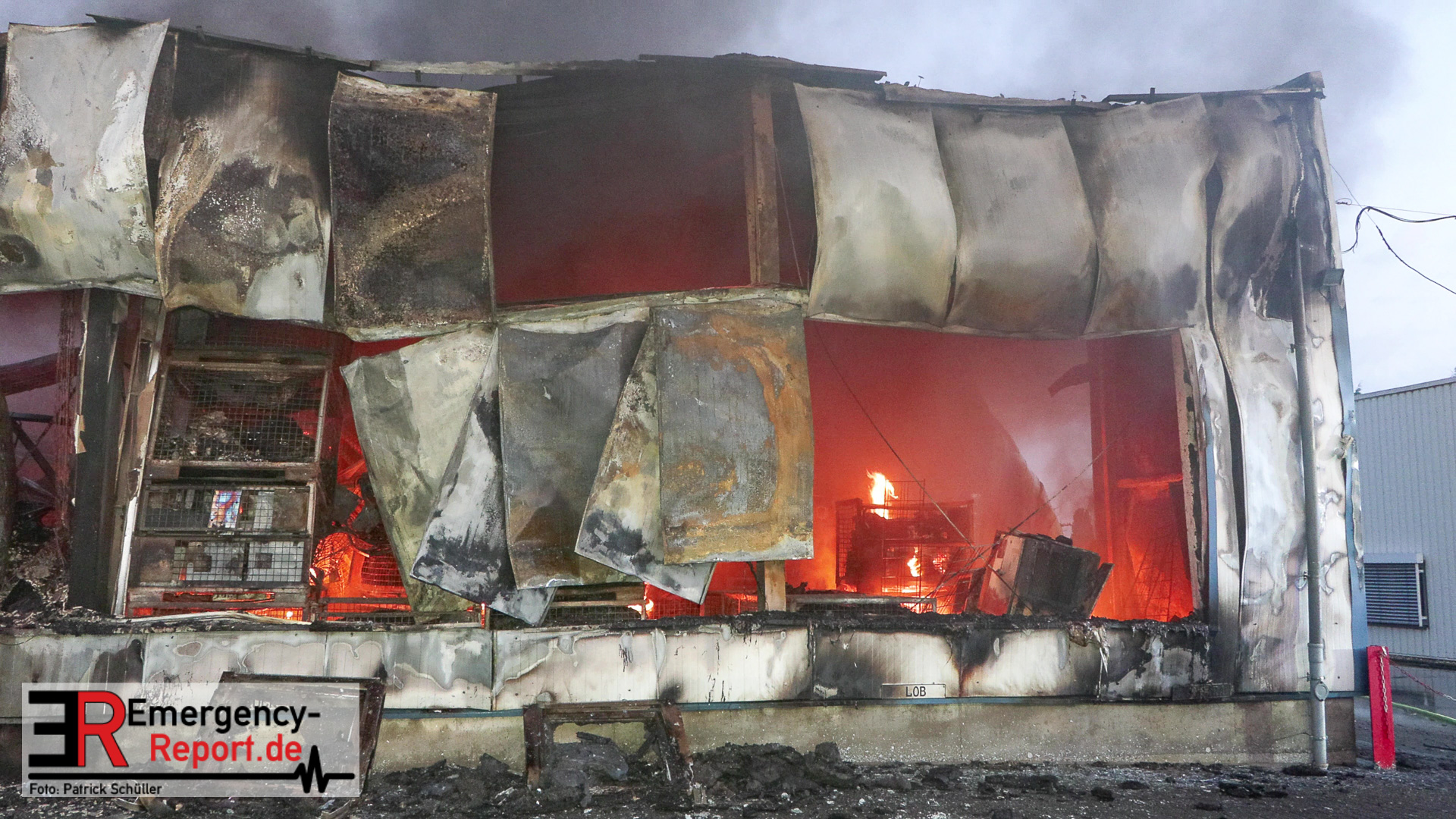 Bei der betroffenen Halle handelt es sich um den Firmensitz von drei Firmen. Diese wurde bereits durch die massive Brandausbreitung massiv in Mitleidenschaft gezogen und die darin gelagerten Materialien (Kunststoffgranulat und Lacke) sorgten für eine weithin sichtbare und wahrnehmbare Rauchwolke.