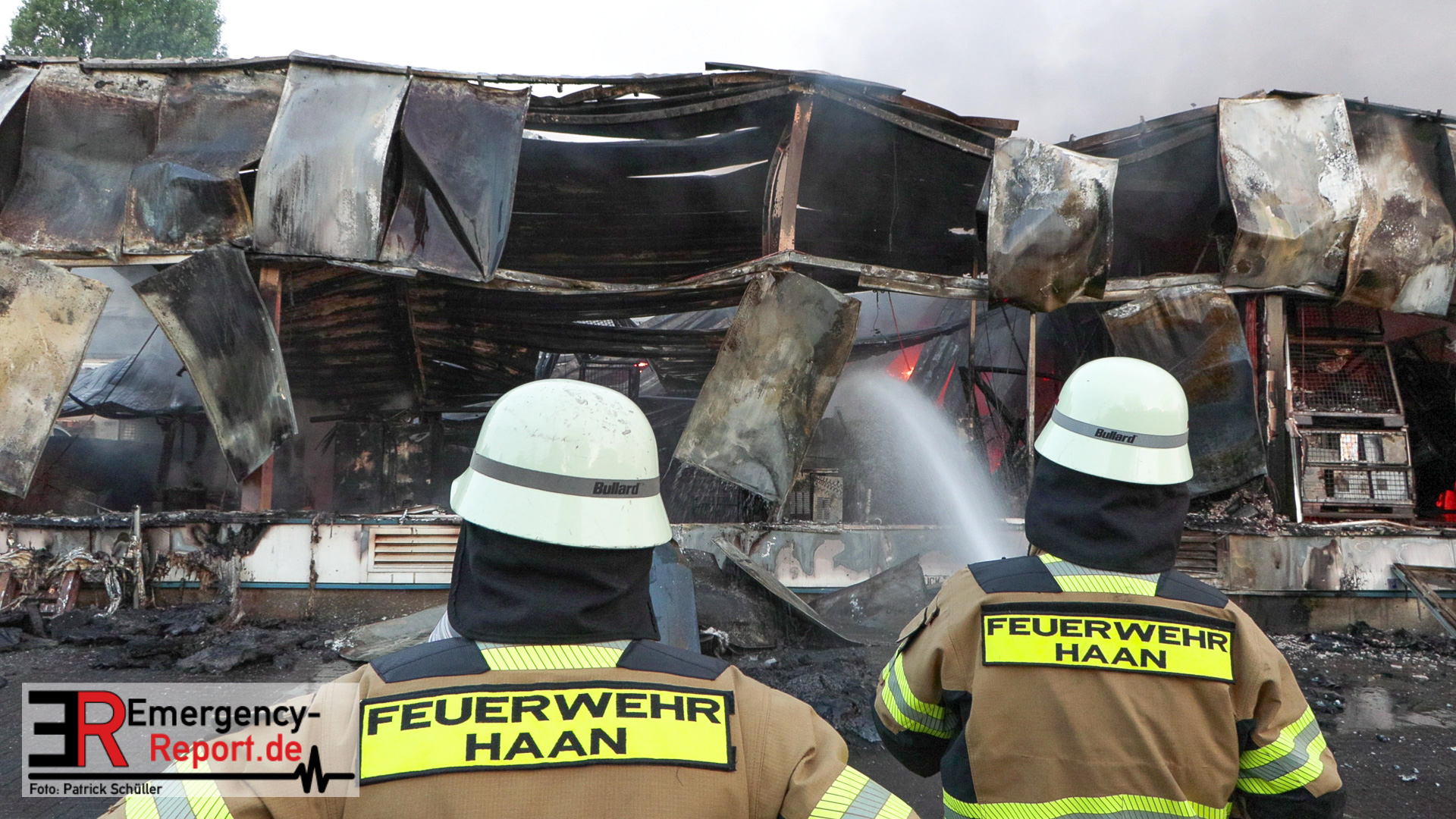 Zurzeit befinden sich immer noch rund 100 Kräfte der Feuerwehr Haan zusammen mit den Feuerwehren Erkrath, Hilden, Mettmann, Ratingen und Velbert sowie dem DRK Ortsverband Haan immer noch im Einsatz. Die Löscharbeiten im inneren der Halle gestalten sich aufgrund einer möglichen Einsturzgefahr schwierig. Daher werden primär über eine Riegelstellung nicht betroffene Bereiche gesichert. Ein Ende der Löscharbeiten ist noch nicht absehbar, werden aber mindestens noch bis über den Mittag hinaus andauern. Daher werden diese nach und nach durch frische Kräfte ausgetauscht.