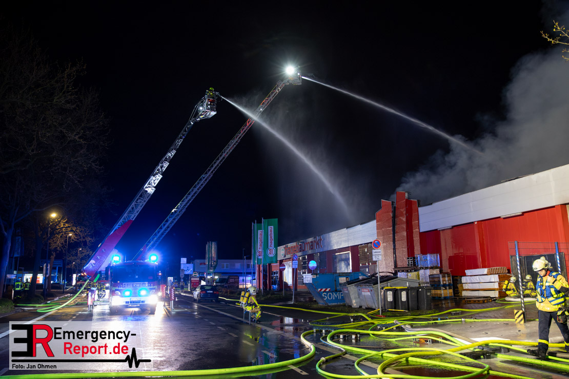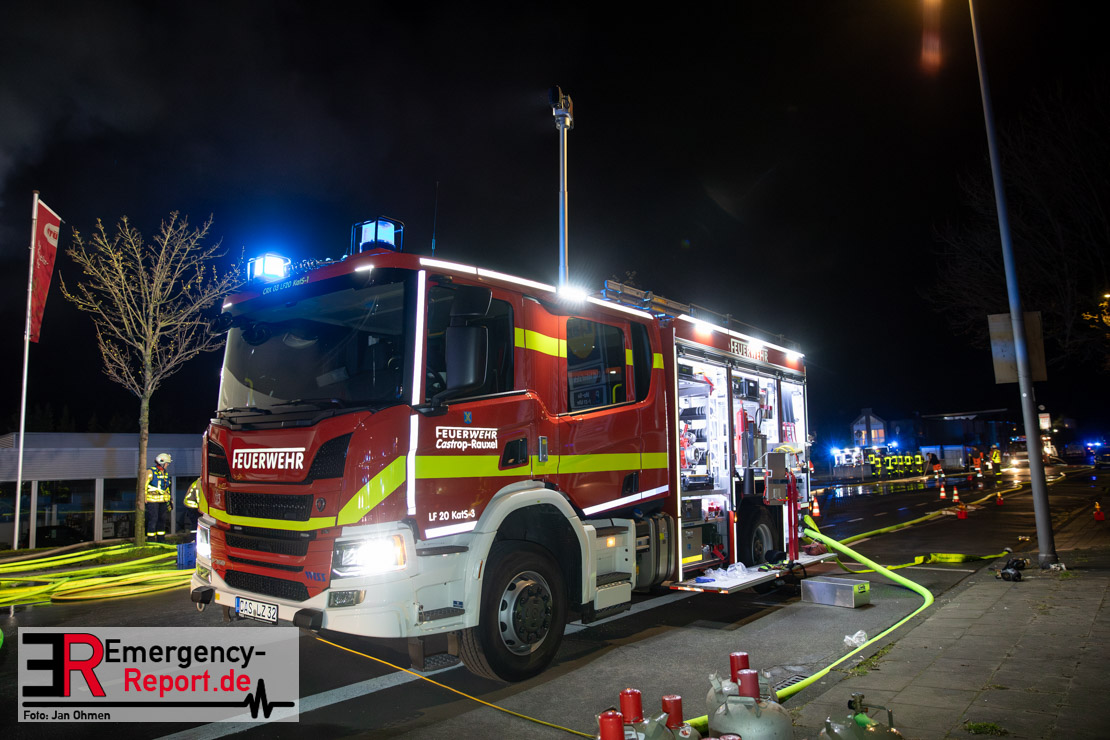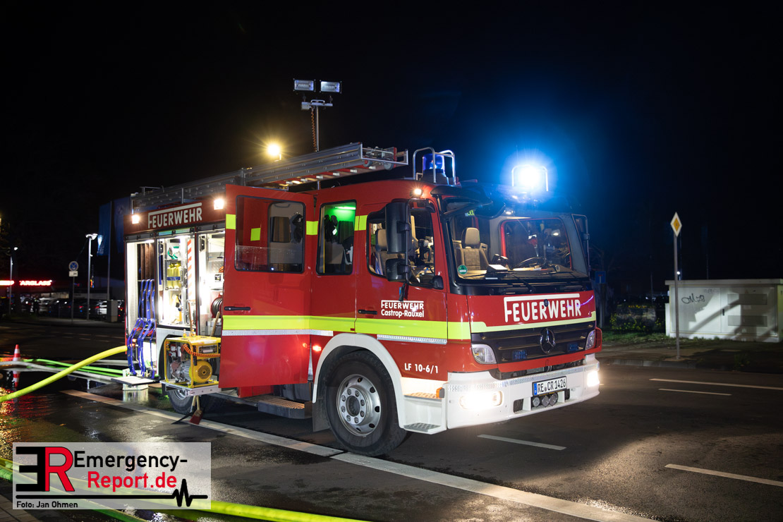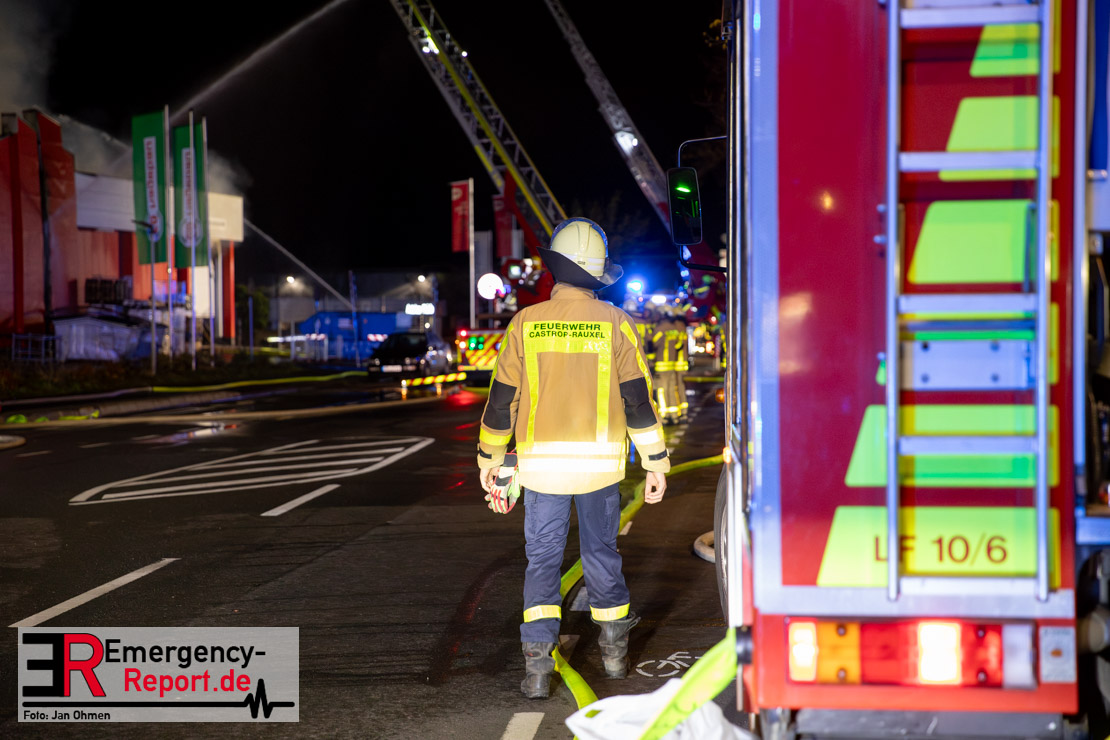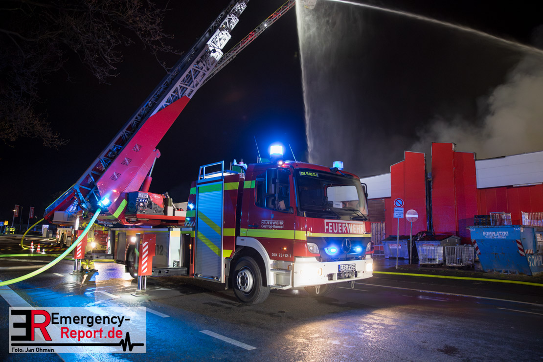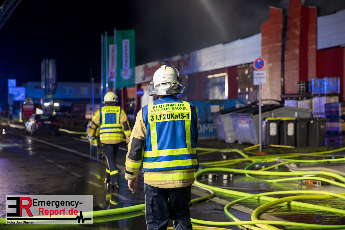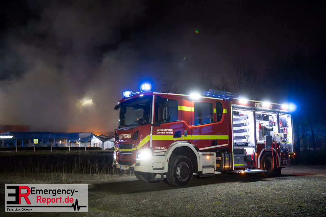 Am Dienstagabend (26.03.2024), kurz vor 19:30 Uhr, wurde die Feuerwehr zu einem Brandereignis in einem Baumarkt am Westring im Ortsteil Behringhausen alarmiert. Bereits auf der Anfahrt deutete eine massive Rauchwolke auf ein Brandereignis hin. Bei Eintreffen der ersten Einsatzkräfte stand ein Teil das Außenlagers, sowie ein Teil der Dachhaut in Flammen. Die Flammen schlugen zu diesem Zeitpunkt durch geplatzte Fensterscheiben in den Verkaufsraum über. Umgehend wurde das Einsatzstichwort auf F5 erhöht, wodurch alle ehrenamtlichen fünf Löschzüge der Feuerwehr Castrop-Rauxel alarmiert wurden. Da die Öffnungszeit des Baumarktes um 19:00 Uhr endete und aufgrund der verschlossenen Verkaufsräume alles darauf hindeutete, dass sich keine Personen mehr im Gebäude befanden, wurde ein massiver Löschangriff von außen gestartet. Zwei direkt angrenzende Gewerbebetriebe inklusive einem 5.000l Heizöltank wurden umgehend gekühlt und gesichert. Weiterhin wurden eine Vielzahl von im Außenlager stehenden Propangasflaschen in Sicherheit gebracht. Aufgrund der hohen Brandlasten im Baumarkt, in Verbindung mit explodierenden Spraydosen und Gaskartuschen, war eine Brandausbreitung auf den kompletten Verkaufsbereich nicht aufzuhalten. Zur Unterstützung das Außenangriffes wurden noch zwei Drehleitern aus Dortmund und Herne für einen gezielten Löschangriff von oben angefordert. Aufgrund des massiven Brandrauch, welcher sich in Richtung Herne ausbreitete, wurde der Messzug des Kreises Recklinghausen alarmiert, welcher Luftanalysen und Niederschlagsproben auswertete. Ein Hygienefahrzeug, sowie ein Atemschutzgerätefahrzeug wurden weiterhin angefordert, um so bestehende Schutzkonzepte für die Einsatzkräfte sicherstellen zu können. Ein Löschzug der Feuerwehr Recklinghausen Suderwich übernahm den Grundschutz der Stadt und wurde an der Hauptwache der Feuerwehr Castrop stationiert. Der Brand konnte weitestgehend in die frühen Morgenstunden des Mittwochs gelöscht werden. Da das Gebäude als einsturzgefährdet eingestuft wurde und der Verkaufsraum nicht mehr betreten werden konnte, flammten Glutnester bis zum Donnerstagabend immer wieder auf, da sie nicht gezielt abgelöscht werden konnten. Für die Nachlöscharbeiten wurden die Einsatzkräfte am Mittwoch morgen von ehrenamtlichen Kräften der Feuerwehr Datteln, sowie einem Ausbildungslehrgang der Hauptwache Castrop unterstützt. Auch das THW unterstützte die Kollegen vor Ort mit einem Bagger, welche unter anderem schwelende Paletten mit gepressten Holzbriketts aus dem Warenlager zog, so dass diese außerhalb des Gefahrenbereiches endgültig abgelöscht werden konnten. Bis zum Freitag folgten regelmäßige Einsätze mit Nachlöscharbeiten, welche dann wieder von den ehrenamtlichen Kräften der Castroper Löschzüge übernommen wurden. Auf ein massiven Schaumangriff zum Ablöschen der Glutnester wurde in Abstimmung mit der Emschergenossenschaft verzichtet, da die Gefahr bestand, dass das auflegen eines Schaumteppiches in den benachbarten renaturierten Landwehrbach abfließen könnte.