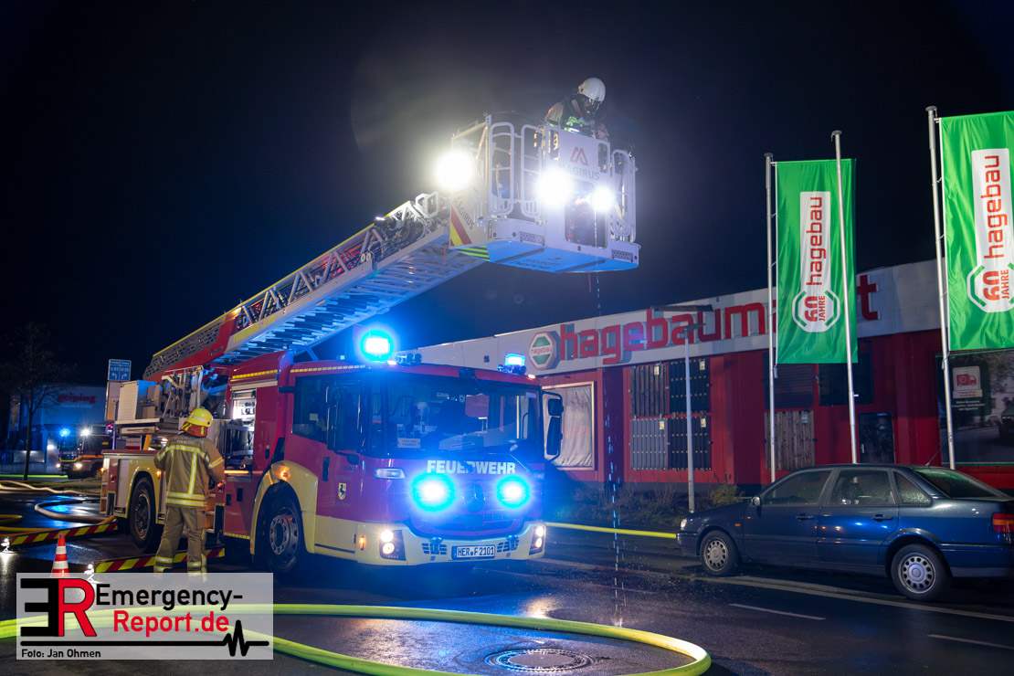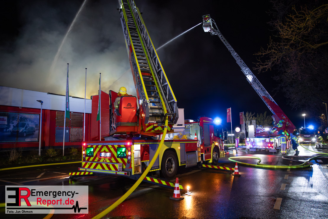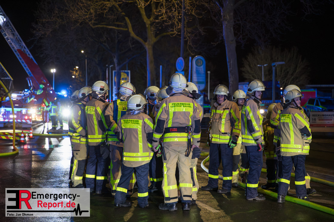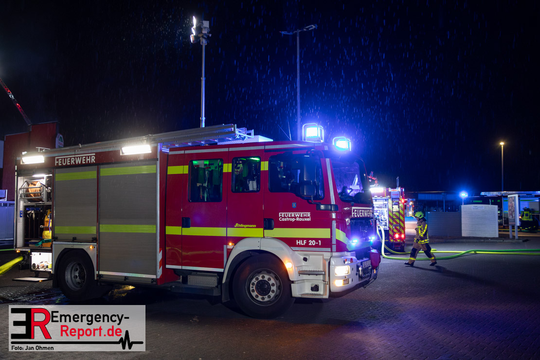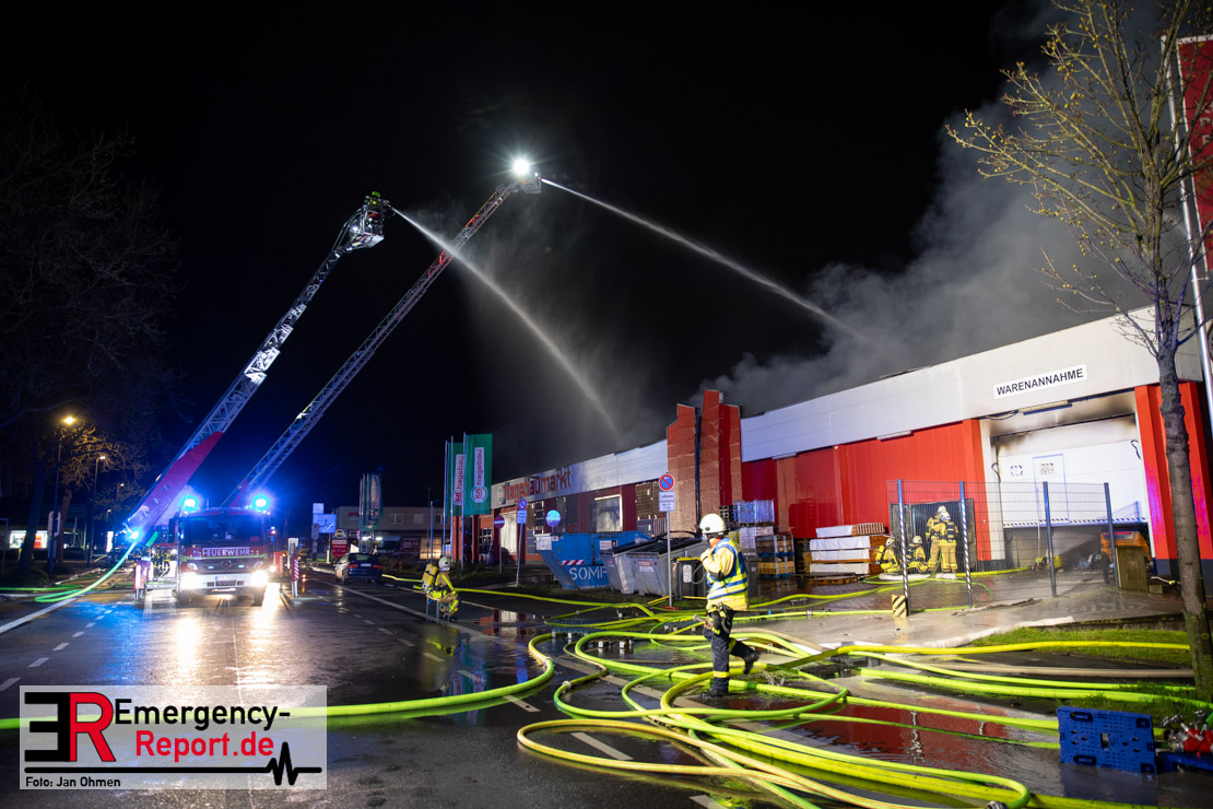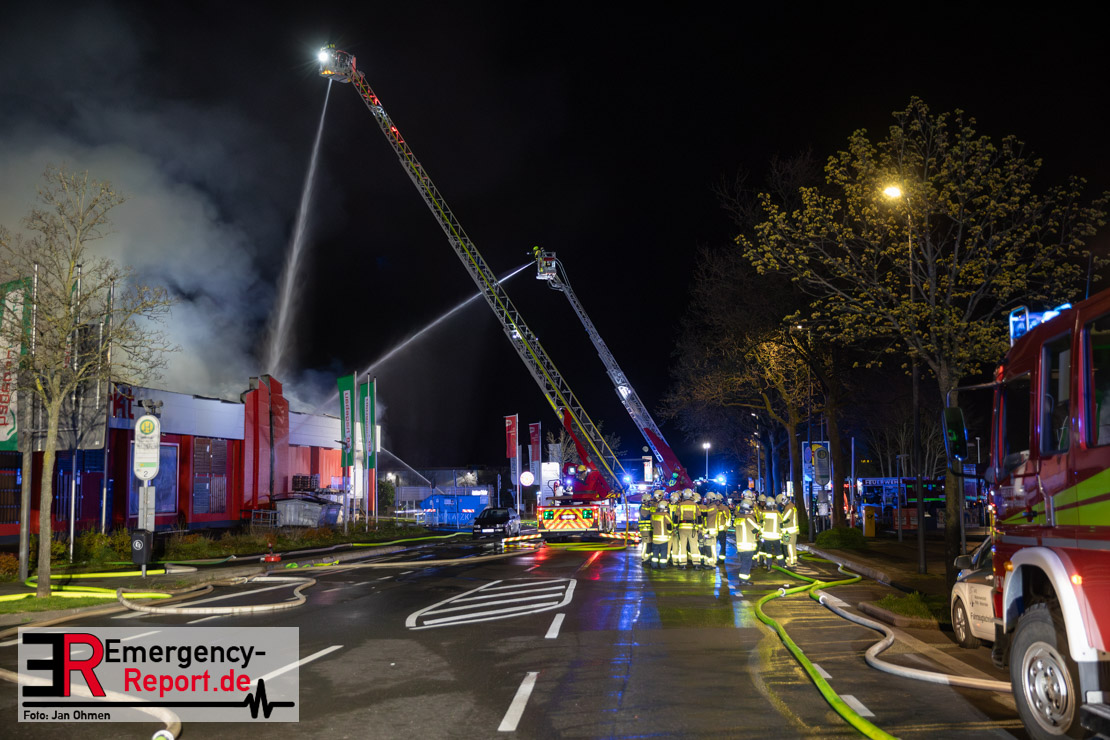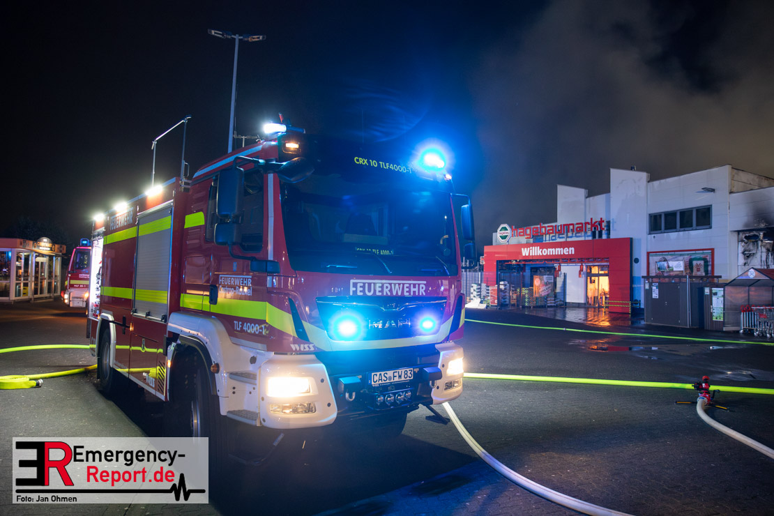 Am Dienstagabend (26.03.2024), kurz vor 19:30 Uhr, wurde die Feuerwehr zu einem Brandereignis in einem Baumarkt am Westring im Ortsteil Behringhausen alarmiert. Bereits auf der Anfahrt deutete eine massive Rauchwolke auf ein Brandereignis hin. Bei Eintreffen der ersten Einsatzkräfte stand ein Teil das Außenlagers, sowie ein Teil der Dachhaut in Flammen. Die Flammen schlugen zu diesem Zeitpunkt durch geplatzte Fensterscheiben in den Verkaufsraum über. Umgehend wurde das Einsatzstichwort auf F5 erhöht, wodurch alle ehrenamtlichen fünf Löschzüge der Feuerwehr Castrop-Rauxel alarmiert wurden. Da die Öffnungszeit des Baumarktes um 19:00 Uhr endete und aufgrund der verschlossenen Verkaufsräume alles darauf hindeutete, dass sich keine Personen mehr im Gebäude befanden, wurde ein massiver Löschangriff von außen gestartet. Zwei direkt angrenzende Gewerbebetriebe inklusive einem 5.000l Heizöltank wurden umgehend gekühlt und gesichert. Weiterhin wurden eine Vielzahl von im Außenlager stehenden Propangasflaschen in Sicherheit gebracht. Aufgrund der hohen Brandlasten im Baumarkt, in Verbindung mit explodierenden Spraydosen und Gaskartuschen, war eine Brandausbreitung auf den kompletten Verkaufsbereich nicht aufzuhalten. Zur Unterstützung das Außenangriffes wurden noch zwei Drehleitern aus Dortmund und Herne für einen gezielten Löschangriff von oben angefordert. Aufgrund des massiven Brandrauch, welcher sich in Richtung Herne ausbreitete, wurde der Messzug des Kreises Recklinghausen alarmiert, welcher Luftanalysen und Niederschlagsproben auswertete. Ein Hygienefahrzeug, sowie ein Atemschutzgerätefahrzeug wurden weiterhin angefordert, um so bestehende Schutzkonzepte für die Einsatzkräfte sicherstellen zu können. Ein Löschzug der Feuerwehr Recklinghausen Suderwich übernahm den Grundschutz der Stadt und wurde an der Hauptwache der Feuerwehr Castrop stationiert. Der Brand konnte weitestgehend in die frühen Morgenstunden des Mittwochs gelöscht werden. Da das Gebäude als einsturzgefährdet eingestuft wurde und der Verkaufsraum nicht mehr betreten werden konnte, flammten Glutnester bis zum Donnerstagabend immer wieder auf, da sie nicht gezielt abgelöscht werden konnten. Für die Nachlöscharbeiten wurden die Einsatzkräfte am Mittwoch morgen von ehrenamtlichen Kräften der Feuerwehr Datteln, sowie einem Ausbildungslehrgang der Hauptwache Castrop unterstützt. Auch das THW unterstützte die Kollegen vor Ort mit einem Bagger, welche unter anderem schwelende Paletten mit gepressten Holzbriketts aus dem Warenlager zog, so dass diese außerhalb des Gefahrenbereiches endgültig abgelöscht werden konnten. Bis zum Freitag folgten regelmäßige Einsätze mit Nachlöscharbeiten, welche dann wieder von den ehrenamtlichen Kräften der Castroper Löschzüge übernommen wurden. Auf ein massiven Schaumangriff zum Ablöschen der Glutnester wurde in Abstimmung mit der Emschergenossenschaft verzichtet, da die Gefahr bestand, dass das auflegen eines Schaumteppiches in den benachbarten renaturierten Landwehrbach abfließen könnte.
