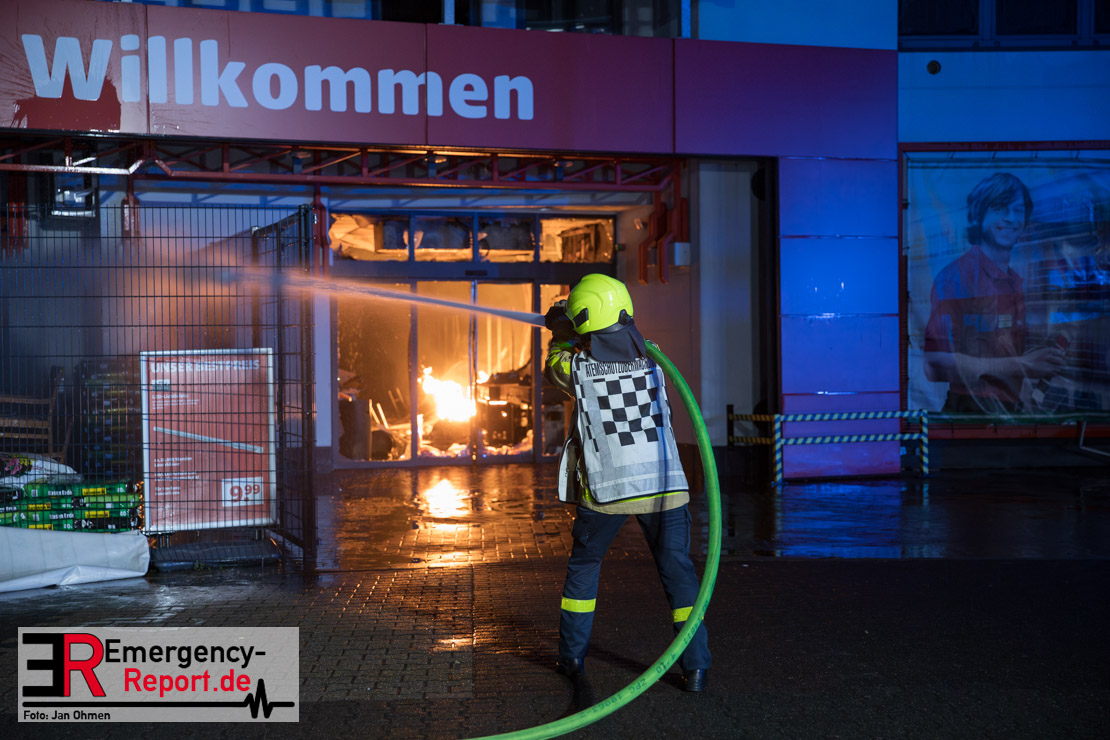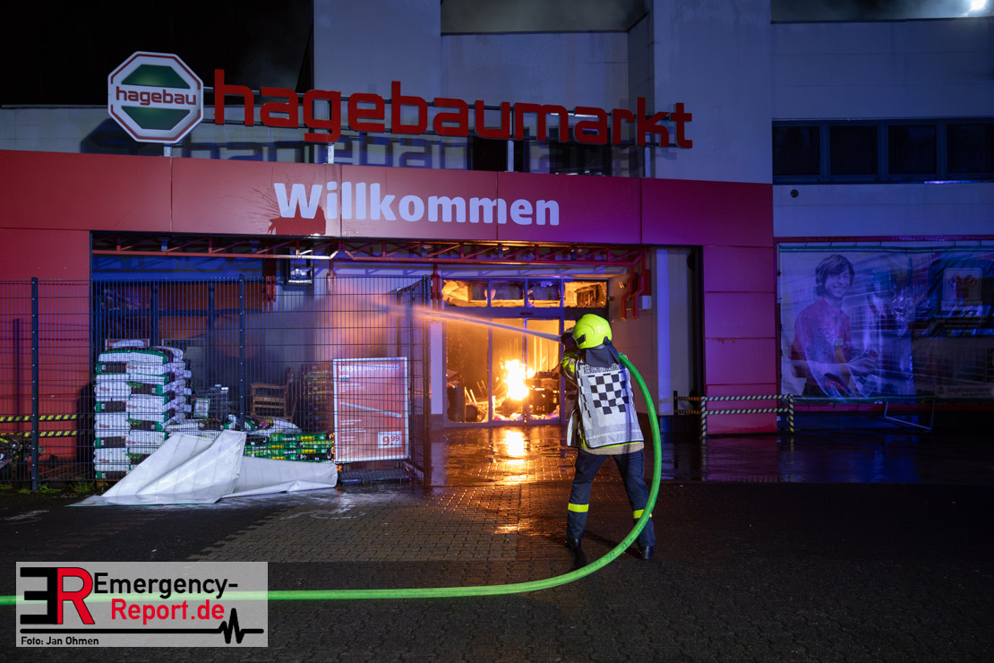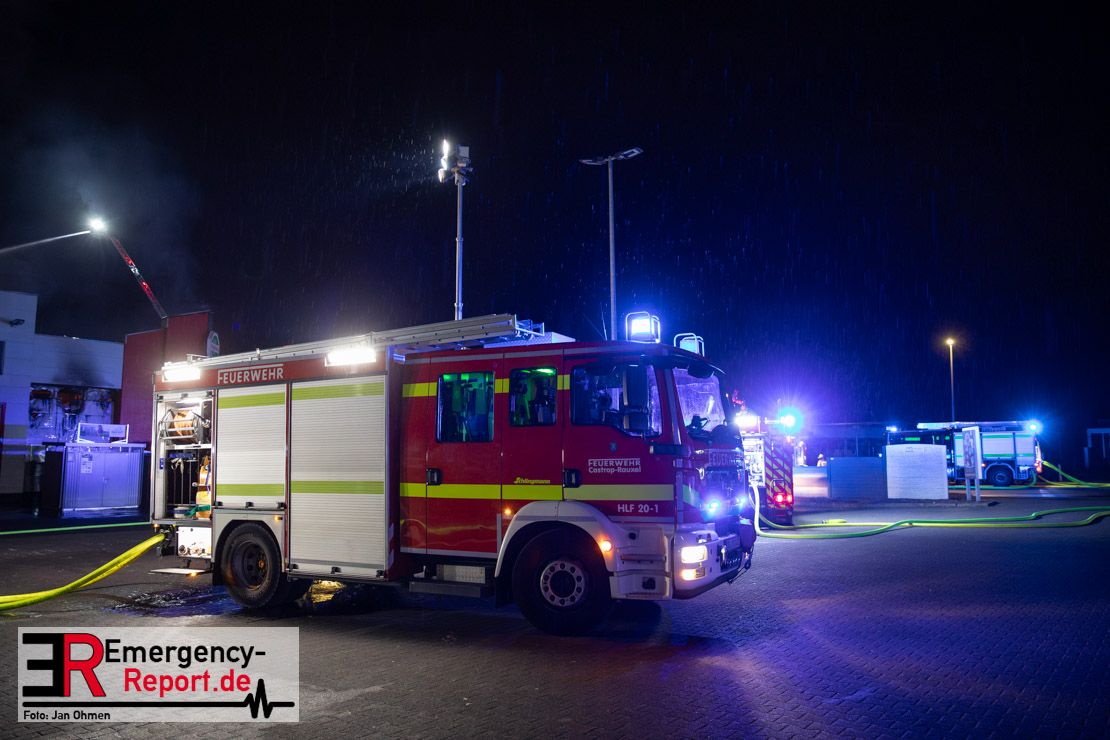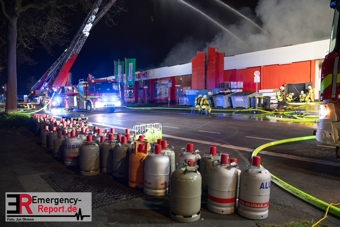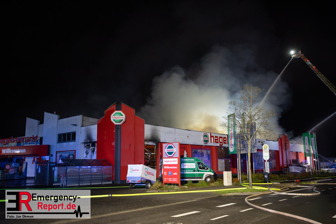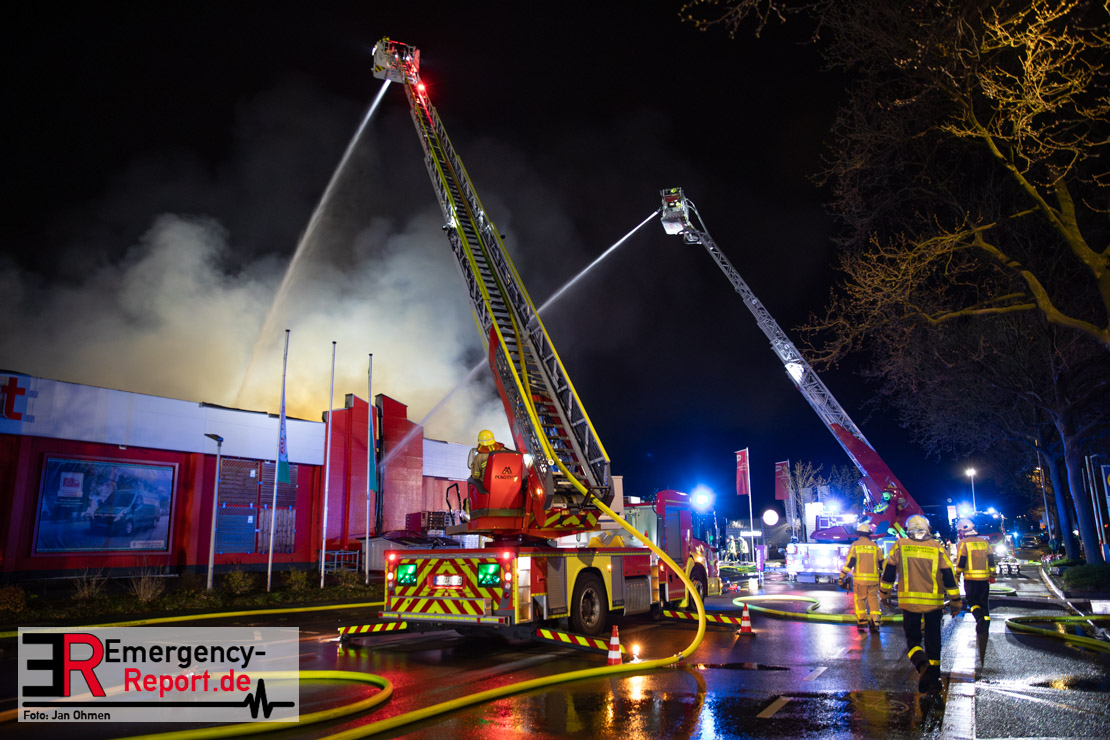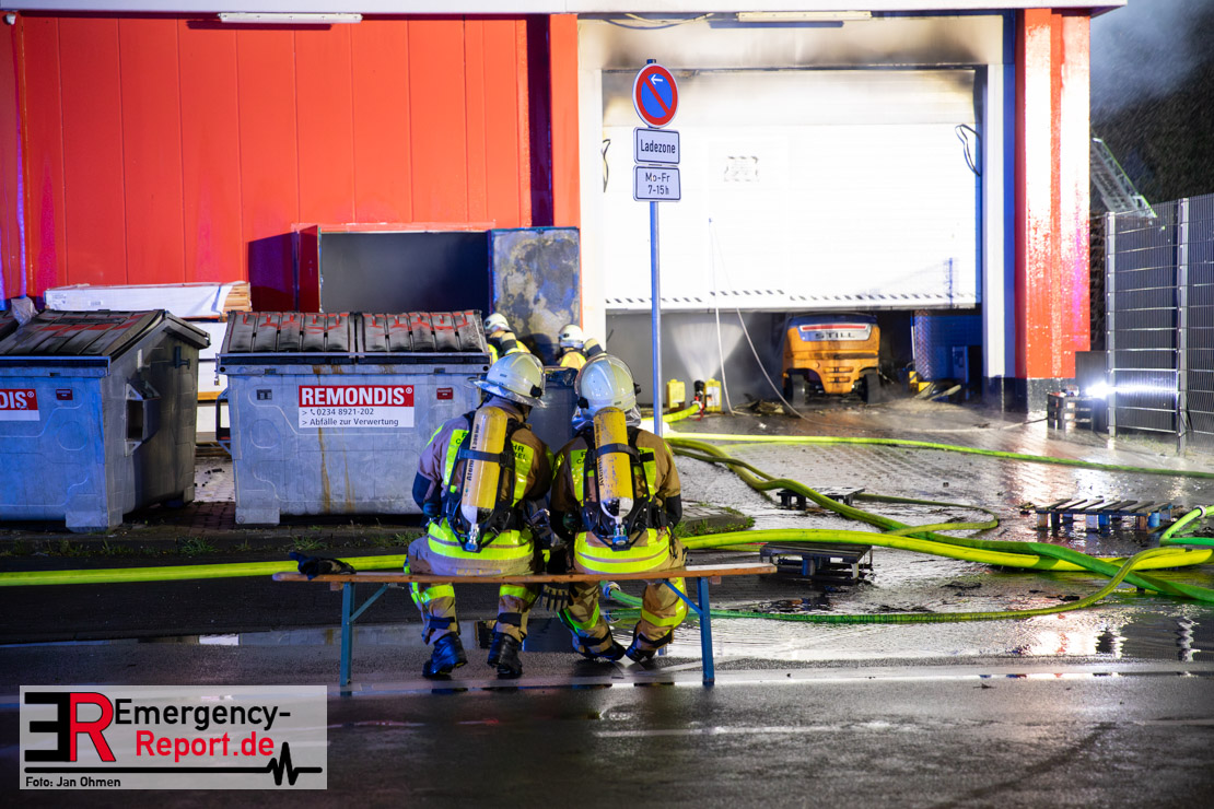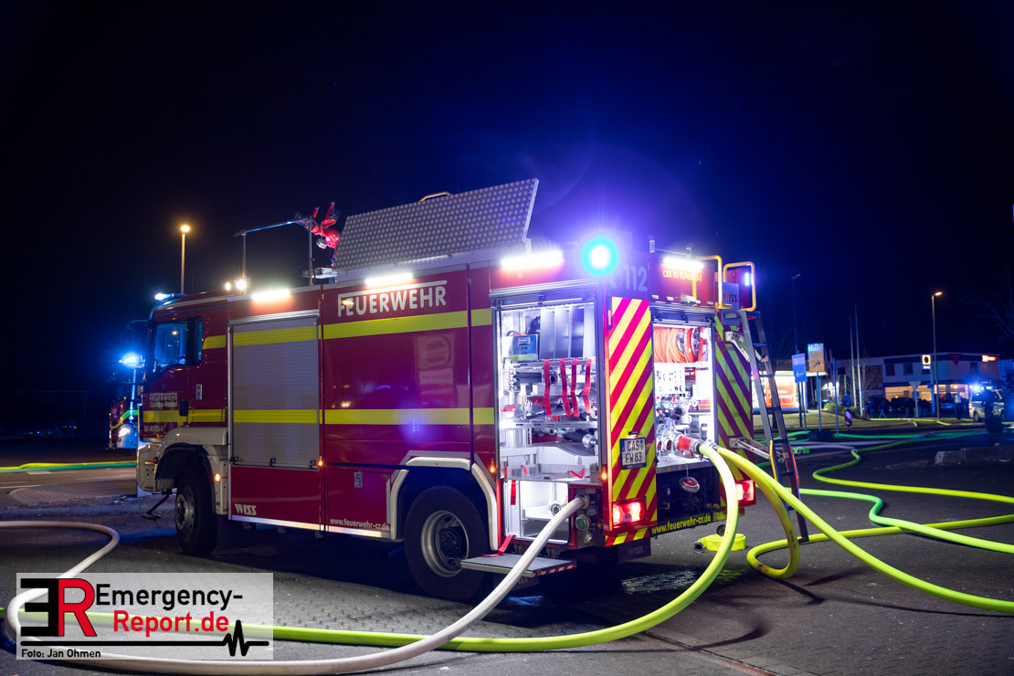 Am Dienstagabend (26.03.2024), kurz vor 19:30 Uhr, wurde die Feuerwehr zu einem Brandereignis in einem Baumarkt am Westring im Ortsteil Behringhausen alarmiert. Bereits auf der Anfahrt deutete eine massive Rauchwolke auf ein Brandereignis hin. Bei Eintreffen der ersten Einsatzkräfte stand ein Teil das Außenlagers, sowie ein Teil der Dachhaut in Flammen. Die Flammen schlugen zu diesem Zeitpunkt durch geplatzte Fensterscheiben in den Verkaufsraum über. Umgehend wurde das Einsatzstichwort auf F5 erhöht, wodurch alle ehrenamtlichen fünf Löschzüge der Feuerwehr Castrop-Rauxel alarmiert wurden. Da die Öffnungszeit des Baumarktes um 19:00 Uhr endete und aufgrund der verschlossenen Verkaufsräume alles darauf hindeutete, dass sich keine Personen mehr im Gebäude befanden, wurde ein massiver Löschangriff von außen gestartet. Zwei direkt angrenzende Gewerbebetriebe inklusive einem 5.000l Heizöltank wurden umgehend gekühlt und gesichert. Weiterhin wurden eine Vielzahl von im Außenlager stehenden Propangasflaschen in Sicherheit gebracht. Aufgrund der hohen Brandlasten im Baumarkt, in Verbindung mit explodierenden Spraydosen und Gaskartuschen, war eine Brandausbreitung auf den kompletten Verkaufsbereich nicht aufzuhalten. Zur Unterstützung das Außenangriffes wurden noch zwei Drehleitern aus Dortmund und Herne für einen gezielten Löschangriff von oben angefordert. Aufgrund des massiven Brandrauch, welcher sich in Richtung Herne ausbreitete, wurde der Messzug des Kreises Recklinghausen alarmiert, welcher Luftanalysen und Niederschlagsproben auswertete. Ein Hygienefahrzeug, sowie ein Atemschutzgerätefahrzeug wurden weiterhin angefordert, um so bestehende Schutzkonzepte für die Einsatzkräfte sicherstellen zu können. Ein Löschzug der Feuerwehr Recklinghausen Suderwich übernahm den Grundschutz der Stadt und wurde an der Hauptwache der Feuerwehr Castrop stationiert. Der Brand konnte weitestgehend in die frühen Morgenstunden des Mittwochs gelöscht werden. Da das Gebäude als einsturzgefährdet eingestuft wurde und der Verkaufsraum nicht mehr betreten werden konnte, flammten Glutnester bis zum Donnerstagabend immer wieder auf, da sie nicht gezielt abgelöscht werden konnten. Für die Nachlöscharbeiten wurden die Einsatzkräfte am Mittwoch morgen von ehrenamtlichen Kräften der Feuerwehr Datteln, sowie einem Ausbildungslehrgang der Hauptwache Castrop unterstützt. Auch das THW unterstützte die Kollegen vor Ort mit einem Bagger, welche unter anderem schwelende Paletten mit gepressten Holzbriketts aus dem Warenlager zog, so dass diese außerhalb des Gefahrenbereiches endgültig abgelöscht werden konnten. Bis zum Freitag folgten regelmäßige Einsätze mit Nachlöscharbeiten, welche dann wieder von den ehrenamtlichen Kräften der Castroper Löschzüge übernommen wurden. Auf ein massiven Schaumangriff zum Ablöschen der Glutnester wurde in Abstimmung mit der Emschergenossenschaft verzichtet, da die Gefahr bestand, dass das auflegen eines Schaumteppiches in den benachbarten renaturierten Landwehrbach abfließen könnte.