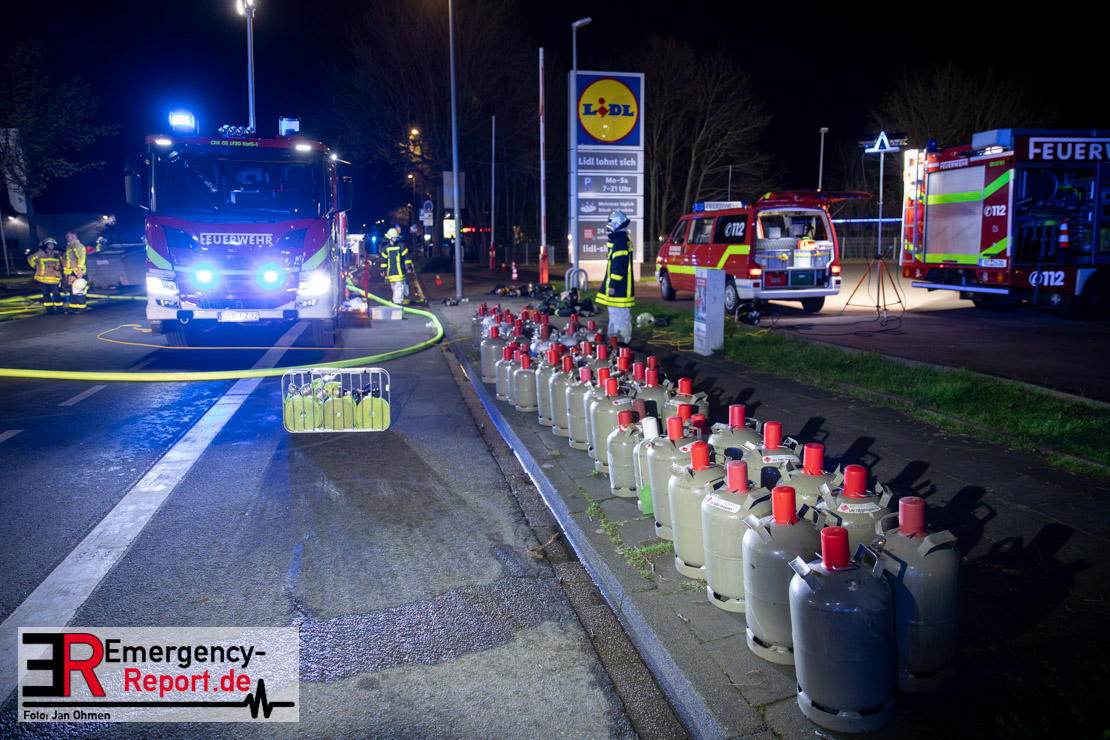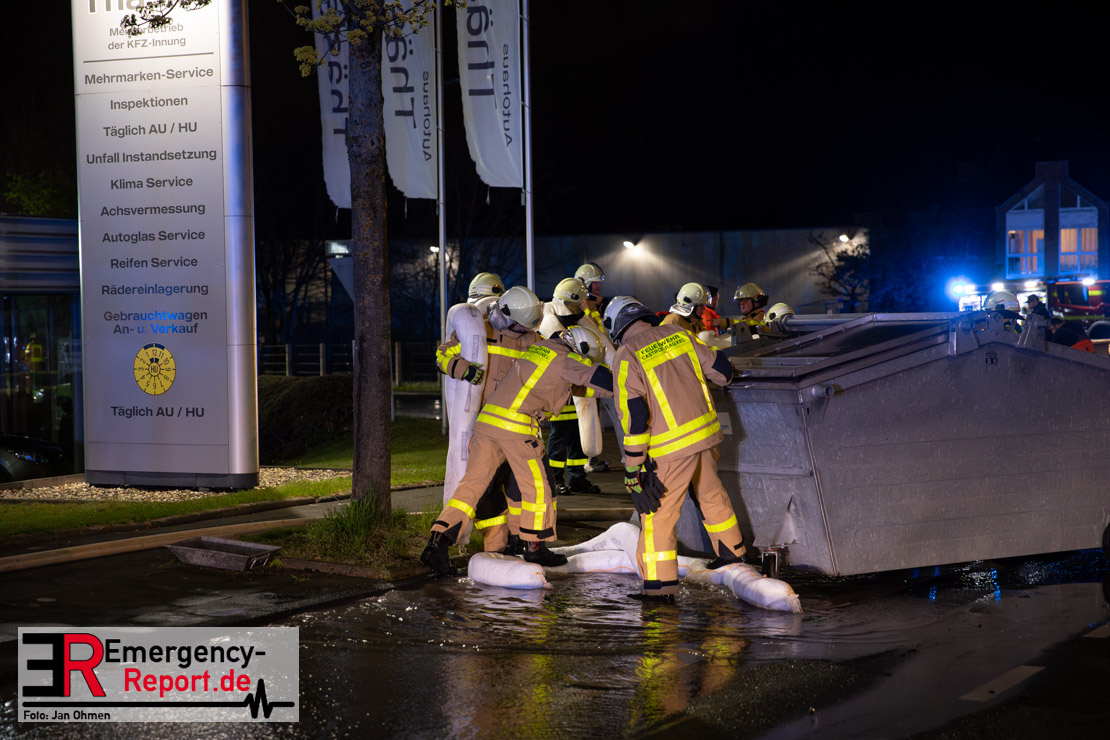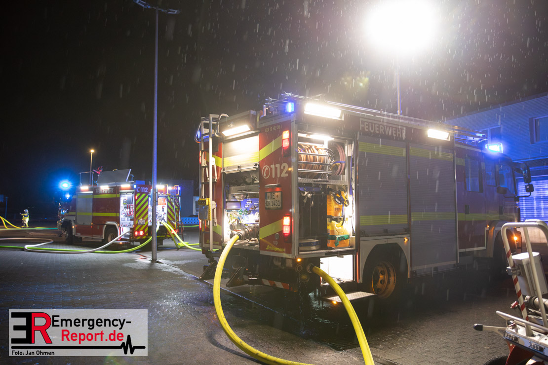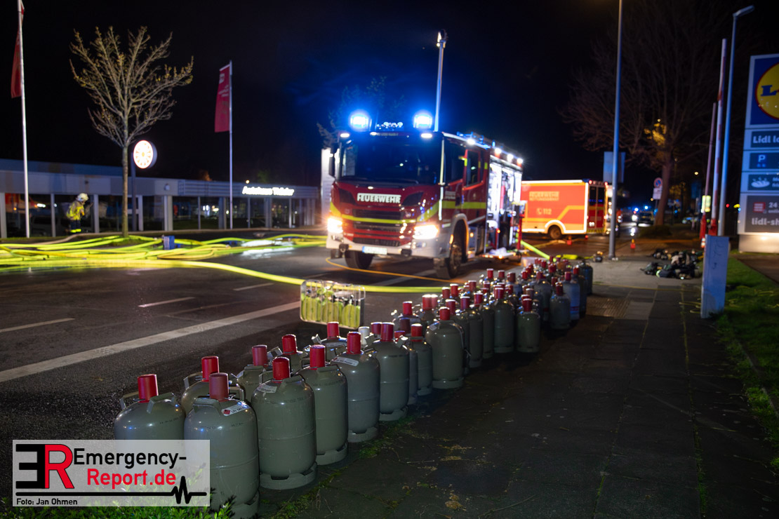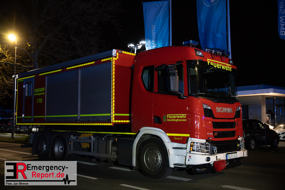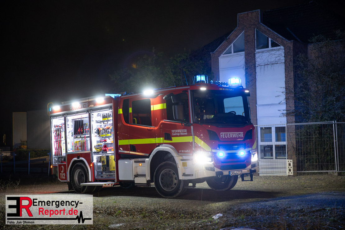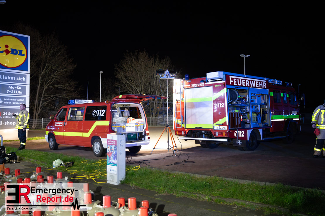 Am Dienstagabend (26.03.2024), kurz vor 19:30 Uhr, wurde die Feuerwehr zu einem Brandereignis in einem Baumarkt am Westring im Ortsteil Behringhausen alarmiert. Bereits auf der Anfahrt deutete eine massive Rauchwolke auf ein Brandereignis hin. Bei Eintreffen der ersten Einsatzkräfte stand ein Teil das Außenlagers, sowie ein Teil der Dachhaut in Flammen. Die Flammen schlugen zu diesem Zeitpunkt durch geplatzte Fensterscheiben in den Verkaufsraum über. Umgehend wurde das Einsatzstichwort auf F5 erhöht, wodurch alle ehrenamtlichen fünf Löschzüge der Feuerwehr Castrop-Rauxel alarmiert wurden. Da die Öffnungszeit des Baumarktes um 19:00 Uhr endete und aufgrund der verschlossenen Verkaufsräume alles darauf hindeutete, dass sich keine Personen mehr im Gebäude befanden, wurde ein massiver Löschangriff von außen gestartet. Zwei direkt angrenzende Gewerbebetriebe inklusive einem 5.000l Heizöltank wurden umgehend gekühlt und gesichert. Weiterhin wurden eine Vielzahl von im Außenlager stehenden Propangasflaschen in Sicherheit gebracht. Aufgrund der hohen Brandlasten im Baumarkt, in Verbindung mit explodierenden Spraydosen und Gaskartuschen, war eine Brandausbreitung auf den kompletten Verkaufsbereich nicht aufzuhalten. Zur Unterstützung das Außenangriffes wurden noch zwei Drehleitern aus Dortmund und Herne für einen gezielten Löschangriff von oben angefordert. Aufgrund des massiven Brandrauch, welcher sich in Richtung Herne ausbreitete, wurde der Messzug des Kreises Recklinghausen alarmiert, welcher Luftanalysen und Niederschlagsproben auswertete. Ein Hygienefahrzeug, sowie ein Atemschutzgerätefahrzeug wurden weiterhin angefordert, um so bestehende Schutzkonzepte für die Einsatzkräfte sicherstellen zu können. Ein Löschzug der Feuerwehr Recklinghausen Suderwich übernahm den Grundschutz der Stadt und wurde an der Hauptwache der Feuerwehr Castrop stationiert. Der Brand konnte weitestgehend in die frühen Morgenstunden des Mittwochs gelöscht werden. Da das Gebäude als einsturzgefährdet eingestuft wurde und der Verkaufsraum nicht mehr betreten werden konnte, flammten Glutnester bis zum Donnerstagabend immer wieder auf, da sie nicht gezielt abgelöscht werden konnten. Für die Nachlöscharbeiten wurden die Einsatzkräfte am Mittwoch morgen von ehrenamtlichen Kräften der Feuerwehr Datteln, sowie einem Ausbildungslehrgang der Hauptwache Castrop unterstützt. Auch das THW unterstützte die Kollegen vor Ort mit einem Bagger, welche unter anderem schwelende Paletten mit gepressten Holzbriketts aus dem Warenlager zog, so dass diese außerhalb des Gefahrenbereiches endgültig abgelöscht werden konnten. Bis zum Freitag folgten regelmäßige Einsätze mit Nachlöscharbeiten, welche dann wieder von den ehrenamtlichen Kräften der Castroper Löschzüge übernommen wurden. Auf ein massiven Schaumangriff zum Ablöschen der Glutnester wurde in Abstimmung mit der Emschergenossenschaft verzichtet, da die Gefahr bestand, dass das auflegen eines Schaumteppiches in den benachbarten renaturierten Landwehrbach abfließen könnte.