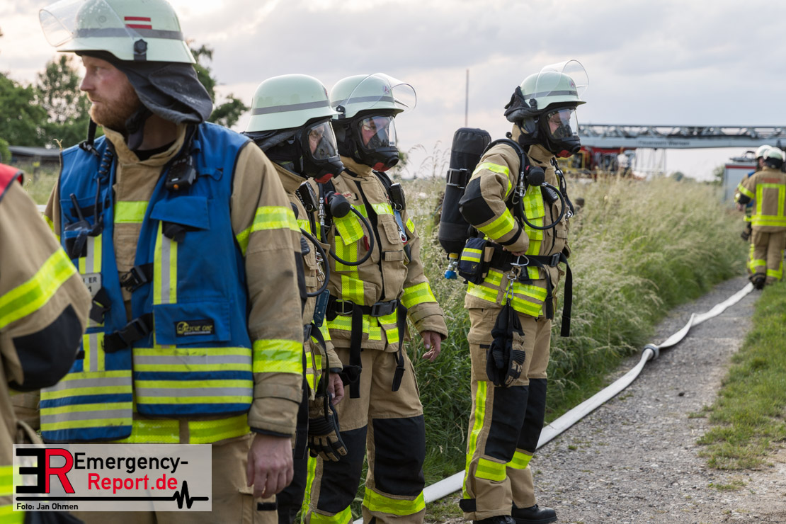 Die Feuerwehr konzentrierte sich zunächst darauf, mit einer sogenannten Riegelstellung das Wohnhaus vor einer Ausbreitung der Flammen zu