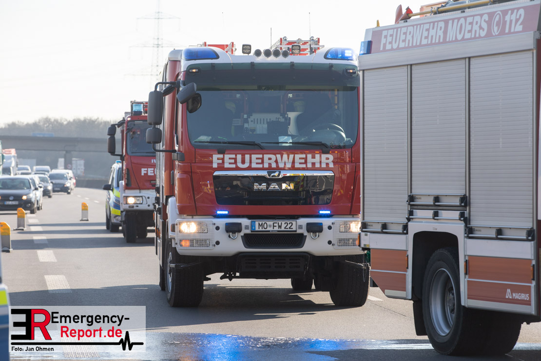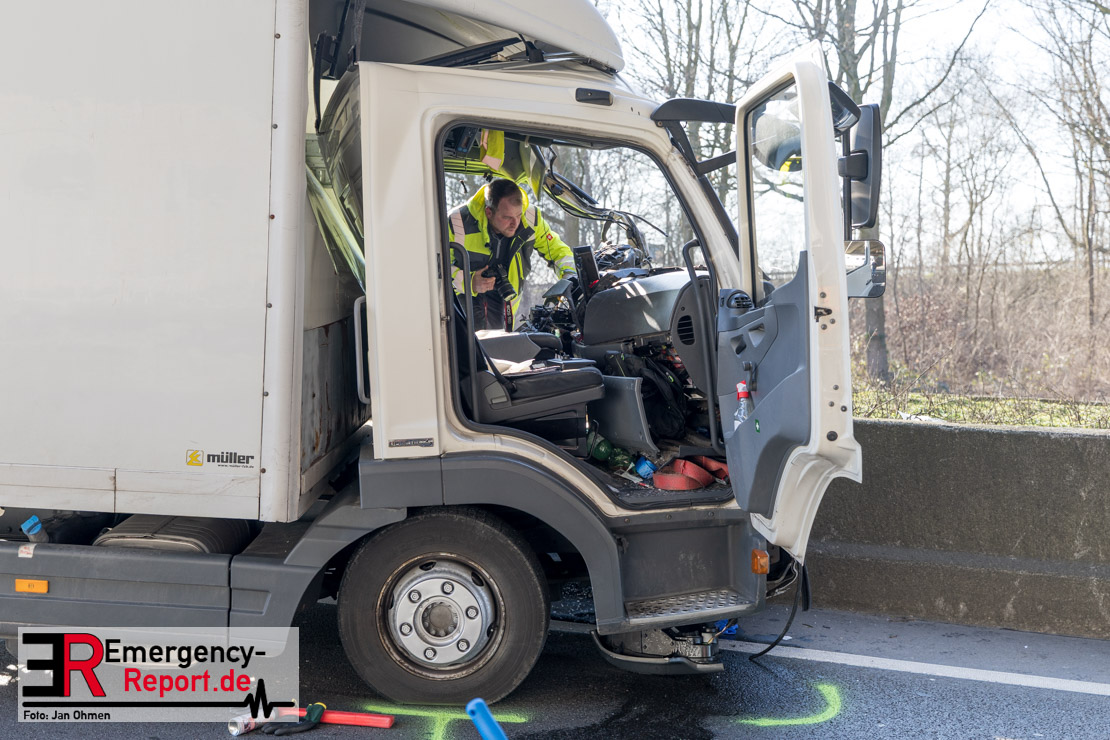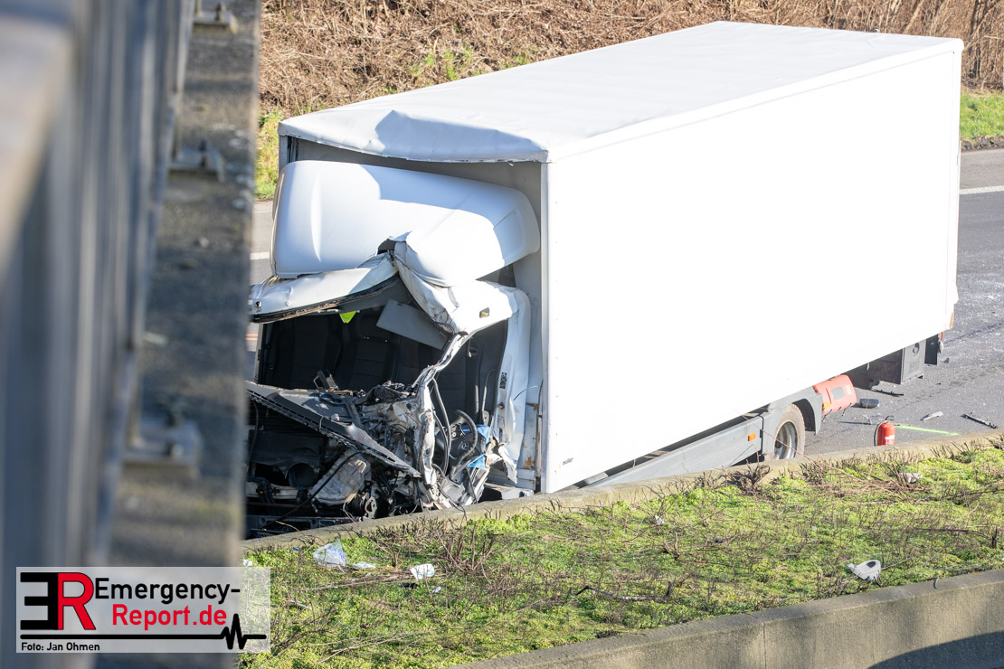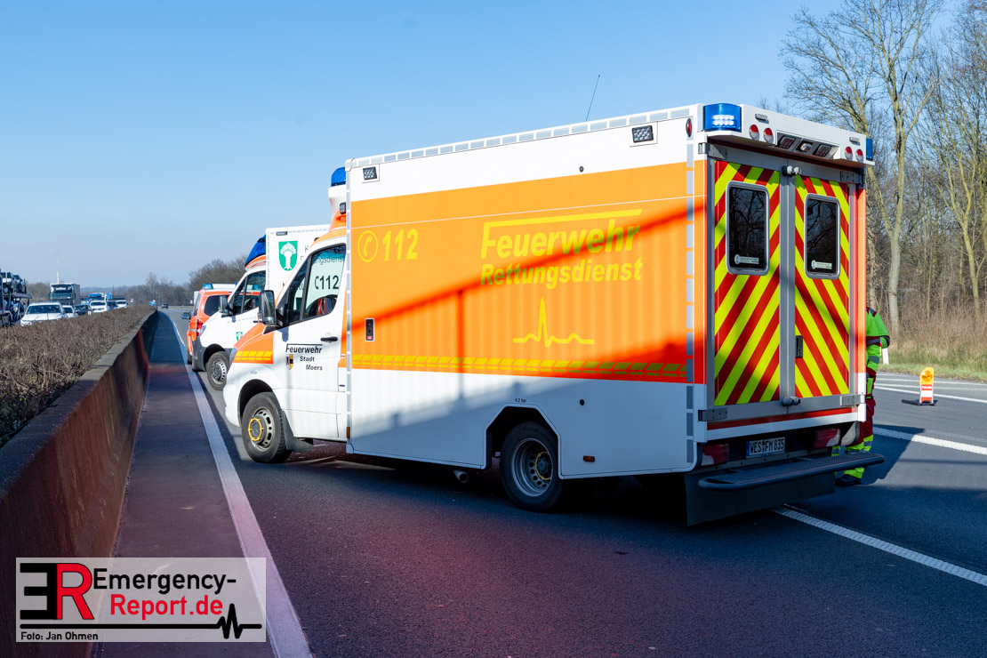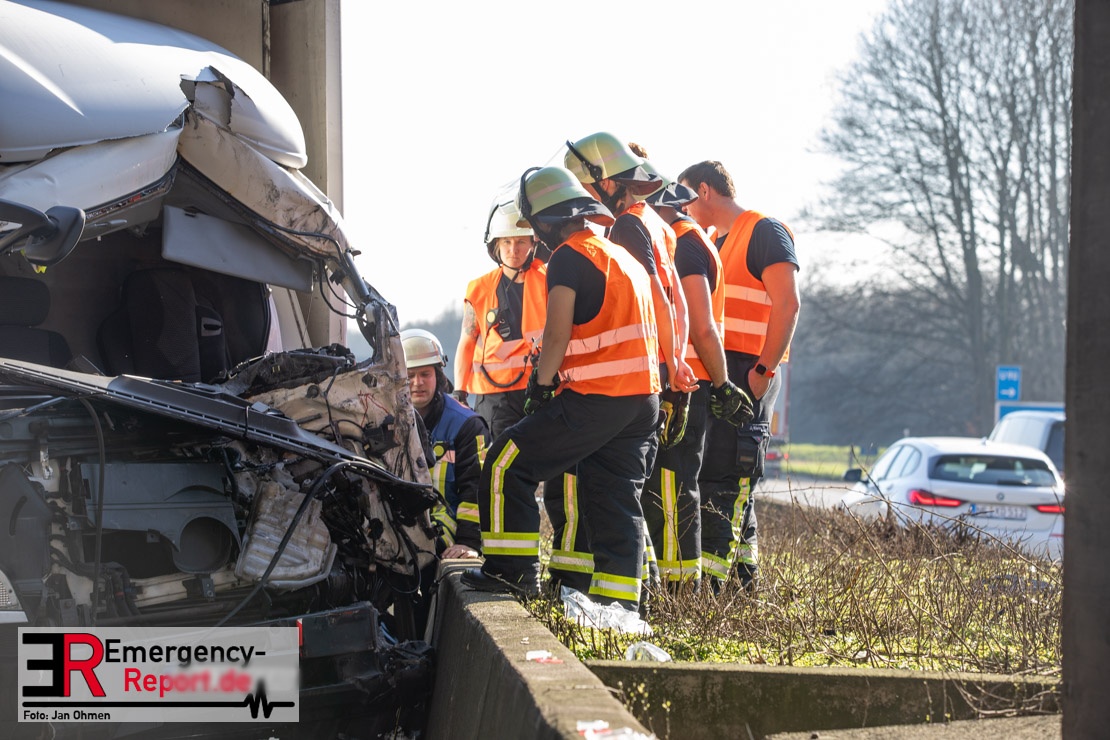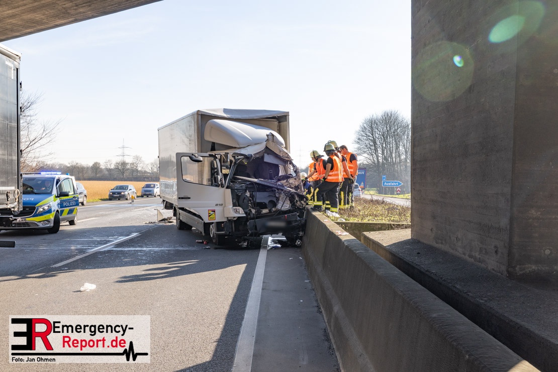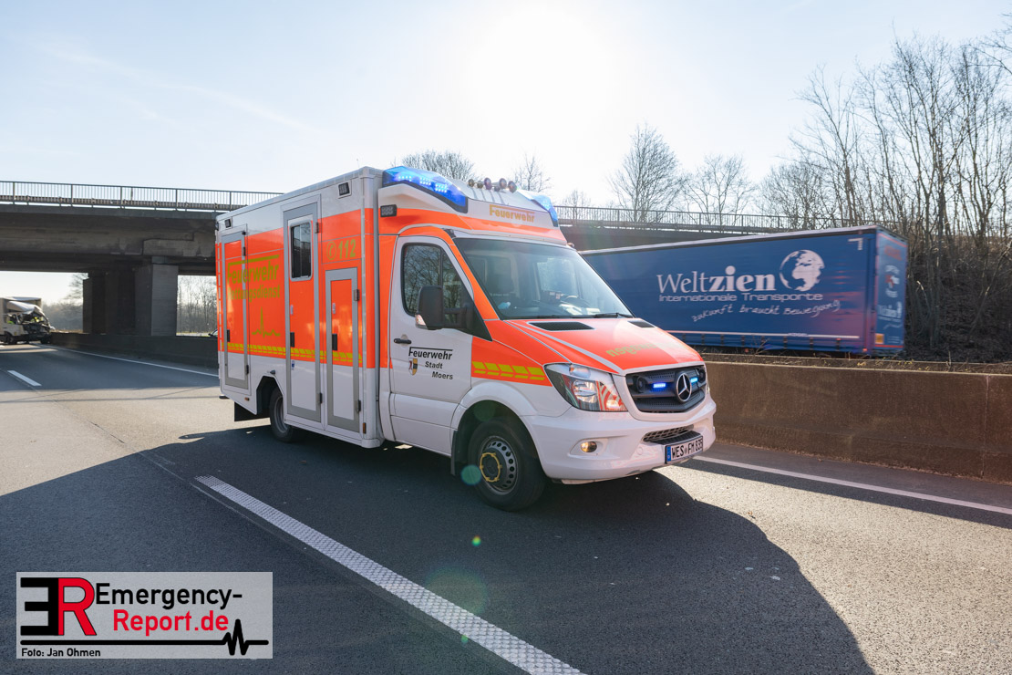 Nach ersten Erkenntnissen fuhr ein 26-jähriger Belarusse mit seinem Lkw auf dem rechten Fahrstreifen der A 57 in Fahrtrichtung Nimwegen. In Höhe von Moers-Hülsdonk musste der Fahrer verkehrsbedingt abbremsen. Aus bislang ungeklärter Ursache fuhr ein 50-jähriger Solinger mit seinem Lkw (7,5 t) auf den bremsenden Sattelzug auf. Er versuchte noch auszuweichen, schleuderte jedoch nach dem Aufprall links in die Betonschutzwand. Der Solinger wurde in seinem Fahrzeug eingeklemmt und musste von der Feuerwehr befreit werden. Ein Rettungshubschrauber brachte den lebensgefährlich verletzten Mann in ein Krankenhaus. Der Belarusse blieb unverletzt und konnte selbstständig mit seinem Lkw die Unfallstelle verlassen. Der Lkw des 50-Jährigen musste geborgen werden. Die Spezialisten des Verkehrsunfallaufnahmeteams übernahmen die Unfallaufnahme. Die Fahrbahn musste von 14:20 Uhr bis 19:30 Uhr voll gesperrt werden. Es kam zu erheblichen Verkehrsbeeinträchtigungen. Die Ermittlungen zur Unfallursache dauern an.