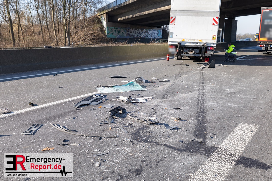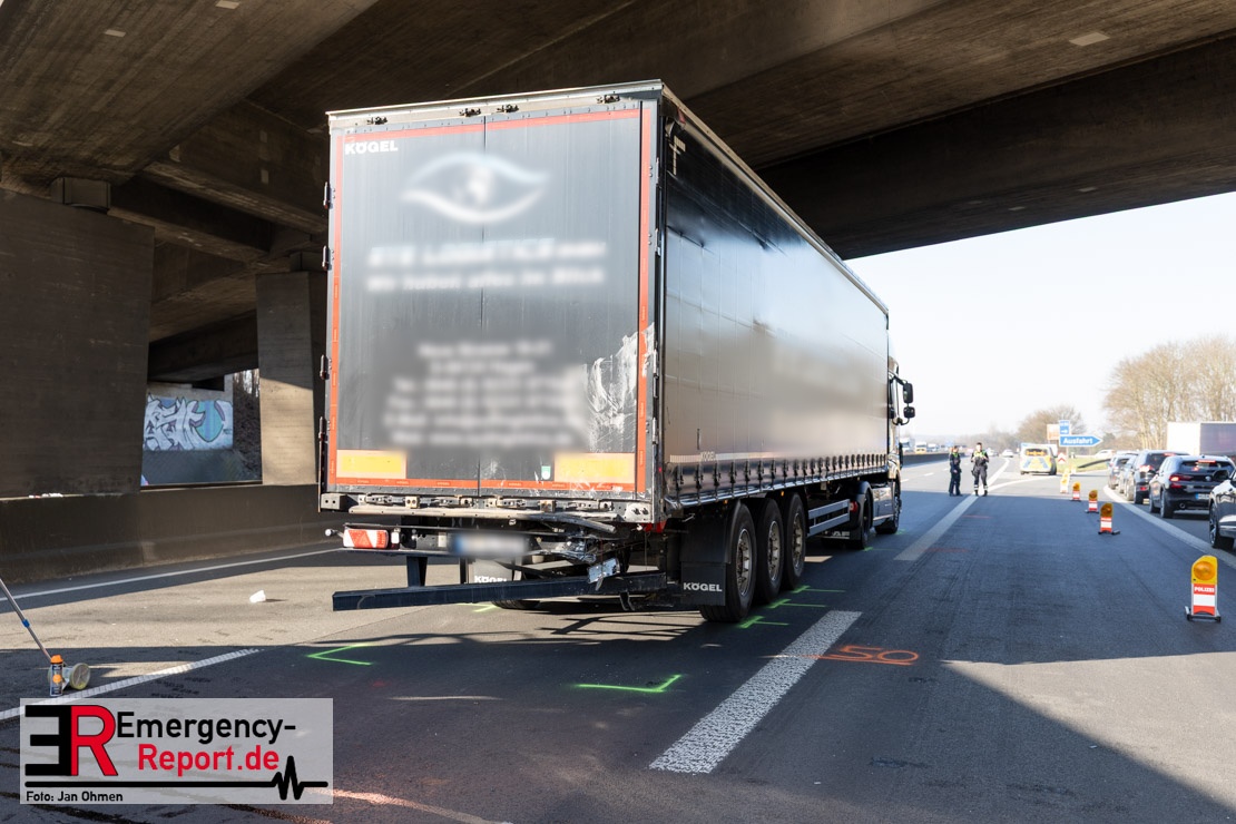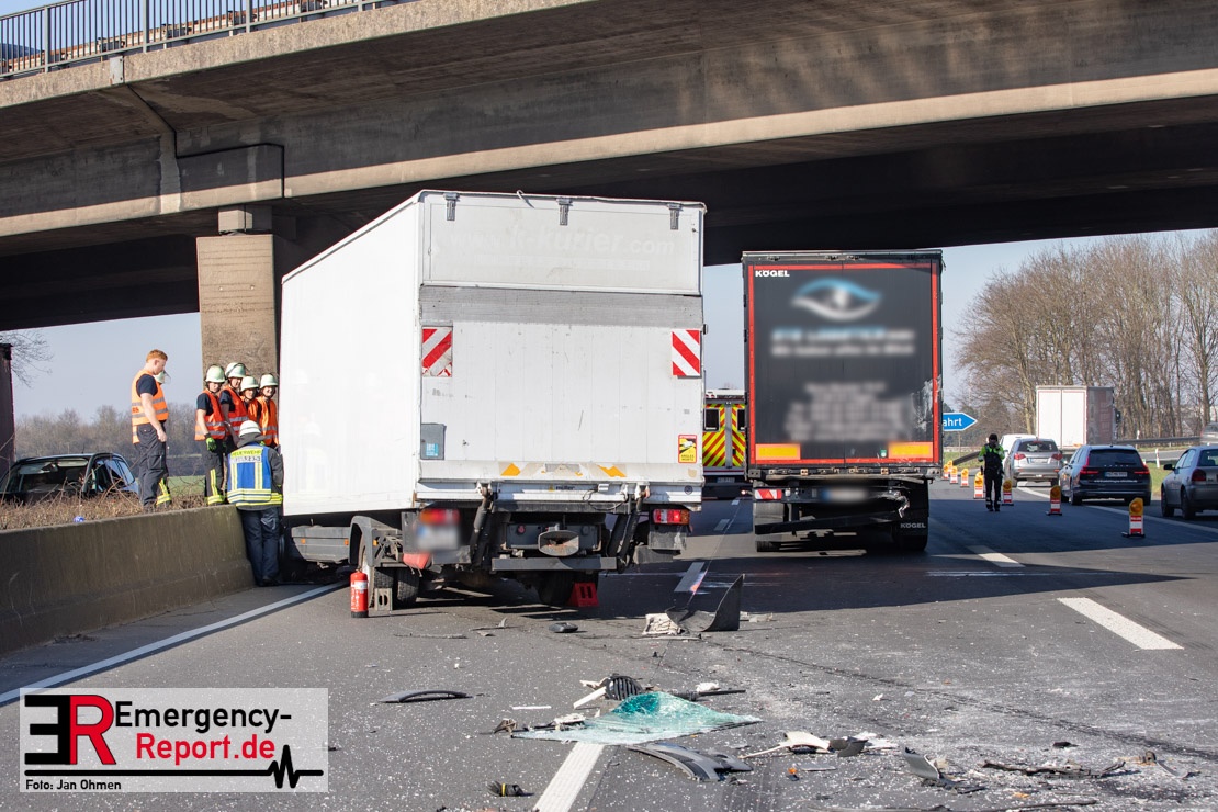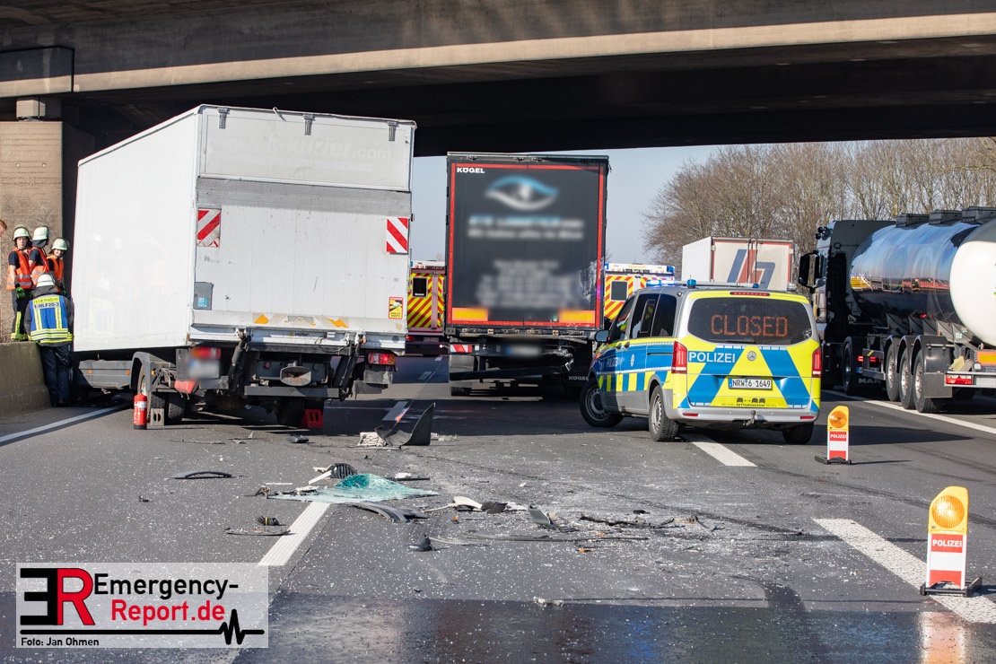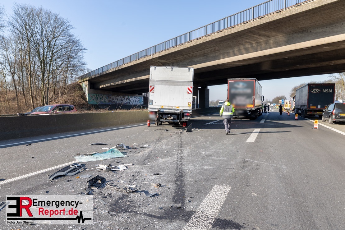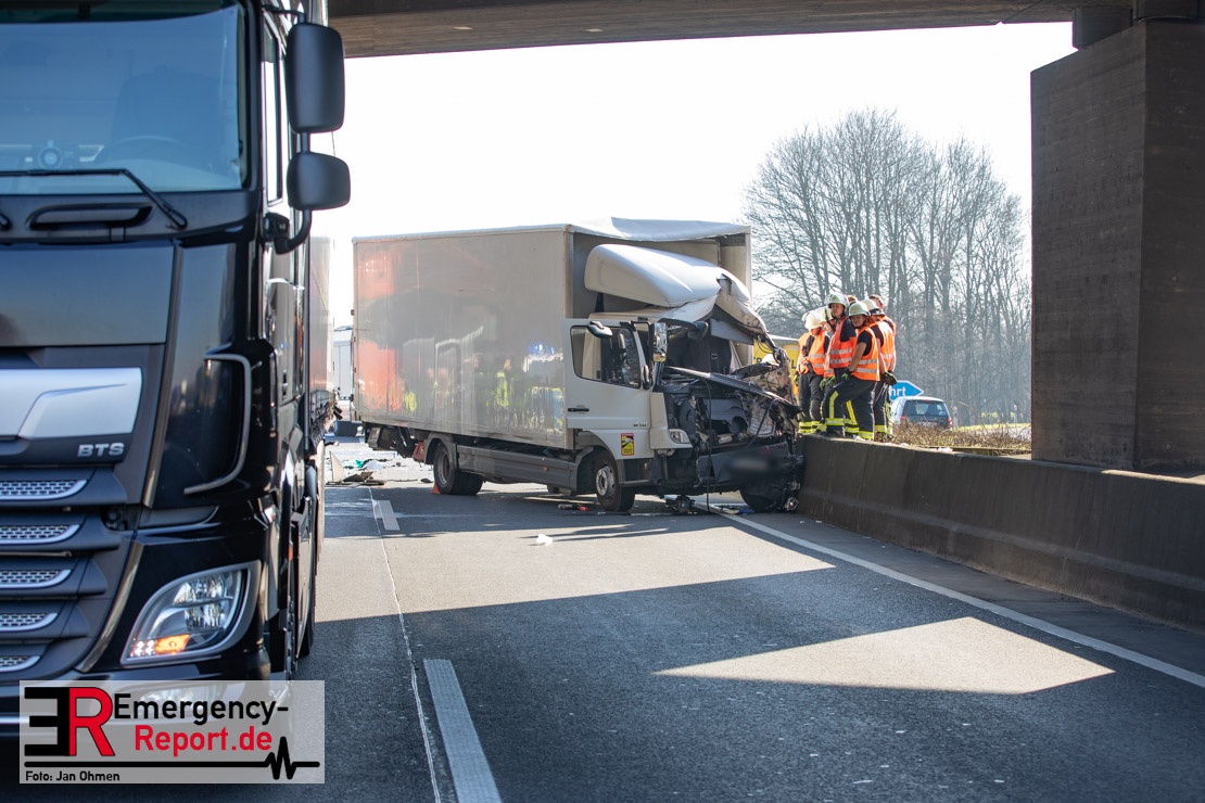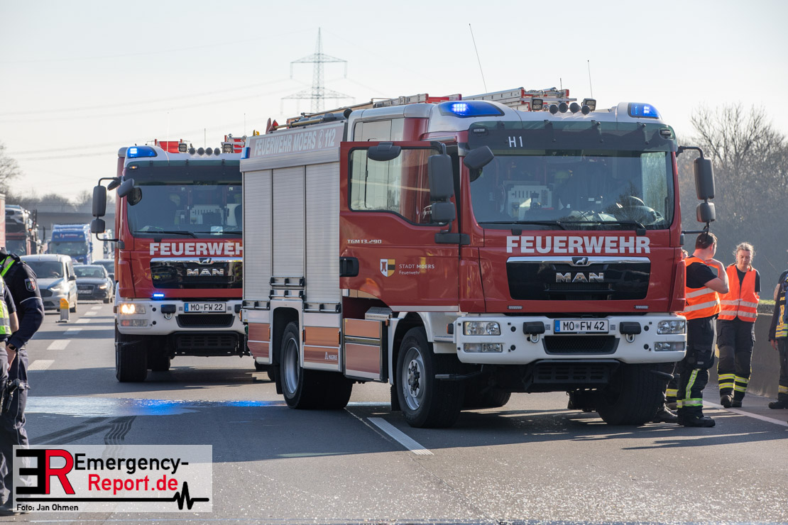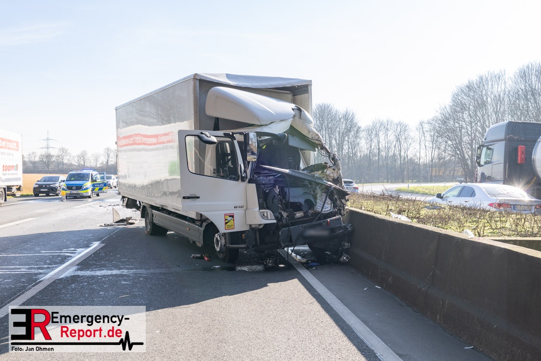 Nach ersten Erkenntnissen fuhr ein 26-jähriger Belarusse mit seinem Lkw auf dem rechten Fahrstreifen der A 57 in Fahrtrichtung Nimwegen. In Höhe von Moers-Hülsdonk musste der Fahrer verkehrsbedingt abbremsen. Aus bislang ungeklärter Ursache fuhr ein 50-jähriger Solinger mit seinem Lkw (7,5 t) auf den bremsenden Sattelzug auf. Er versuchte noch auszuweichen, schleuderte jedoch nach dem Aufprall links in die Betonschutzwand. Der Solinger wurde in seinem Fahrzeug eingeklemmt und musste von der Feuerwehr befreit werden. Ein Rettungshubschrauber brachte den lebensgefährlich verletzten Mann in ein Krankenhaus. Der Belarusse blieb unverletzt und konnte selbstständig mit seinem Lkw die Unfallstelle verlassen. Der Lkw des 50-Jährigen musste geborgen werden. Die Spezialisten des Verkehrsunfallaufnahmeteams übernahmen die Unfallaufnahme. Die Fahrbahn musste von 14:20 Uhr bis 19:30 Uhr voll gesperrt werden. Es kam zu erheblichen Verkehrsbeeinträchtigungen. Die Ermittlungen zur Unfallursache dauern an.