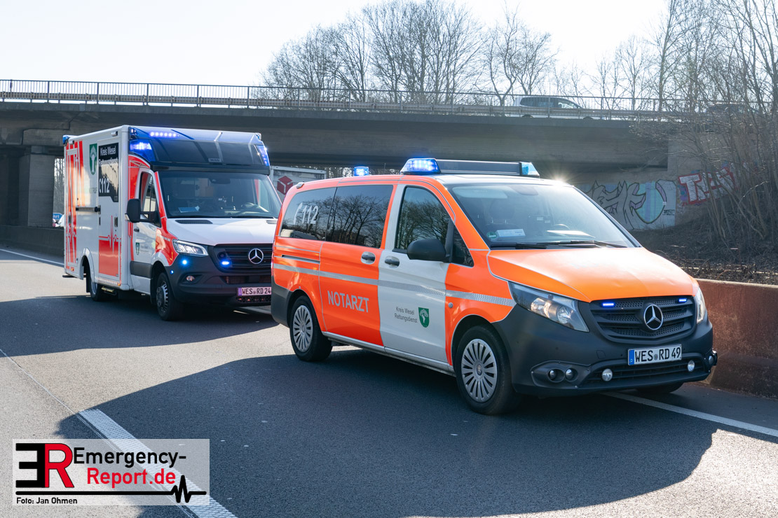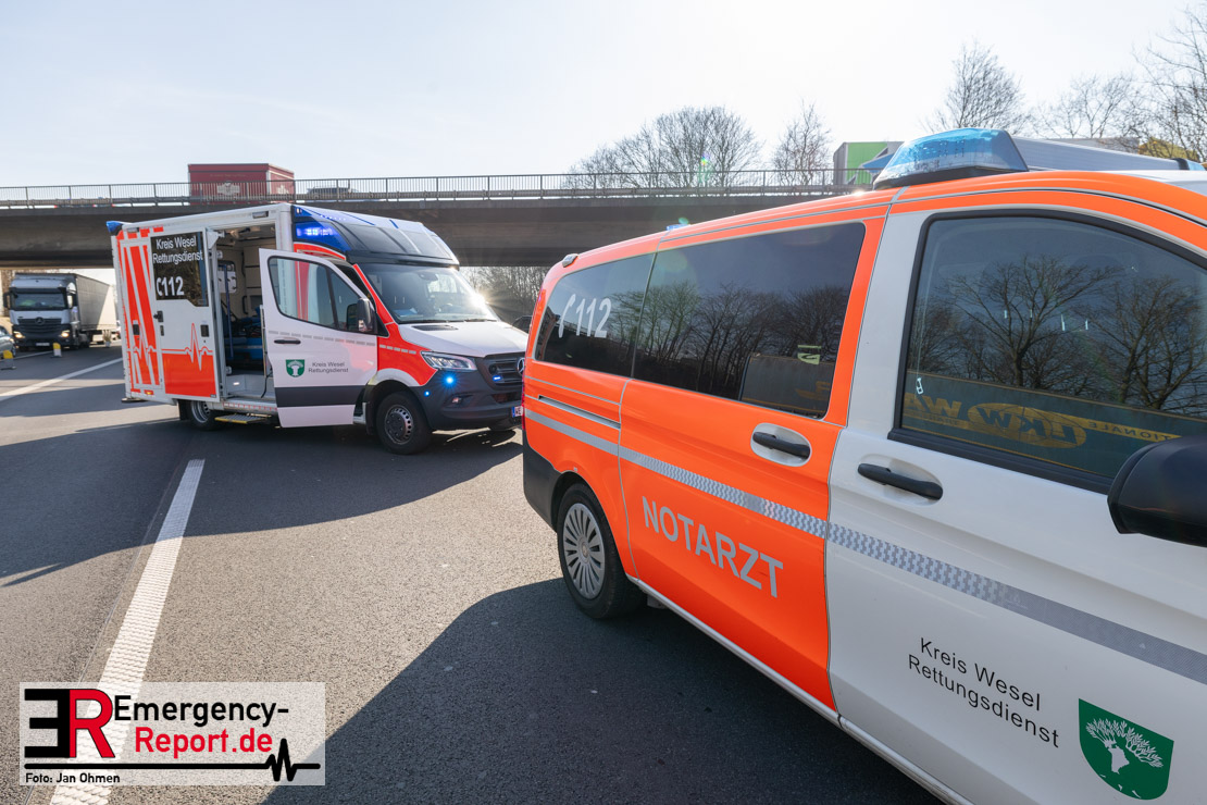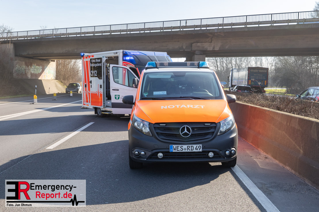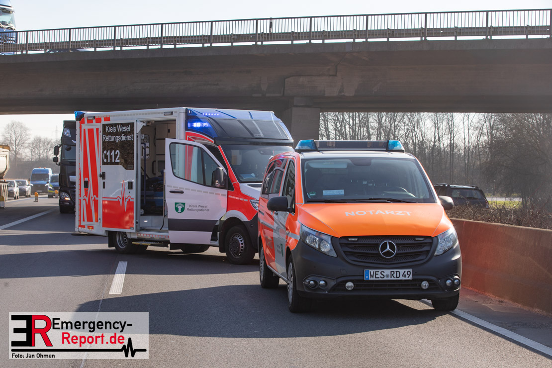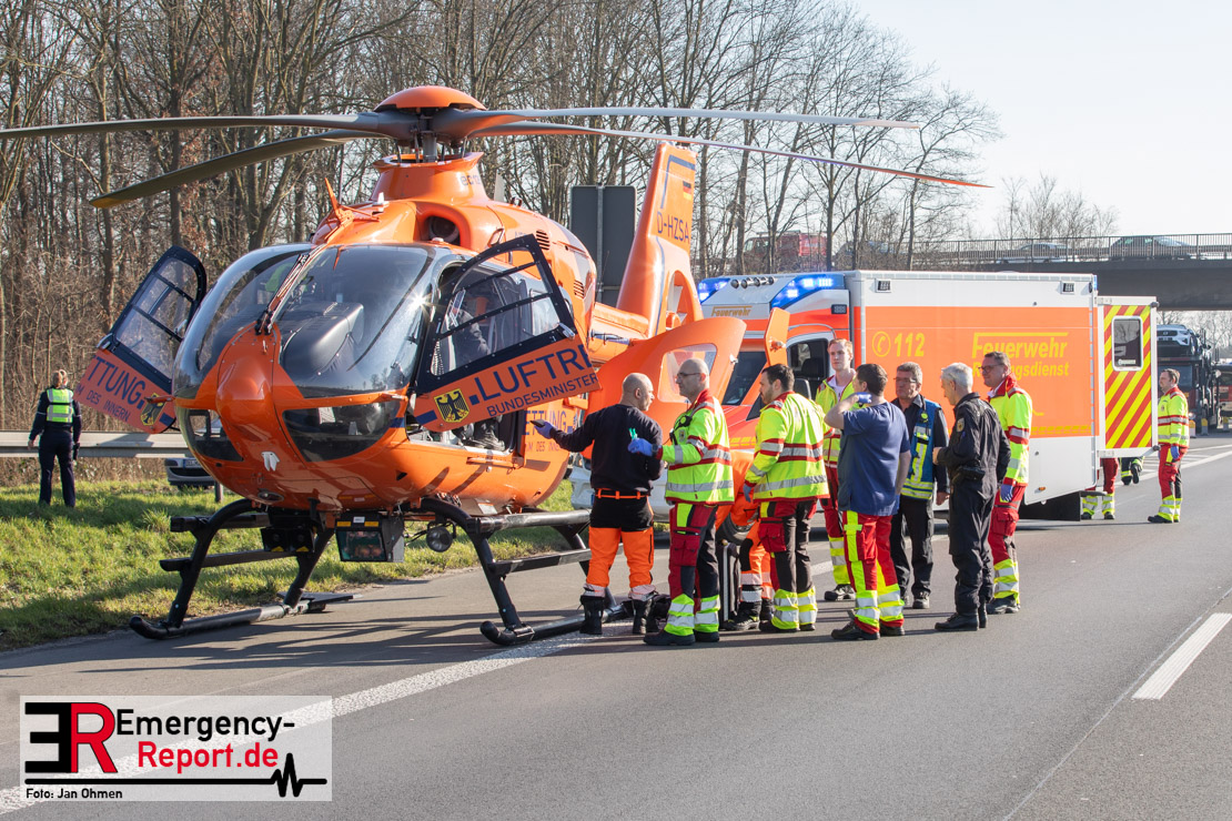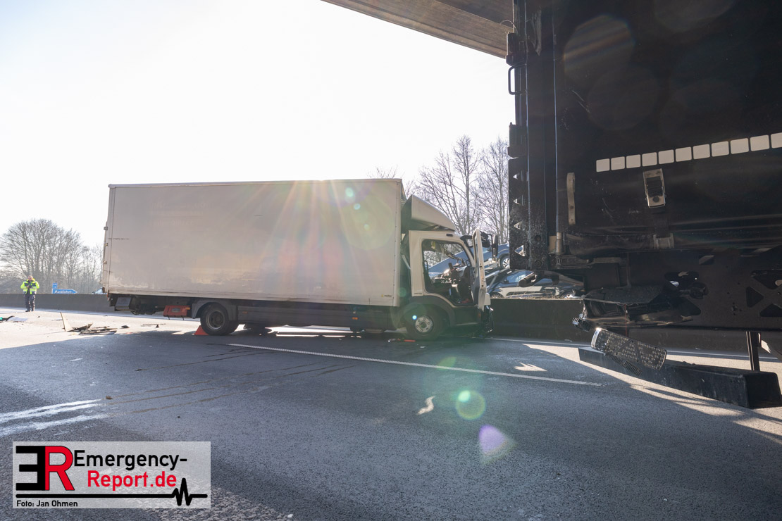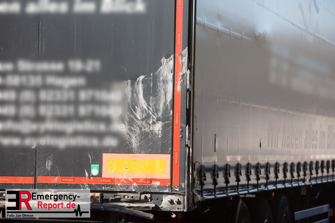 Nach ersten Erkenntnissen fuhr ein 26-jähriger Belarusse mit seinem Lkw auf dem rechten Fahrstreifen der A 57 in Fahrtrichtung Nimwegen. In Höhe von Moers-Hülsdonk musste der Fahrer verkehrsbedingt abbremsen. Aus bislang ungeklärter Ursache fuhr ein 50-jähriger Solinger mit seinem Lkw (7,5 t) auf den bremsenden Sattelzug auf. Er versuchte noch auszuweichen, schleuderte jedoch nach dem Aufprall links in die Betonschutzwand. Der Solinger wurde in seinem Fahrzeug eingeklemmt und musste von der Feuerwehr befreit werden. Ein Rettungshubschrauber brachte den lebensgefährlich verletzten Mann in ein Krankenhaus. Der Belarusse blieb unverletzt und konnte selbstständig mit seinem Lkw die Unfallstelle verlassen. Der Lkw des 50-Jährigen musste geborgen werden. Die Spezialisten des Verkehrsunfallaufnahmeteams übernahmen die Unfallaufnahme. Die Fahrbahn musste von 14:20 Uhr bis 19:30 Uhr voll gesperrt werden. Es kam zu erheblichen Verkehrsbeeinträchtigungen. Die Ermittlungen zur Unfallursache dauern an.