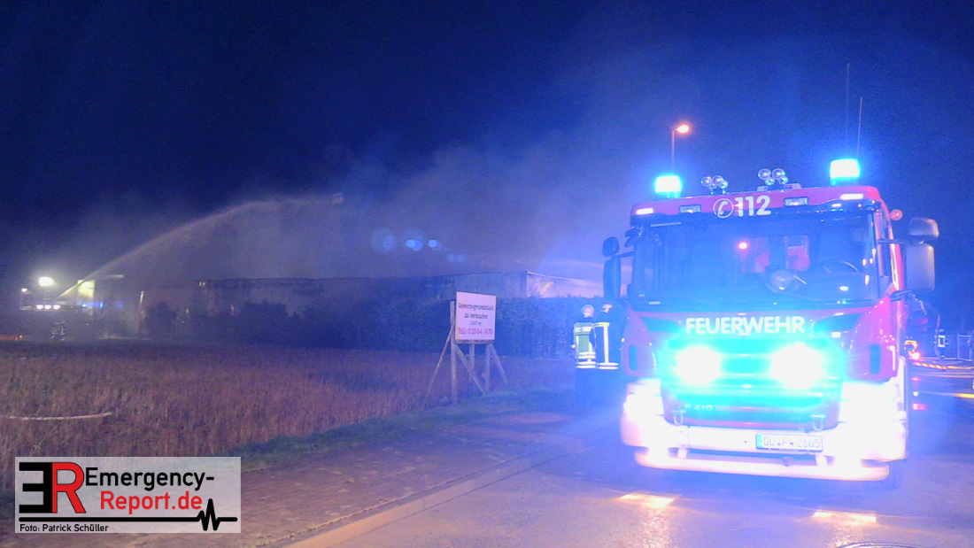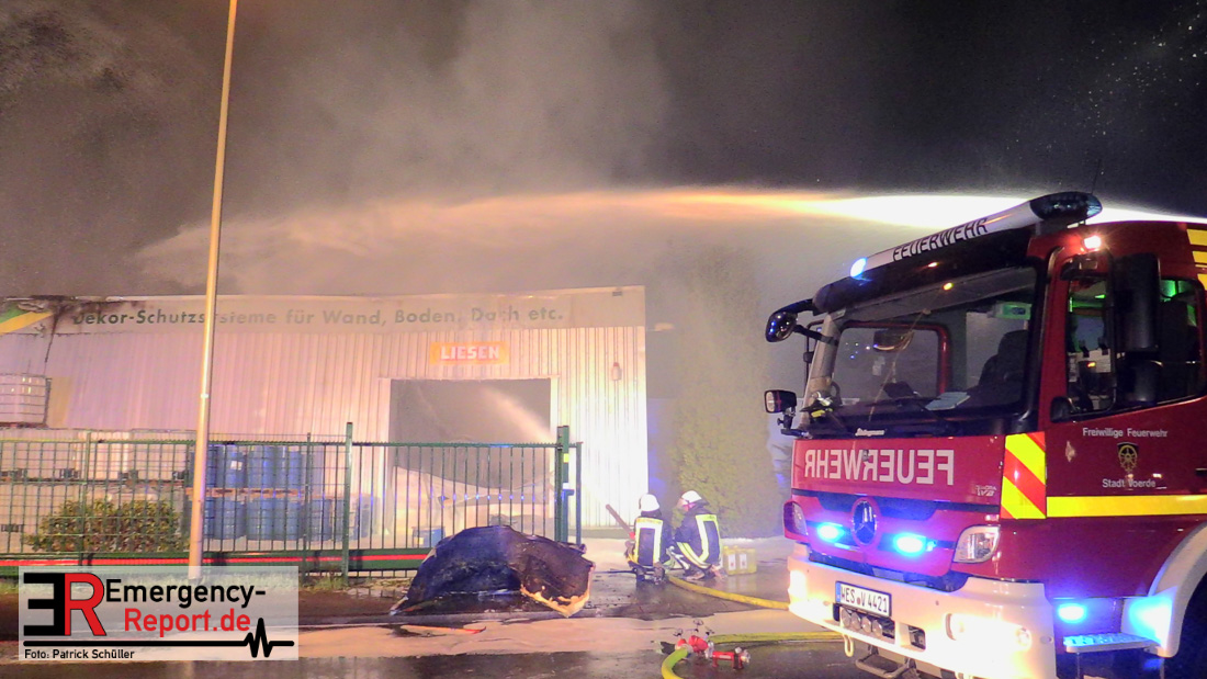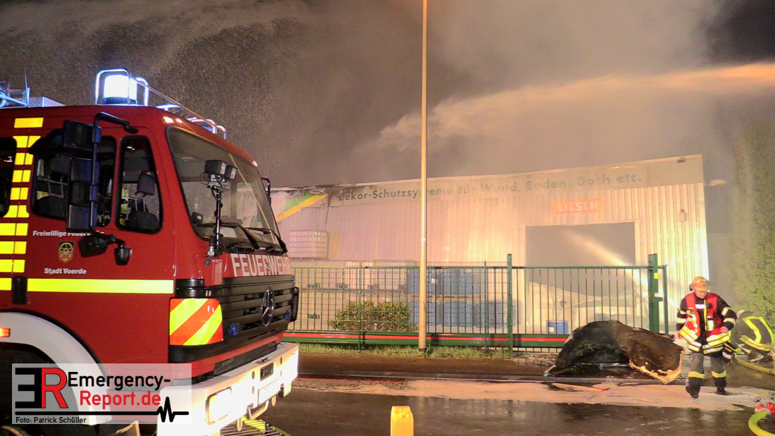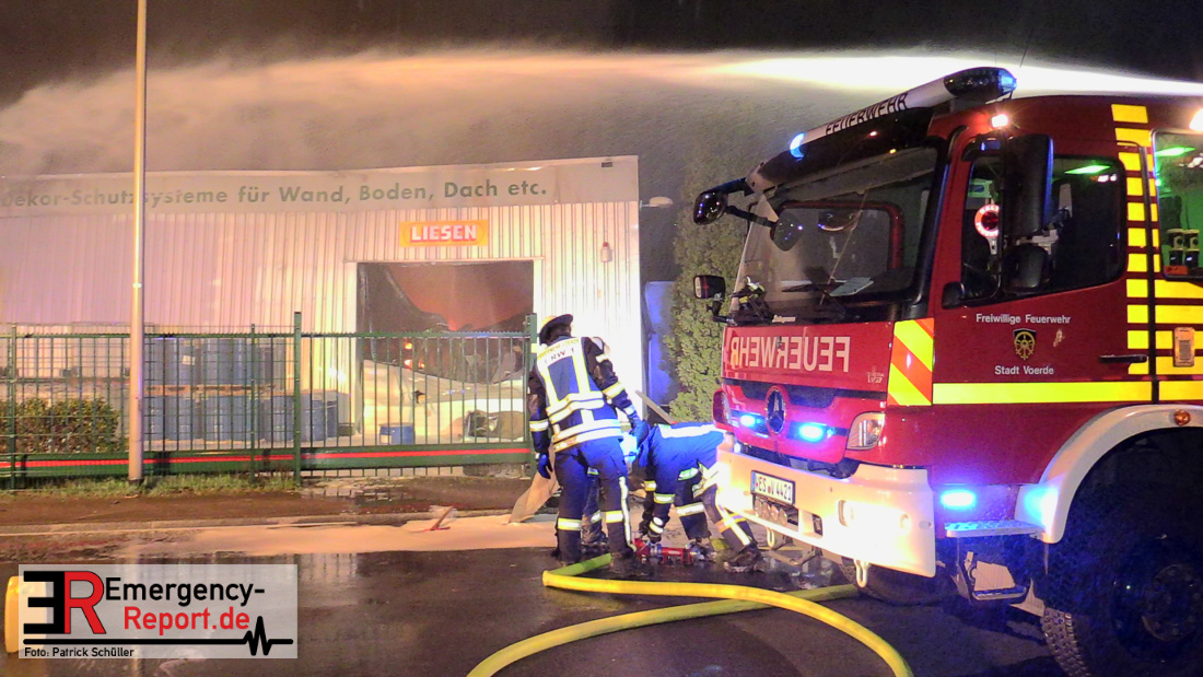 Die Feuerwehr Voerde wurde um 22:45 Uhr am Dienstag, den 19. März 2019 zu einem gemeldeten Brand einer Lagerhalle zur Heidestrasse inmitten des Gewerbegebietes Grenzstrasse gerufen. Bei Eintreffen der ersten Einsatzkräfte stand die etwa 20m x 60m grosse Halle eines Betriebes, der mit Harzen und Lösungsmitteln arbeitet, bereits im Vollbrand – Flammen schlugen 4 bis 6m aus dem Dach heraus. Eine etwa 30m hohe schwarze Rauchsäule stand über der Einsatzstelle.