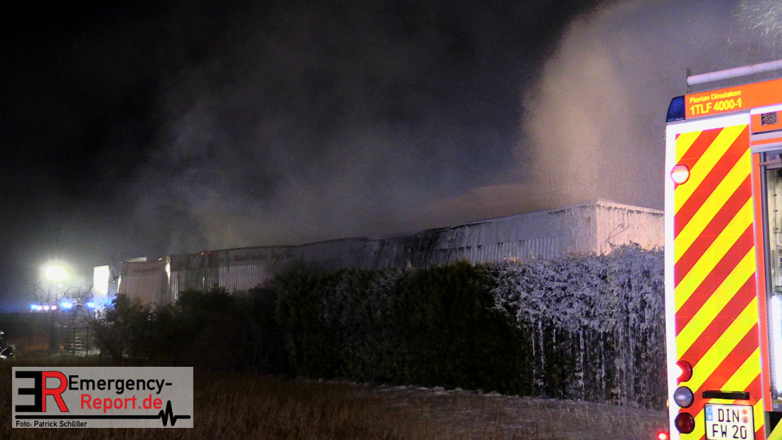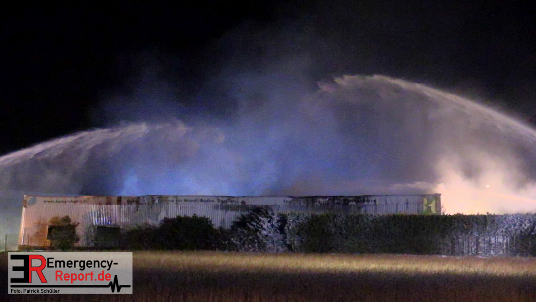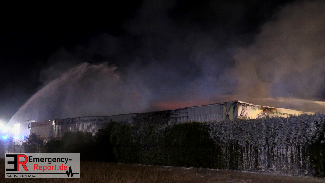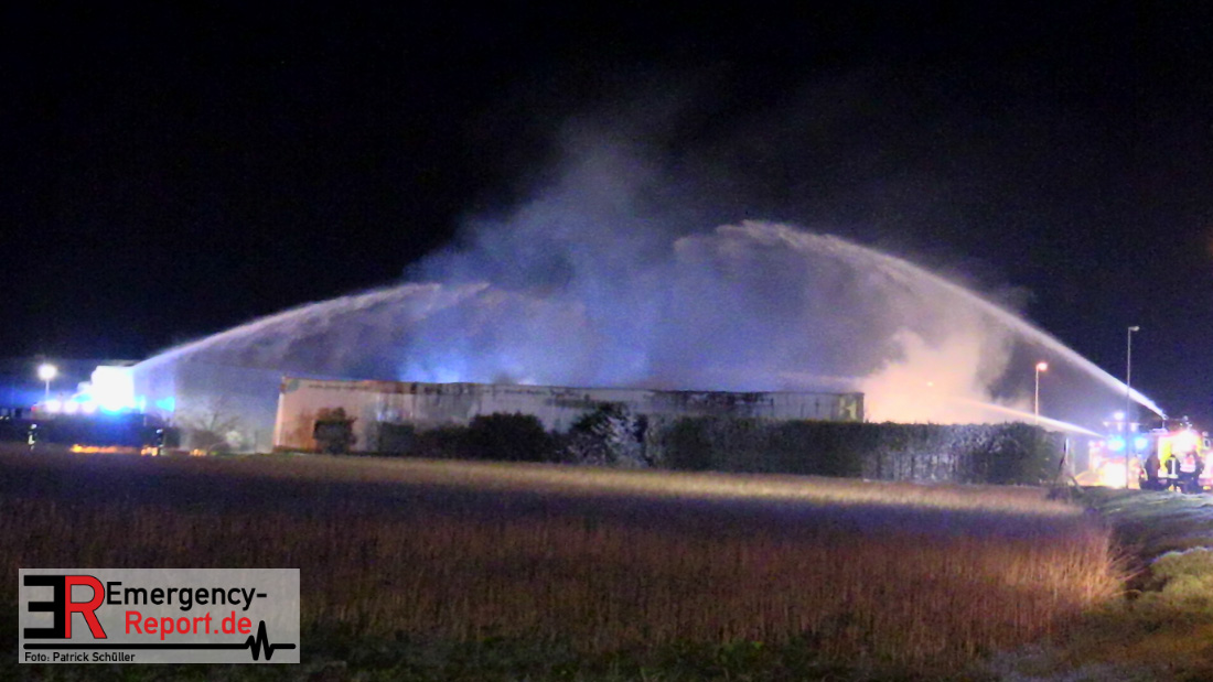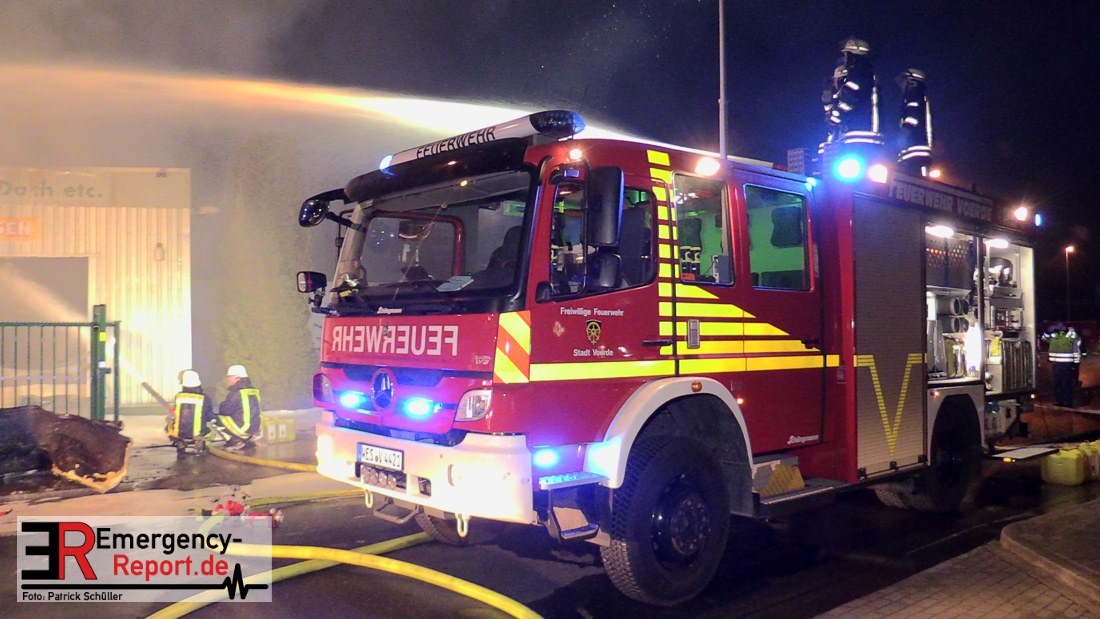 Die Feuerwehr Voerde wurde um 22:45 Uhr am Dienstag, den 19. März 2019 zu einem gemeldeten Brand einer Lagerhalle zur Heidestrasse inmitten des Gewerbegebietes Grenzstrasse gerufen. Bei Eintreffen der ersten Einsatzkräfte stand die etwa 20m x 60m grosse Halle eines Betriebes, der mit Harzen und Lösungsmitteln arbeitet, bereits im Vollbrand – Flammen schlugen 4 bis 6m aus dem Dach heraus. Eine etwa 30m hohe schwarze Rauchsäule stand über der Einsatzstelle.