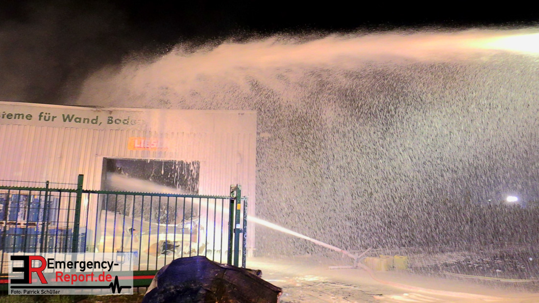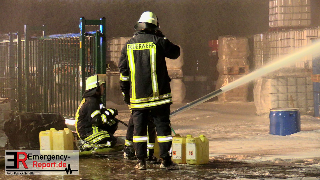 Die ebenfalls in der Halle gelagerten weiteren leicht entzündlichen Stoffen sorgten im weiteren Einsatzverlauf immer wieder für hohe Flammensäulen, so dass die Feuerwehr nur aus gesicherter Distanz den Brand bekämpfen konnte. Über die Feuerwehren in Wesel und Dinslaken wurden Tanklöschfahrzeuge nachalarmiert, mit dessen Wasserwerfern die Einsatzkräfte nicht weiter in den Gefahrenbereich eindringen mussten. Die Feuerwehr Duisburg unterstützte die Arbeiten mit einem Abrollcontainer mit Schaummitteln.