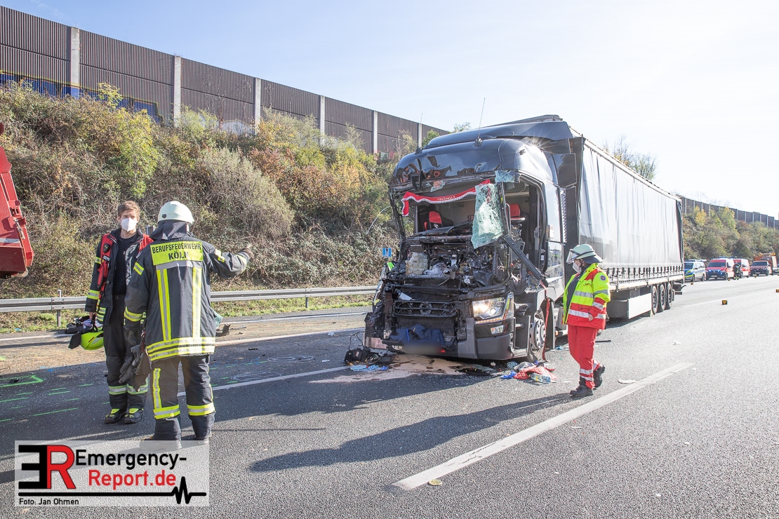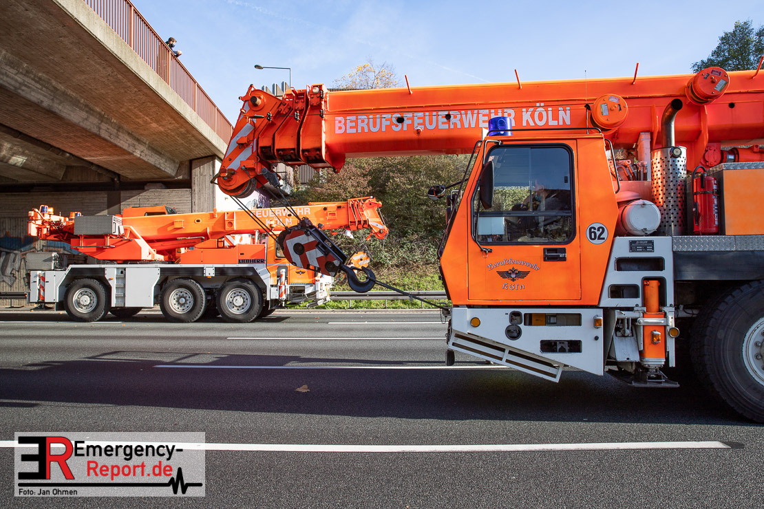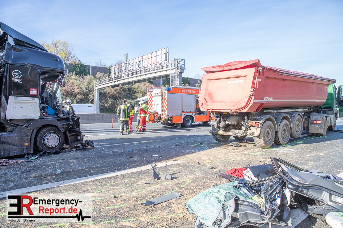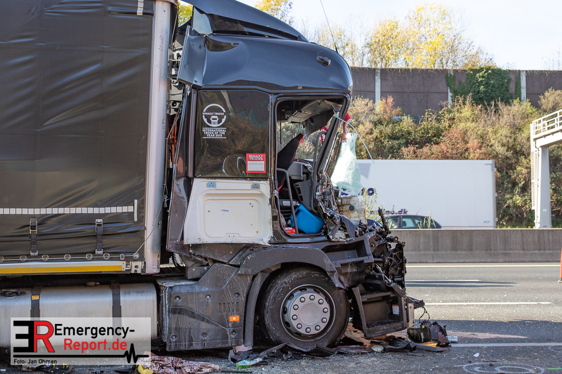 Bei einem Auffahrunfall auf der Bundesautobahn 3 sind am Freitagvormittag (6. November) zwei Lastwagenfahrer in ihren Führerhäusern eingeklemmt worden. Feuerwehrleute und Rettungskräfte befreien derzeit die beiden Eingeklemmten und kümmern sich um die Verletzten. Polizisten sperren die Richtungsfahrbahn Oberhausen in Höhe des Autobahndreiecks Heumar ab. Das Verkehrsunfallaufnahmeteam der Polizei und zwei Rettungshubschrauber sind im Einsatz.
