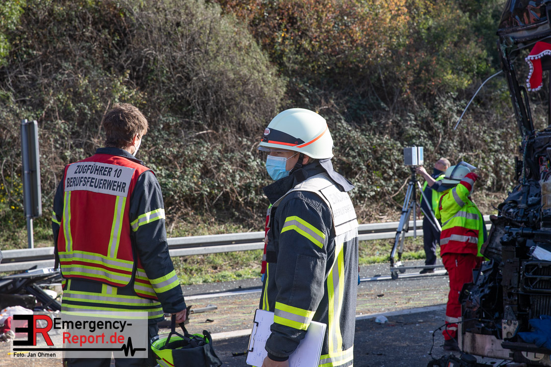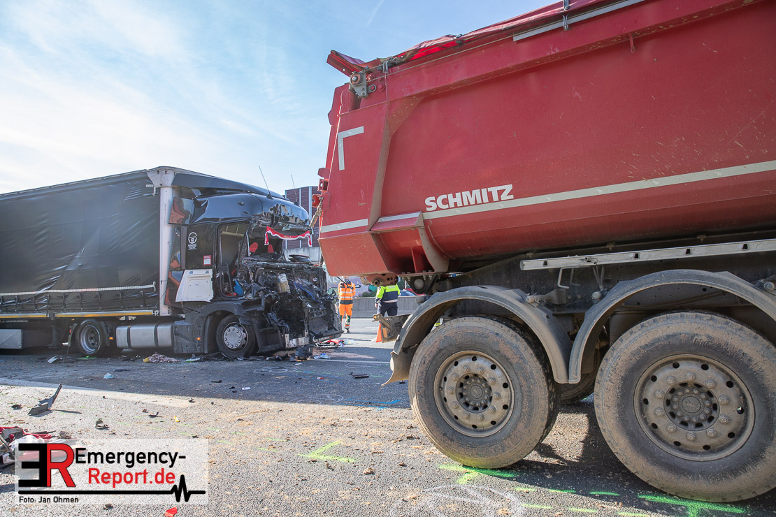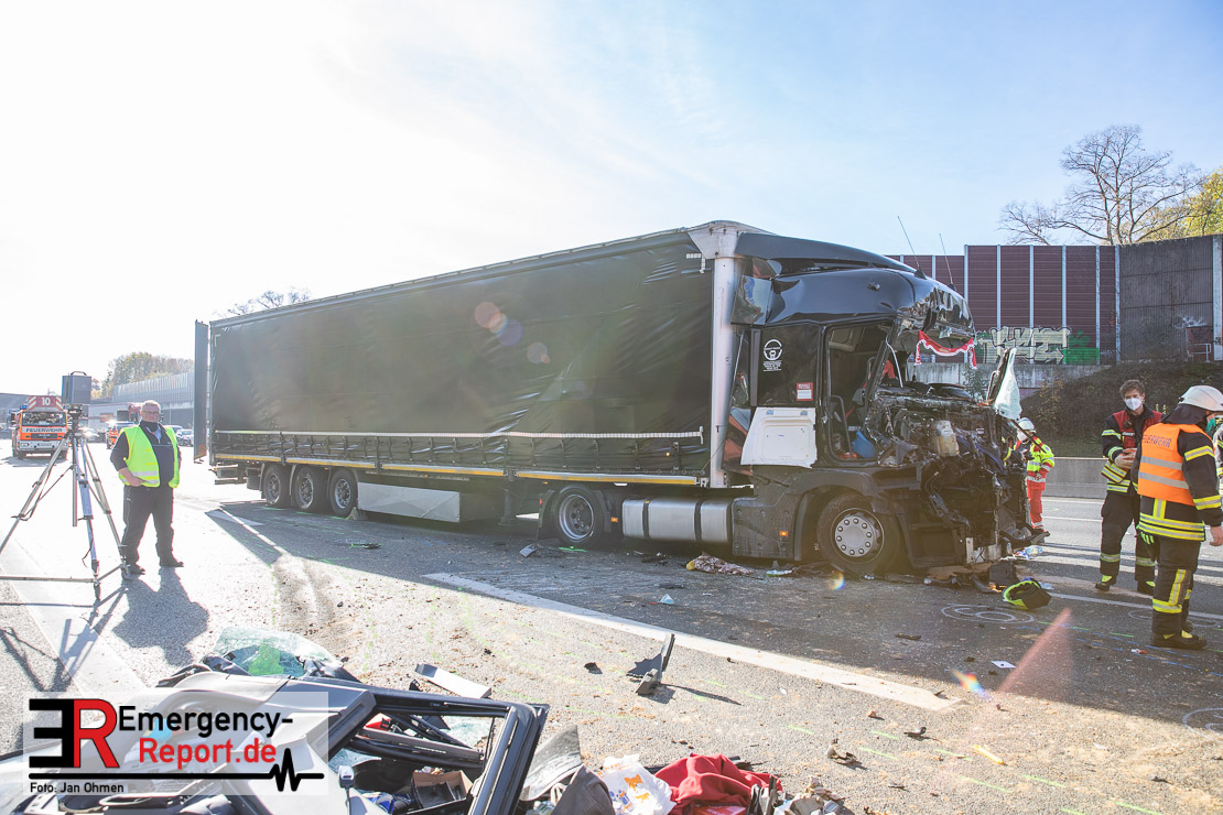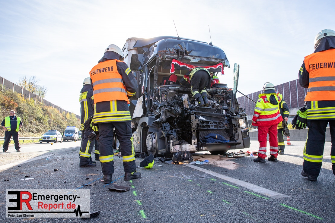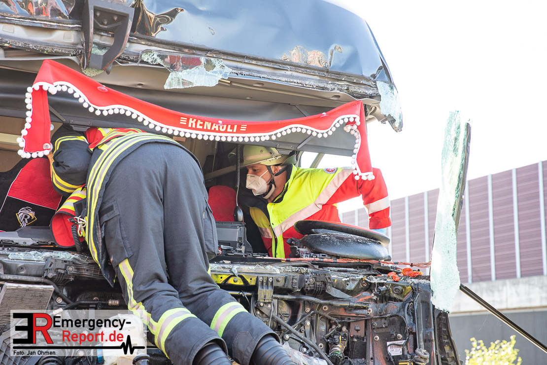 Bei einem Auffahrunfall auf der Bundesautobahn 3 sind am Freitagvormittag (6. November) zwei Lastwagenfahrer in ihren Führerhäusern eingeklemmt worden. Feuerwehrleute und Rettungskräfte befreien derzeit die beiden Eingeklemmten und kümmern sich um die Verletzten. Polizisten sperren die Richtungsfahrbahn Oberhausen in Höhe des Autobahndreiecks Heumar ab. Das Verkehrsunfallaufnahmeteam der Polizei und zwei Rettungshubschrauber sind im Einsatz.