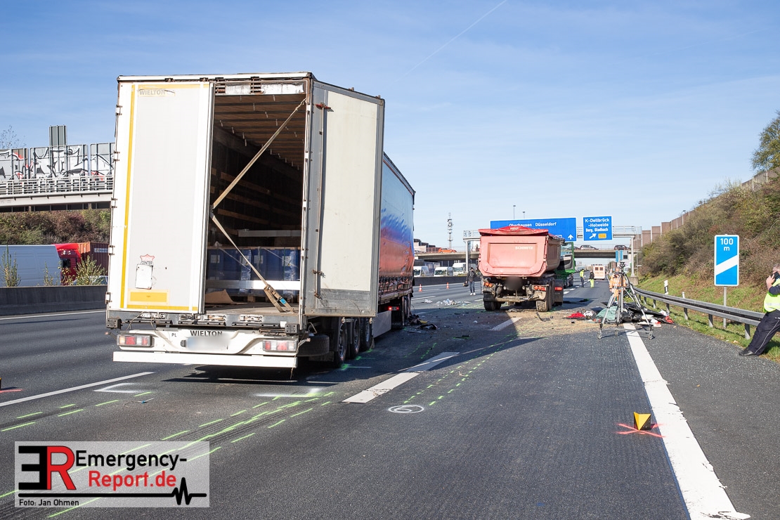 Nach ersten Ermittlungen war ein Lastwagenfahrer gegen 10 Uhr mit seinem Fahrzeug auf der A 3 in Richtung Oberhausen unterwegs. Kurz vor der Anschlussstelle Dellbrück soll er nach derzeitigem Sachstand verkehrsbedingt stark abgebremst haben. Zwei nachfolgende Lastwagenfahrer fuhren jeweils aufeinander auf.