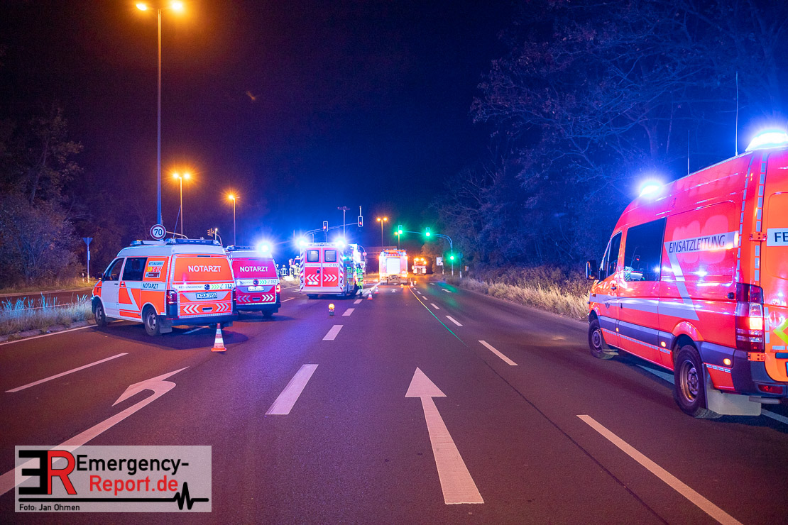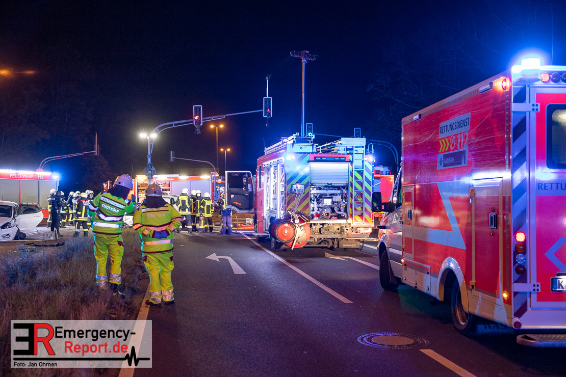Gegen 21:20 Uhr erreichte die Leitstelle der Feuerwehr Köln die Information über einen Verkehrsunfall zweier PKW mit einer verletzten Person. Den daraufhin alarmierten Kräften der Feuer- und Rettungswache aus Chorweiler bot sich vor Ort jedoch ein weitaus dramatischeres Bild. Nach einem Verkehrsunfall waren zwei männliche Personen leicht und eine weibliche Person schwer verletzt. Die Schwerverletzte war so in ihrem deformierten Fahrzeug eingeklemmt, dass sie mit schwerem technischen Gerät von der Feuerwehr befreit werden musste. Eine besondere Herausforderung war die Gegebenheit, dass das Fahrzeug in Höhe der Fahrertür mit einen Ampelmast kollidiert war und dadurch an dieser Stelle massiv eingedrückt wurde. Die patientenschonende Rettung konnte rund 35 Minuten nach dem Notruf erfolgreich abgeschlossen werden. Die Frau wurde anschließend durch den Rettungsdienst zur weiteren Behandlung in ein Klinikum der Maximalversorgung überführt.