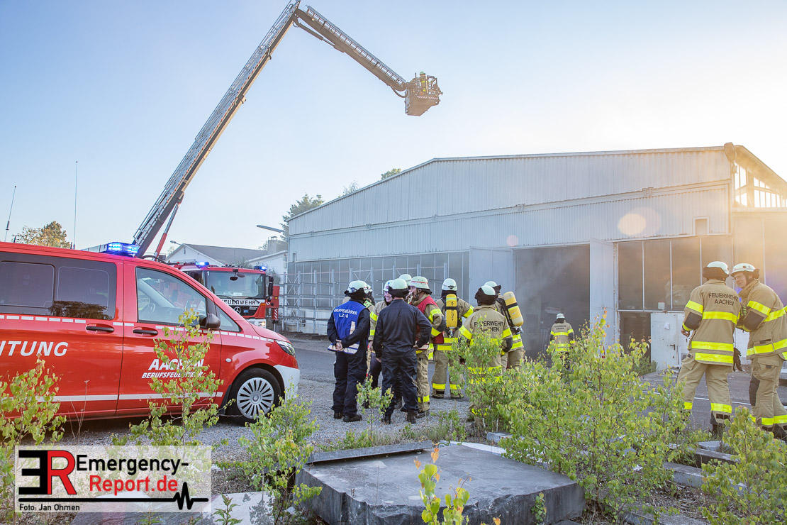 Die Feuerwehr Aachen wurde am Abend auf die Straße „Auf Trimpersfeld“ alarmiert. Die Anrufer teilten der Leitstelle mit das aus einer Halle Rauch austreten würde. Sofort entsandt die Feuerwehrleitstelle mehrere Einheiten zum beschriebenen Objekt. Bei Eintreffen der ersten Fahrzeuge bestätigte sich die Lage. Aufgrund eines explodierten Motors in der Halle kam es zu der starken Rauchentwicklung. Umgehend wurden mehrere Trupps unter Atemschutz zur Erkundung in die Halle geschickt. Nachdem klar war, das es sich um kein direktes Brandereignis handelte wurden mehrere Lüfter in Stellung gebracht die, die Halle Rauchfrei machen sollten. Verletzt wurde Glücklicherweise niemand, die Polizei hat aber die Ermittlungen aufgenommen.