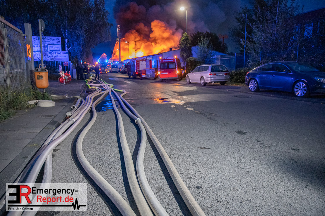 Bei Eintreffen der ersten Einsatzkräfte brannten mehrere Schrottfahrzeuge – die Brandausbreitung ist auf Grund der Brandlast sehr hoch. Es wurde daraufhin Vollalarm für das gesamte Stadtgebiet ausgelöst. Die Einheiten der Freiwilligen Feuerwehr sowie der Führungsdienst der Berufsfeuerwehr sind alarmiert. Derzeitig wird eine umfangreiche Einsatzleitung eingerichtet. Aktuell sind ca. 150 Einsatzkräfte der Berufsfeuerwehr aller drei Wachen und der Freiwilligen Feuerwehr im Einsatz. Ebenfalls ist ein Tanklöschfahrzeug der Feuerwehr Herne und ein Gelenkmast der Feuerwehr Dortmund vor Ort.