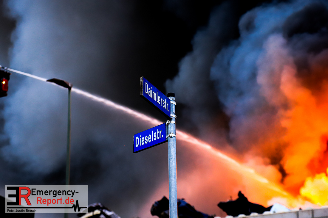 Um den Brand zu löschen, wurden die Einsatzstelle mit Schaum abgedeckt. Rund 6.500 Liter Schaummittel wurden verbraucht, um einen bis zu drei Meter hohen Schaumteppich zu erzeugen. Durch den Schaumeinsatz konnte die Rauchentwicklung sehr schnell reduziert werden, sodass auch die NINA-Warnung vor Geruchsbelästigungen mittlerweile aufgehoben wurde. Derzeit laufen die Aufräumarbeiten. Rund 4.000 Meter Schlauchmaterial müssen aufgenommen werden. Anschließend wird eine Brandwache vor Ort bleiben, um erneut aufflammende Brandnester ablöschen zu können.