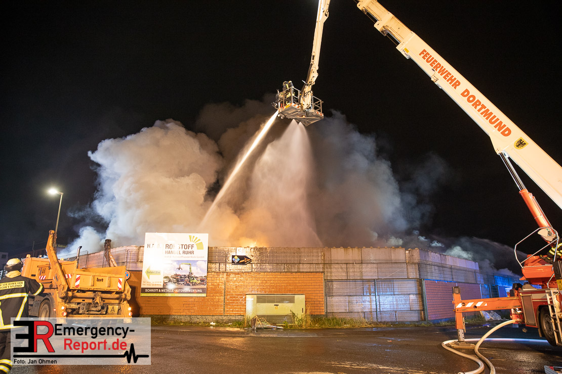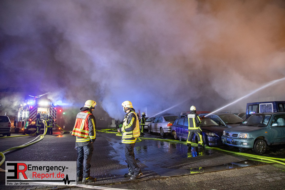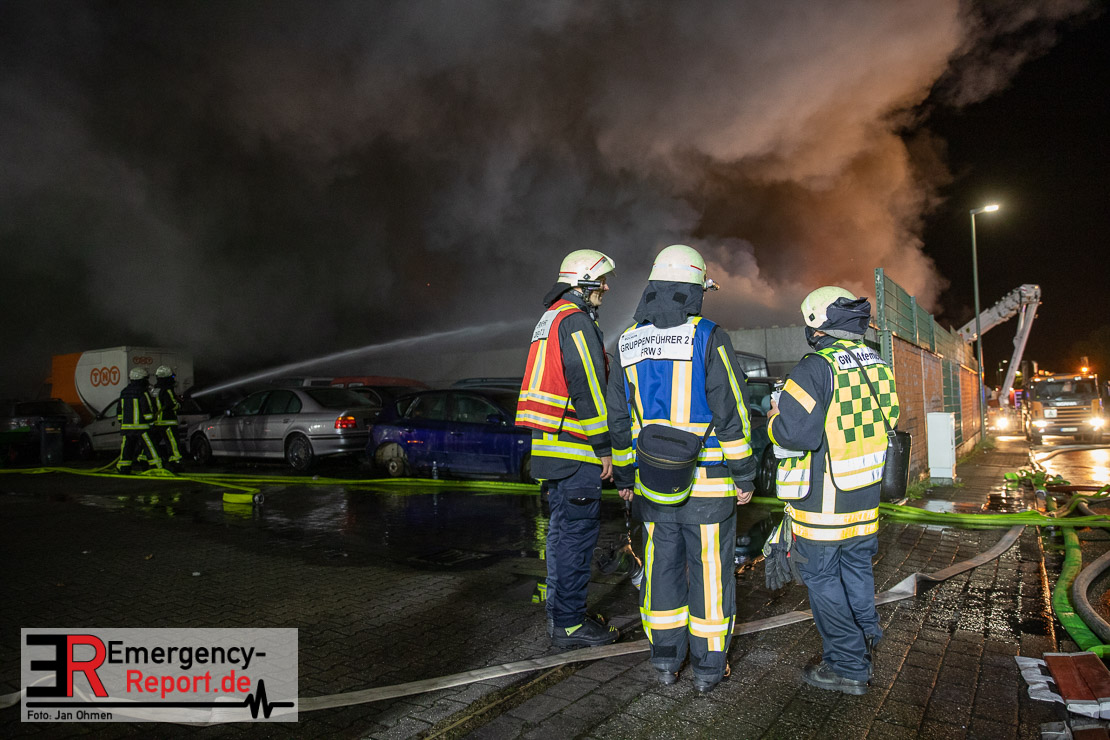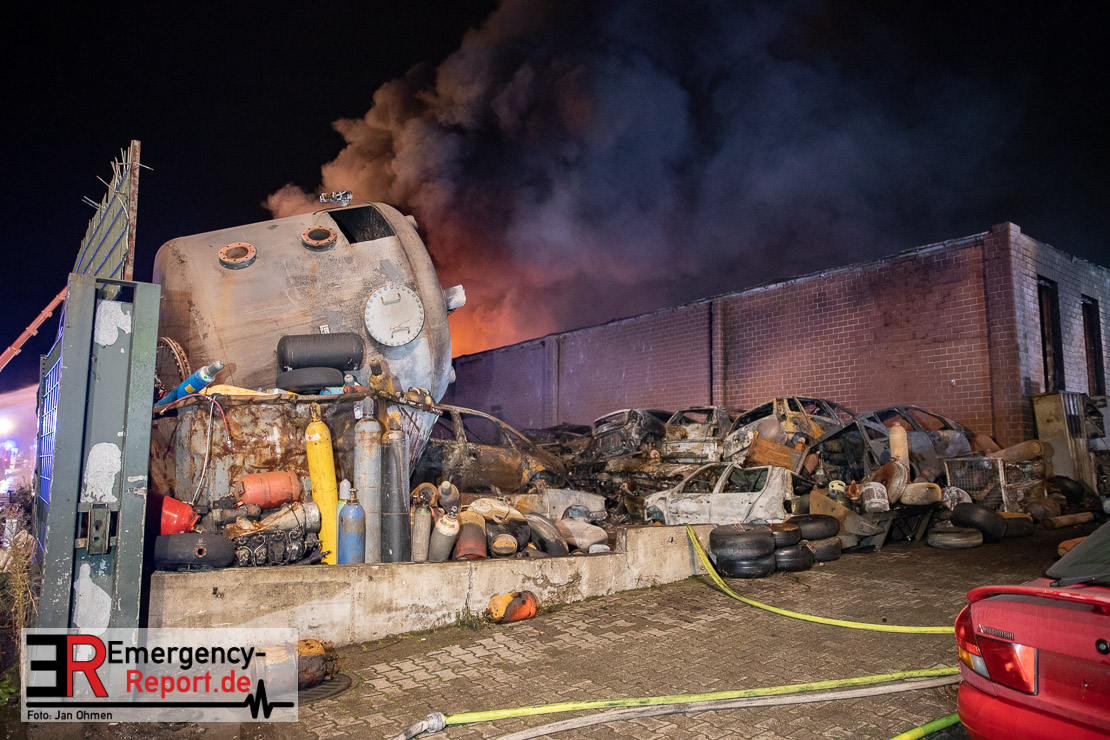 Bei Eintreffen der ersten Einsatzkräfte brannten mehrere Schrottfahrzeuge – die Brandausbreitung ist auf Grund der Brandlast sehr hoch. Es wurde daraufhin Vollalarm für das gesamte Stadtgebiet ausgelöst. Die Einheiten der Freiwilligen Feuerwehr sowie der Führungsdienst der Berufsfeuerwehr sind alarmiert. Derzeitig wird eine umfangreiche Einsatzleitung eingerichtet. Aktuell sind ca. 150 Einsatzkräfte der Berufsfeuerwehr aller drei Wachen und der Freiwilligen Feuerwehr im Einsatz. Ebenfalls ist ein Tanklöschfahrzeug der Feuerwehr Herne und ein Gelenkmast der Feuerwehr Dortmund vor Ort.