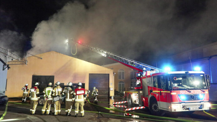 Noch während die Feuerwehr Düsseldorf mit den Löschmaßnahmen bei einem Großbrand eines Gewerbebetriebes in Reisholz beschäftigt war, erreichte die Leitstelle zahlreiche Anrufe über die Notrufnummer 112, dass eine Lagerhalle an der Wiesenstraße brennt. Umgehend entsendete der Leitstellendisponent Einsatzkräfte zur Einsatzadresse. Schon auf der Anfahrt konnten die Feuerwehrleute vom Weiten den Flammenschein erkennen. Nachdem die ersten Einsatzkräfte die Einsatzstelle erreichten, stellten sie eine Lagerhalle fest, die auf einer Fläche von etwa 200 Quadratmeter brannte. Sofort ließ der Einsatzleiter die Brandbekämpfung über zwei Drehleitern vorbereiten. Während dieser Vorbereitungen retteten weitere Einsatzkräfte eine Person aus einer angrenzenden Wohnung – sie wurde leicht verletzt zur weiteren ärztlichen Behandlung in ein Krankenhaus transportiert! Mit mehreren handgeführten Löschrohren und zwei Wasserwerfern konnten die rund 40 Einsatzkräfte eine Ausbreitung der Flammen auf die Nachbargebäude verhindern und nach gut dreieinhalb Stunden die letzten Flammen löschen. Auch bei diesem Einsatz kam es zu einer starken Rauchentwicklung, sodass die Feuerwehr auch zu diesem Einsatz die Bevölkerung über die Warnapp NINA über eine mögliche Geruchsbelästigung sensibilisierte. Vorsorglich zog die Feuerwehr einen Bausachverständigen des städtischen Bauaufsichtsamtes zur Beurteilung der Statik hinzu. Dieser stellte fest, dass Teile der Halle einsturzgefährdet sind. Bei einer routinemäßig durchgeführten Brandschau um 10.30 Uhr konnten die Feuerwehrleute noch vereinzelte Glutnester entdecken und diese mit einem Wasserschaumgemisch ablöschen. Eine weitere Brandnachschau wird durch die Feuerwehr am Nachmittag erfolgen. Ebenfalls hielt die Feuerwehr zu diesem Einsatz einen engen Kontakt zum städtischen Umweltamt. Die Arbeit der Feuerwehr Düsseldorf unterstützen auch in diesem Einsatz mehrere ehrenamtliche Einsatzkräfte der Freiwilligen Feuerwehr. Die Brandursachenermittlung übernimmt die Kriminalpolizei, die ihre Arbeit dazu aufgenommen hat. In einer ersten Schätzung liegt der entstandene Sachschaden bei mindestens 100.000 Euro.