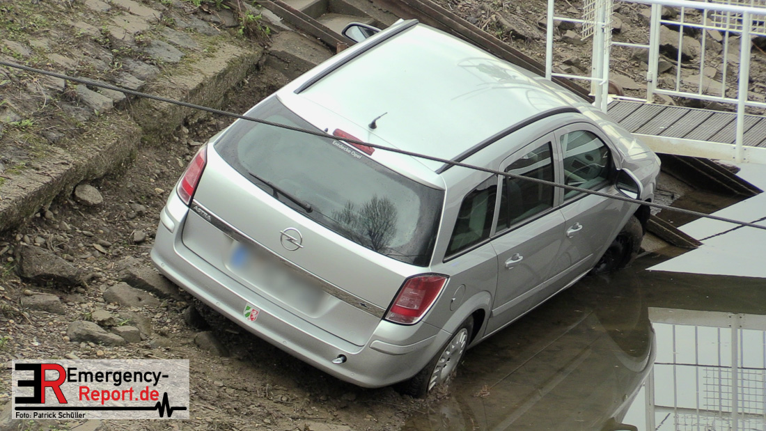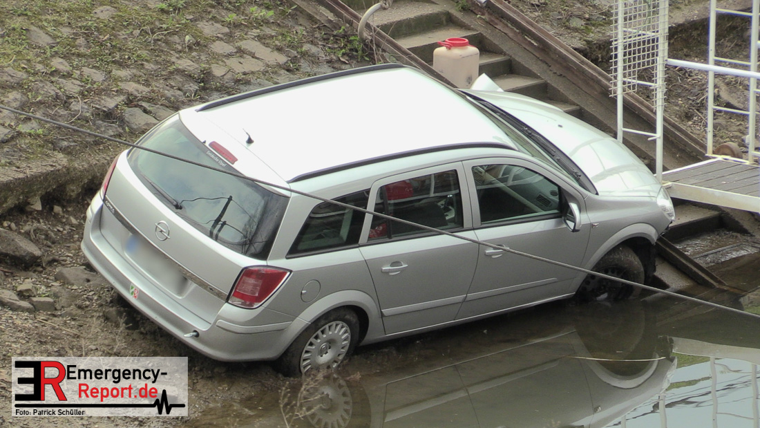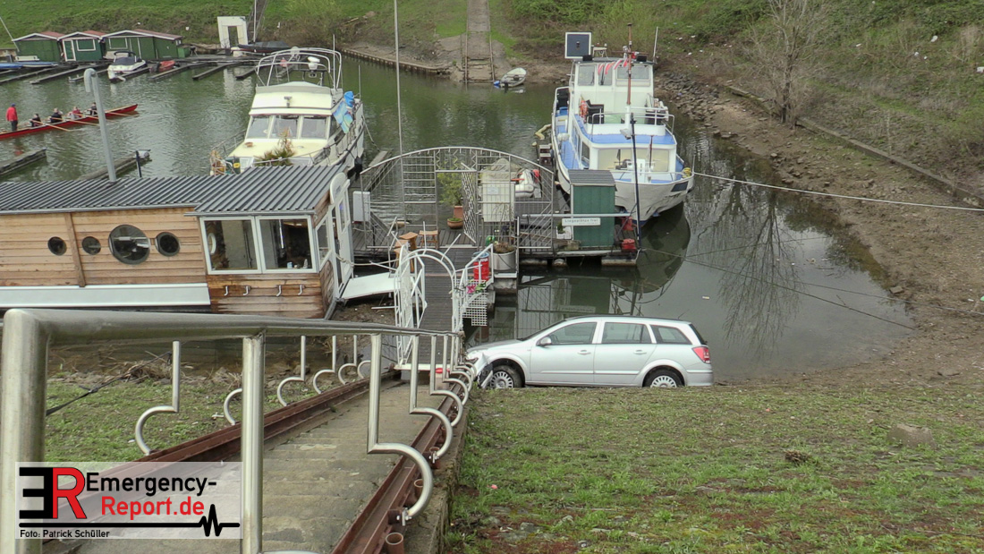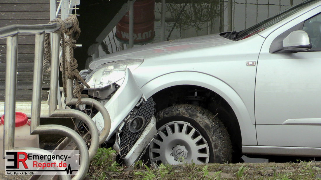 Aus bislang ungeklärter Ursache rollte ein Auto eine steile Uferböschung hinunter und krachte gegen einen Anleger im Yachthafen.
