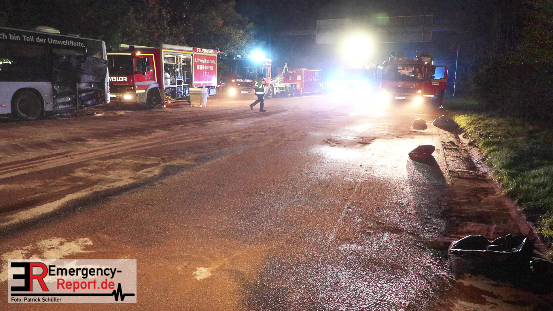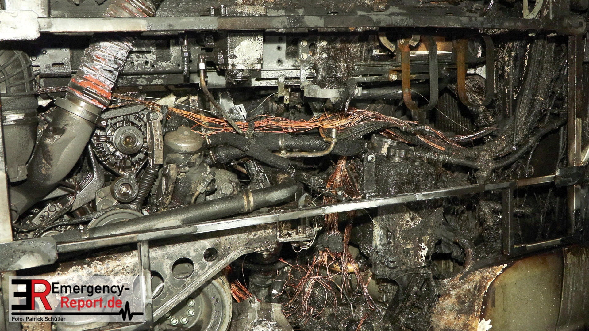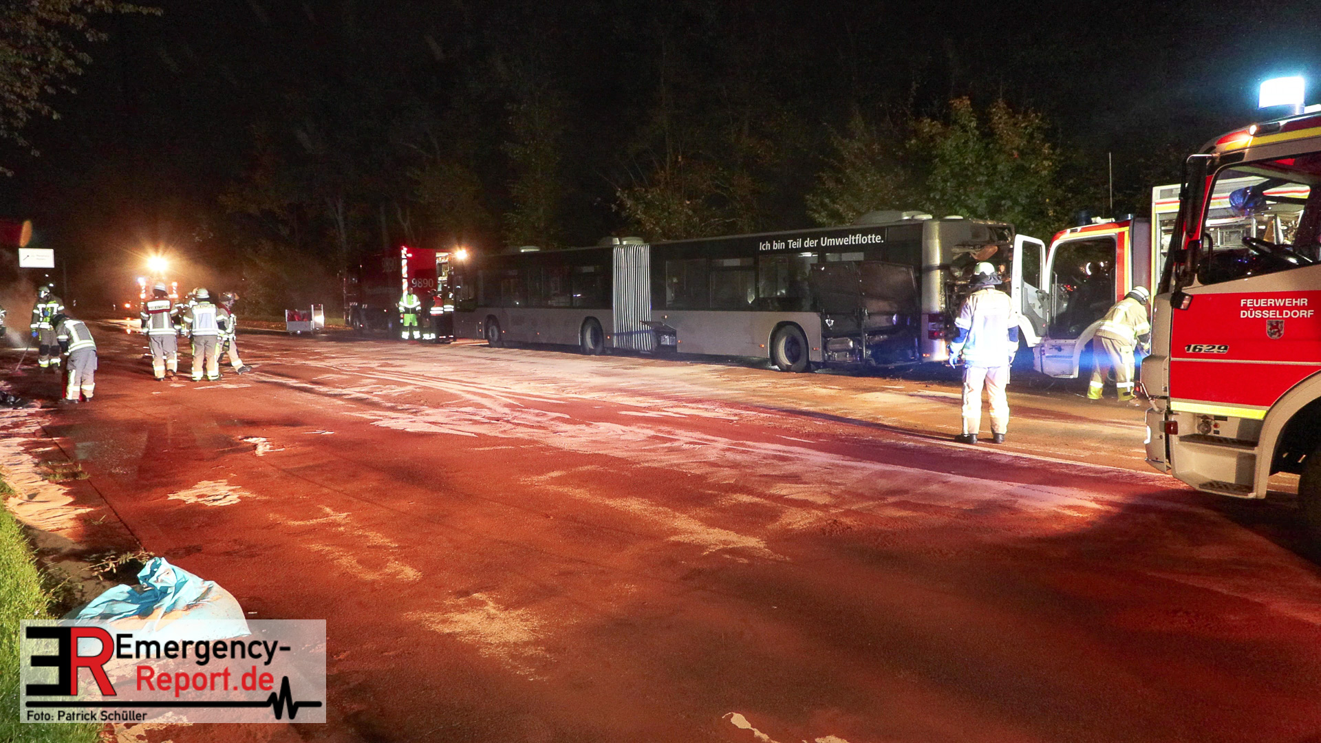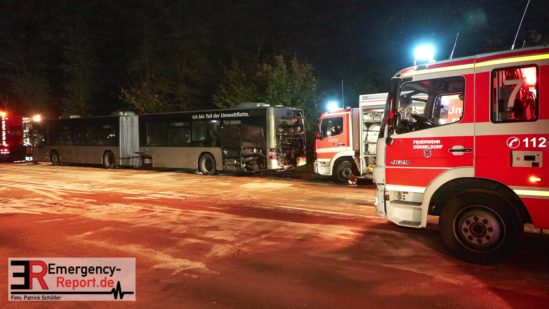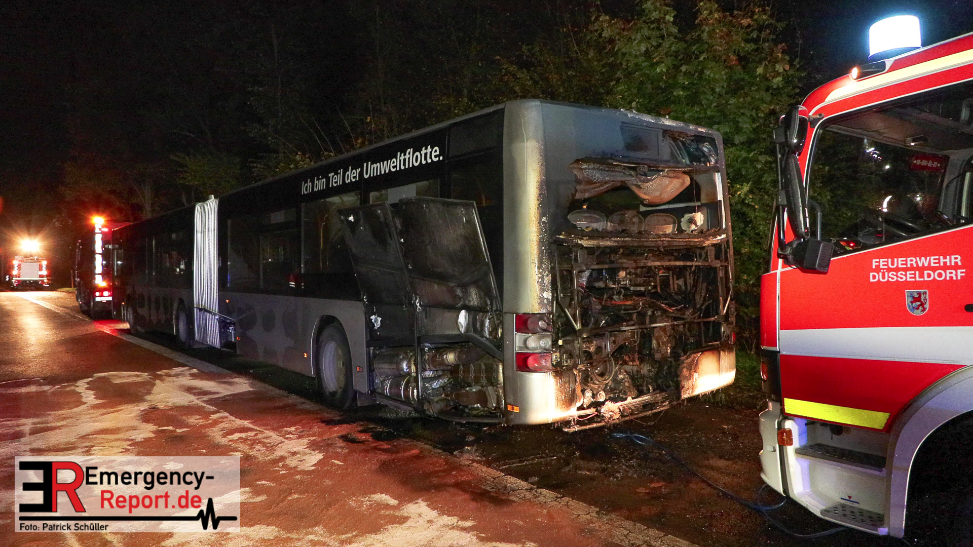 Am gestrigen Abend meldete ein Anrufer eine Rauchentwicklung aus dem Motorraum eines Linienbusses, welcher aufgrund eines technischen Defektes liegen geblieben war. Daraufhin alarmierte der Leitstellendisponent umgehend mehrere Einheiten der Feuerwehr Düsseldorf. Bei Eintreffen der Einsatzkräfte stand der Motorraum bereits im Vollbrand. Da der Bus im Rahmen einer Betriebsfahrt unterwegs war, befand sich ausschließlich der Fahrer an Bord, welcher beim Verlassen des Fahrzeuges geringe Mengen an giftigen Rauchgasen eingeatmet hatte. Notfallsanitäter des städtischen Rettungsdienstes führten eine medizinisch Erstversorgen durch und transportierten den Fahrer danach vorsorglich in ein Krankenhaus. Durch einen zuvor eingetretenen Defekt verlor der Bus auf einer Länge von mehreren Hundert Metern Betriebsmittel, welche mit circa 2000 Kilogramm Bindemittel aufgenommen wurden. Zudem musste der Tankinhalt des Fahrzeuges durch Spezialpumpen der Feuerwehr in ein Behältnis umgefüllt werden. Bei der Aufnahme und Entsorgung des Bindemittels unterstütze das Amt für Verkehrsmanagement mit mehreren Reinigungsfahrzeugen die Arbeiten der Feuerwehr. Während der Maßnahmen war die betroffene Fahrspur der Münchener Straße durch die Polizei vollgesperrt. Der schwerbeschädigte Bus wurde nach Beendigung aller Arbeiten durch den städtischen Verkehrsbetrieb zum Betriebshof geschleppt. Nach rund 120 Minuten fuhren auch die letzten der rund 50 Einsatzkräfte, darunter auch ehrenamtliche Helferinnen und Helfer der Freiwilligen Feuerwehr, zu ihren Wachen zurück.