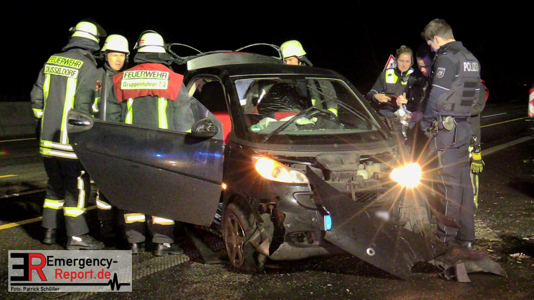 In der Nacht (04.01.2020) kam es auf der A46 in Fahrtrichtung Wuppertal, unmittelbar an der Ausfahrt Düsseldorf-Holthausen, zu einem Verkehrsunfall. Nach ersten offiziellen Informationen verunfallte ein Smart, beschädigte mehrere Baustellenabsperrungen und blieb anschließend auf der Seite liegen. Die Fahrerin wurde nach rettungsdienstlicher Behandlung unter notärztlicher Begleitung in ein Krankenhaus transportiert. Durch die Einsatzkräfte der Feuerwehr Düsseldorf wurde das Fahrzeug aufgerichtet.