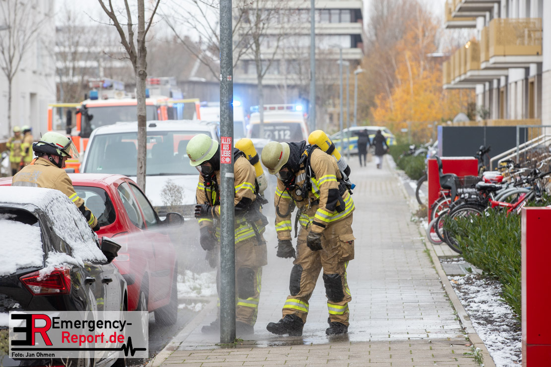 Die Leitstelle der Feuerwehr Düsseldorf erhielt am Montagmorgen durch mehrere Anrufer Kenntnis über ein Brandereignis in Oberkassel, welchem eine Explosion vorangegangen sein soll. Auf der Anfahrt zur Einsatzstelle konnte bereits eine starke Rauchentwicklung im Bereich der Einsatzstelle gesehen werden. Die ersten Einsatzkräfte trafen wenige Minuten nach der Alarmierung an der Einsatzstelle ein und fanden eine in Vollbrand stehende Erdgeschosswohnung vor. Die Flammen schlugen an der Gebäudefassade hoch bis über das Dachgeschoss und auch in die Straße hinein. Sofort befahl der Einsatzleiter einem Trupp die Durchführung eines sogenannten „Fensterimpulses“ zur Verhinderung der weiteren Schadensausbreitung. Dazu wird ein Löschwasserstrahl von außen durch ein geborstenes Fenster in die Brandwohnung eingebracht und das Feuer so eingedämmt. Parallel dazu wurden zwei Drehleitern in Stellung gebracht und eine Person aus den höher liegenden Wohnungen über diese gerettet. Die weiteren Bewohner des Hauses konnten über den Treppenraum das Gebäude selbstständig verlassen. Währenddessen gingen weitere Löschtrupps zur Brandbekämpfung in die brennende Wohnung vor. Im weiteren Einsatzverlauf wurden aus der Brandwohnung mehrere Gasflaschen und Gaskartuschen durch die Einsatzkräfte ins Freie gebracht. Zum Zeitpunkt des Brandes befand sich keine Person in der Brandwohnung. Die anderen Wohneinheiten wurden im Einsatzverlauf auf Ausbreitung von Rauch kontrolliert und mittels Hochleistungslüftern vom Brandrauch befreit. Vor Ort wurden durch den Rettungsdienst in einem nahegelegenen Foyer eines Bürogebäudes sechs Bewohner betreut. Eine Person wurde vom Notarzt versorgt, konnte aber nach ambulanter Behandlung vor Ort verbleiben. Die Netzgesellschaft trennte die Brandwohnung vom Stromnetz. Nach rund vier Stunden konnte die Einsatzstelle an die Kriminalpolizei übergeben werden und die letzten Einsatzkräfte konnten zu ihren Standorten zurückkehren.