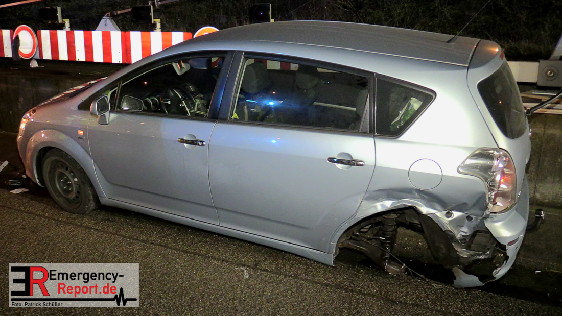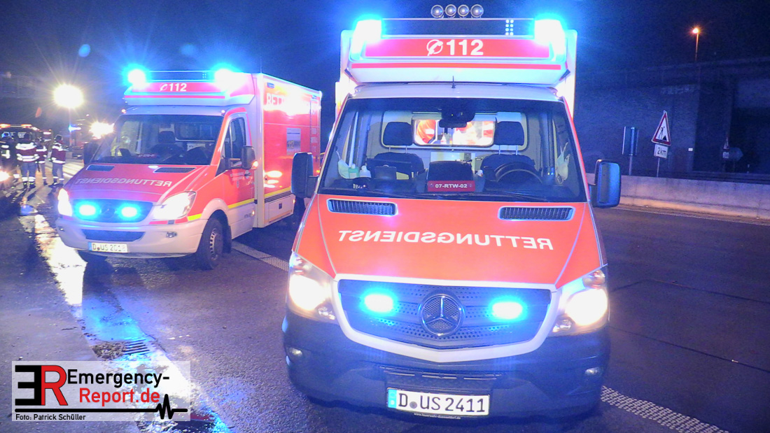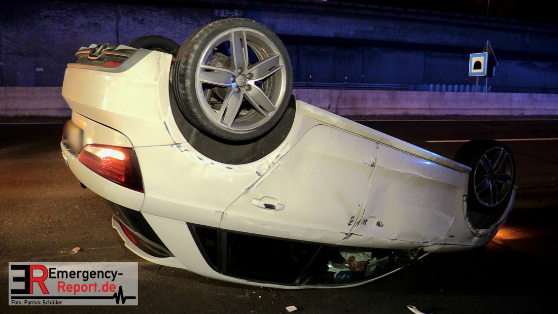 Bei einem Verkehrsunfall am späten Dienstagabend auf der A 46 in Düsseldorf bei Bilk verletzten sich zwei Menschen leicht. Es entstand ein Sachschaden in Höhe von rund 30.000 Euro. Nach bisherigen Ermittlungen war eine 35-jährige Frau mit ihrem Audi auf der A 46 in Richtung Wuppertal unterwegs. Zwischen der Anschlussstelle Bilk und der Anschlussstelle Wersten verlor sie die Kontrolle über ihren Pkw und fuhr in das Heck eines Toyota einer 40-Jährigen. Daraufhin geriet der Audi ins Schleudern, kippte durch den Aufprall auf die Seite, rutschte dann weiter auf der Fahrbahn und kam letztendlich auf dem Dach liegend zum Stehen. Durch den Aufprall verloren beide Autos Fahrzeugteile, wodurch wiederum ein nachfolgender Daimler beschädigt wurde. Rettungskräfte brachten die Fahrerin des Audi sowie den 23-jährigen Beifahrer aus dem Toyota leicht verletzt in ein Krankenhaus. Die Polizei schätzt den Sachschaden auf rund 30.000 Euro. Da ein erster Atemalkoholtest bei der 35-jährigen Audi-Fahrerin positiv war, wurden der Frau zwei Blutproben entnommen. Die Ermittlungen dauern an.