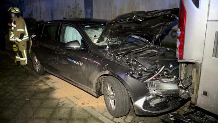 In der Nacht (05.12.2021) kam es in Düsseldorf, auf der Spangerstraße, zu einem Verkehrsunfall. Bei Eintreffen der ersten Einsatzkräfte stellte sich heraus, dass ein BMW, der einer Carsharing-Firma gehört, in einen geparkten Bus gekracht war. Der oder die Insassen flüchteten von der Unfallstelle. Ausgelaufene Betriebsmittel wurden abgestreut und die Batterie durch die Feuerwehr abgeklemmt. Es entstand erheblicher Sachschaden. Die Polizei hat die Ermittlungen aufgenommen.