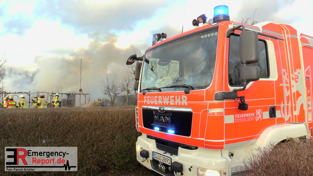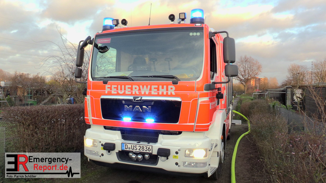 Über die Notrufnummer 112 erreichte die Leitstelle der Feuerwehr Düsseldorf die Meldung über einen Brand im Bereich der Kleingartenanlage in Hassels auf der Further Straße. Der Meldende berichtete das sich noch eine Person in der brennenden Laube befinden sollte. Da bereits auf der Anfahrt die Rauchentwicklung weithin sichtbar war, wurde bei Eintreffen an der Einsatzstelle umgehend eine Menschenrettung eingeleitet und der Löschangriff vorgenommen. Dabei stellte sich heraus das keine Personen mehr in der Gartenlaube waren. Durch das schnelle Eingreifen der Einsatzkräfte konnte eine weitere Ausbreitung der Flammen auf die benachbarten Lauben verhindert werden. Zwei Personen wurden von Notfallsanitätern untersucht. Eine Person kam mit leichten Brandverletzungen und einer Rauchgasvergiftung ins Krankenhaus.