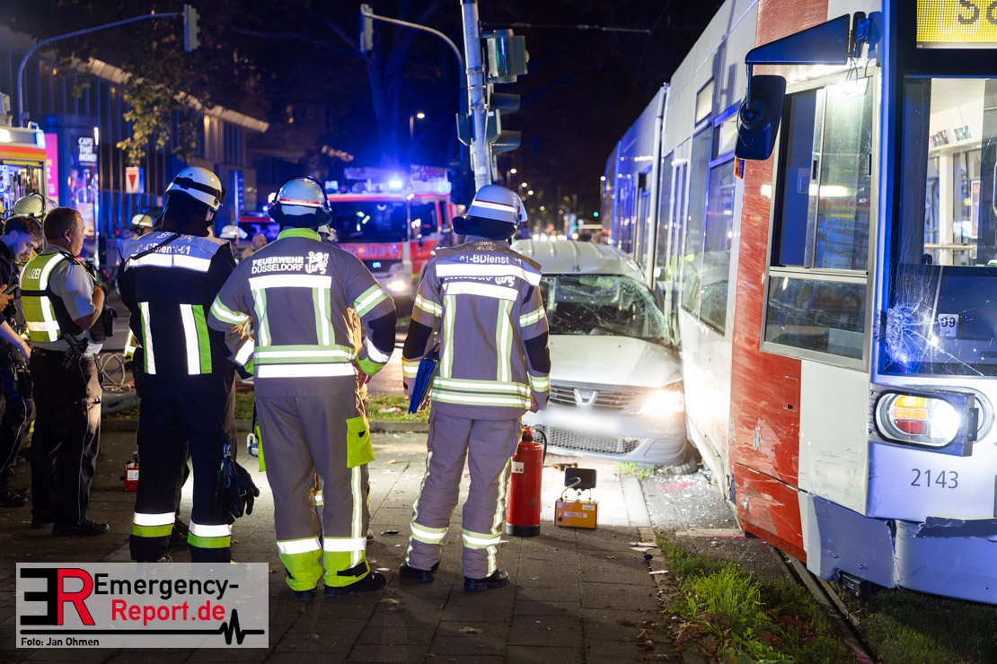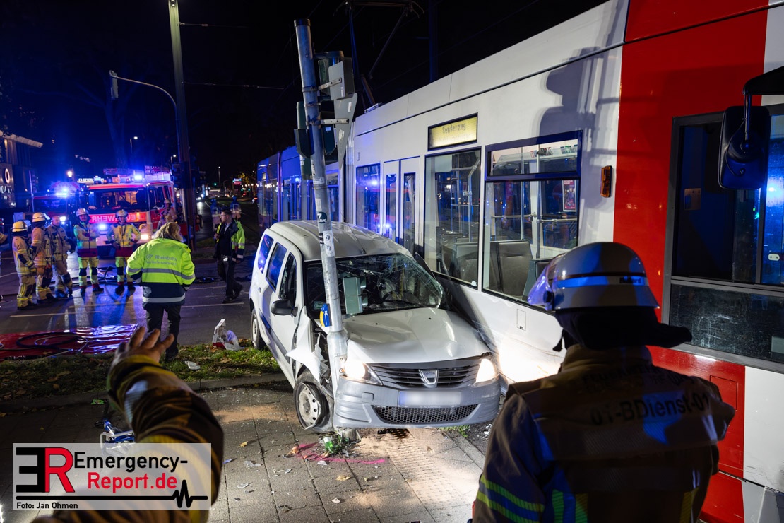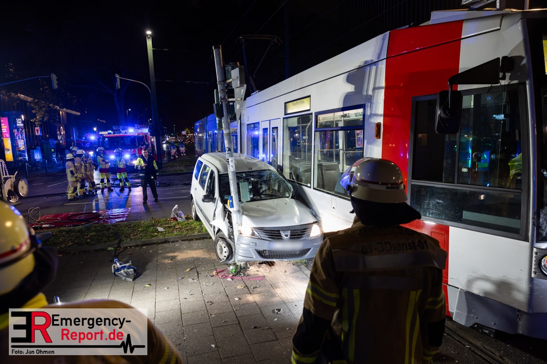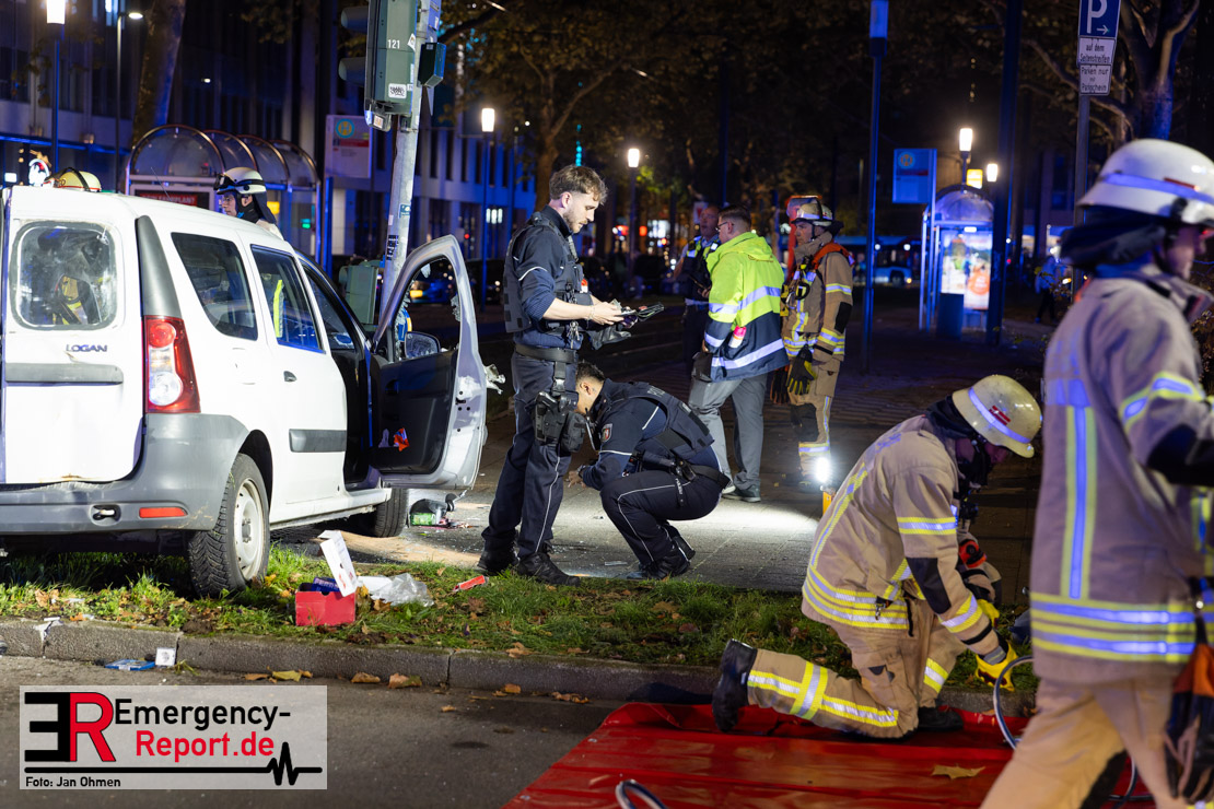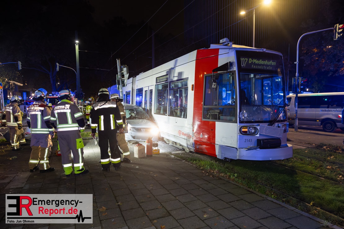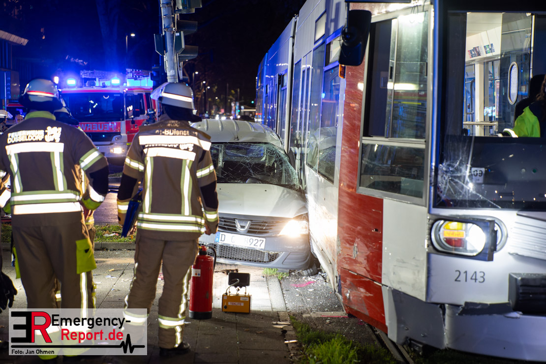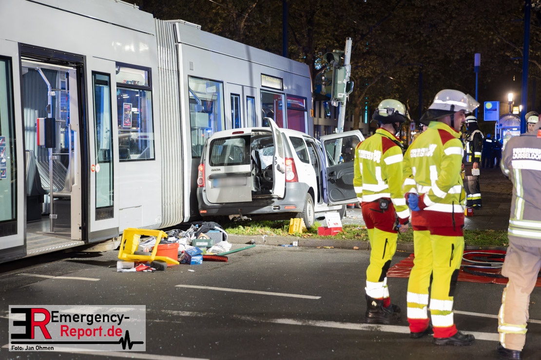 Dienstagabend um 19:23 Uhr meldete eine Person über den Notruf der Feuerwehr einen Verkehrsunfall zwischen einem PKW und einer Straßenbahn im Kreuzungsbereich in Stadtmitte. Bereits fünf Minuten nach der Alarmierung trafen die ersten Einsatzkräfte an der Unfallstelle ein und bestätigten die Meldung. Aus bislang ungeklärter Ursache war ein PKW mit einer Straßenbahn kollidiert. Der PKW wurde zwischen der Straßenbahn und einer Laterne eingeklemmt. Der Fahrer des PKWs wurde dadurch in seinem Fahrzeug eingeschlossen und verletzt und musste durch die Heckklappe von der Feuerwehr befreit werden. Ein Ersthelfer verletzte sich leicht an der Hand, als er mit dieser die Scheibe des verunfallten PKW einschlug. Ein Notarzt sowie Notfallsanitäter betreuten und untersuchten die verletzten Personen, von denen eine in ein Krankenhaus transportiert wurde. Der Fahrer der Straßenbahn wurde durch den Notfallmanager der Rheinbahn betreut. Auslaufende Betriebsmittel aus dem PKW wurden abgestreut und die Fahrzeugbatterie am verunfallten PKW wurde abgeklemmt. Zur Ermittlung der Unfallursache hat die Polizei ihre Arbeit aufgenommen. Nach gut einer Stunde rückten die letzten Kräfte der Feuerwehr zu ihren Standorten wieder ein.