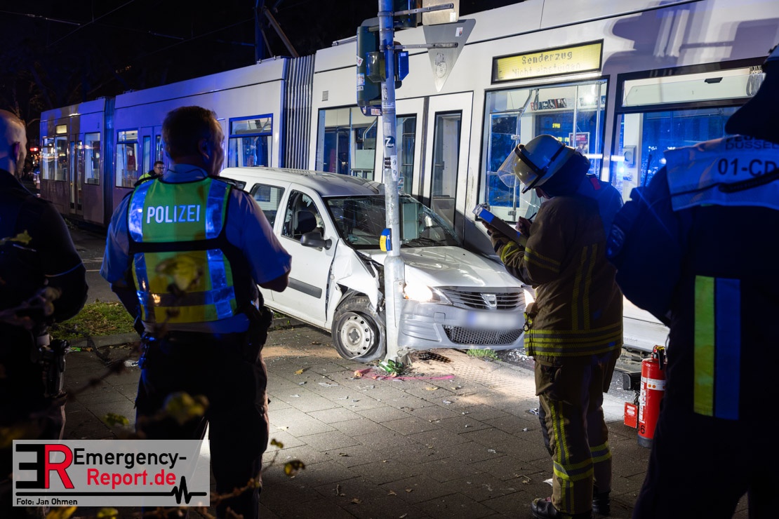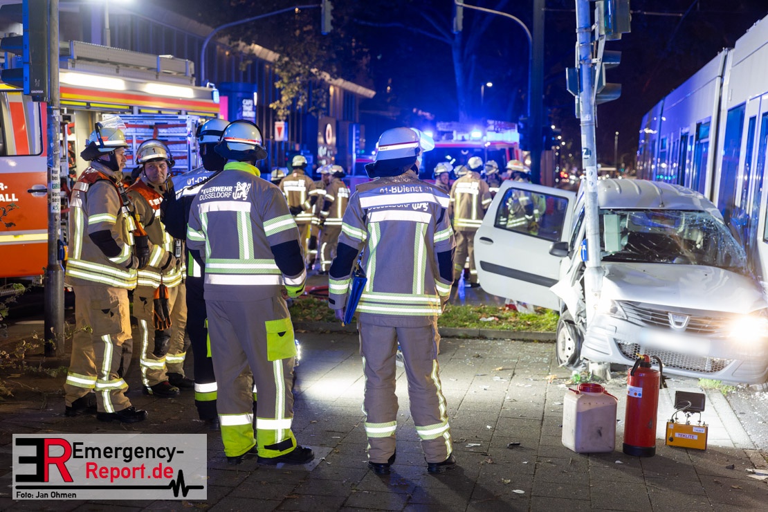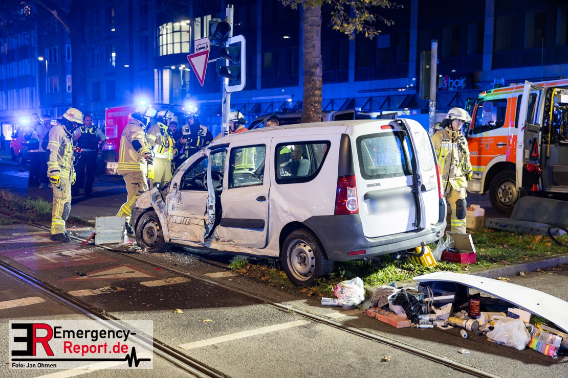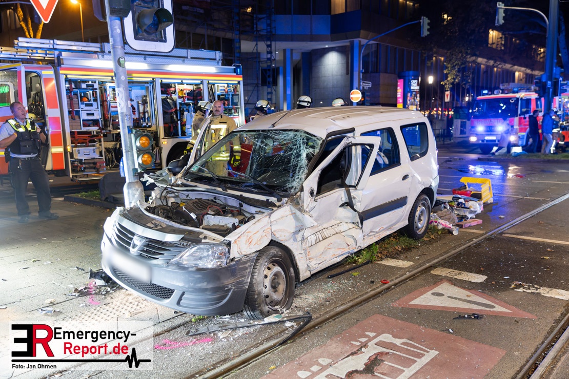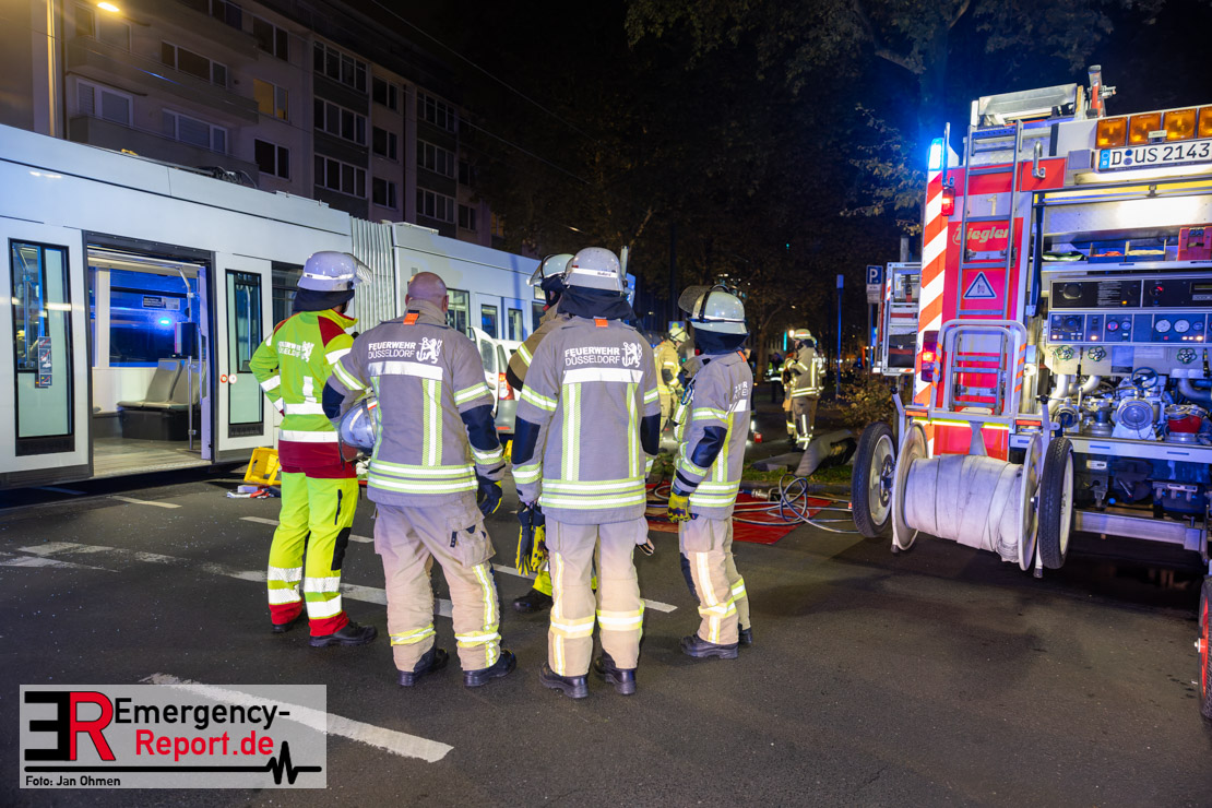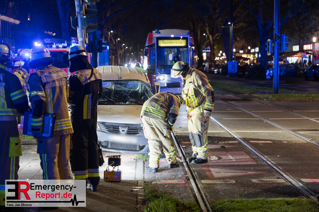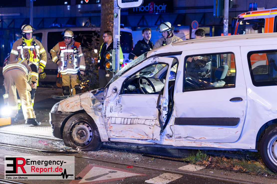 Dienstagabend um 19:23 Uhr meldete eine Person über den Notruf der Feuerwehr einen Verkehrsunfall zwischen einem PKW und einer Straßenbahn im Kreuzungsbereich in Stadtmitte. Bereits fünf Minuten nach der Alarmierung trafen die ersten Einsatzkräfte an der Unfallstelle ein und bestätigten die Meldung. Aus bislang ungeklärter Ursache war ein PKW mit einer Straßenbahn kollidiert. Der PKW wurde zwischen der Straßenbahn und einer Laterne eingeklemmt. Der Fahrer des PKWs wurde dadurch in seinem Fahrzeug eingeschlossen und verletzt und musste durch die Heckklappe von der Feuerwehr befreit werden. Ein Ersthelfer verletzte sich leicht an der Hand, als er mit dieser die Scheibe des verunfallten PKW einschlug. Ein Notarzt sowie Notfallsanitäter betreuten und untersuchten die verletzten Personen, von denen eine in ein Krankenhaus transportiert wurde. Der Fahrer der Straßenbahn wurde durch den Notfallmanager der Rheinbahn betreut. Auslaufende Betriebsmittel aus dem PKW wurden abgestreut und die Fahrzeugbatterie am verunfallten PKW wurde abgeklemmt. Zur Ermittlung der Unfallursache hat die Polizei ihre Arbeit aufgenommen. Nach gut einer Stunde rückten die letzten Kräfte der Feuerwehr zu ihren Standorten wieder ein.
