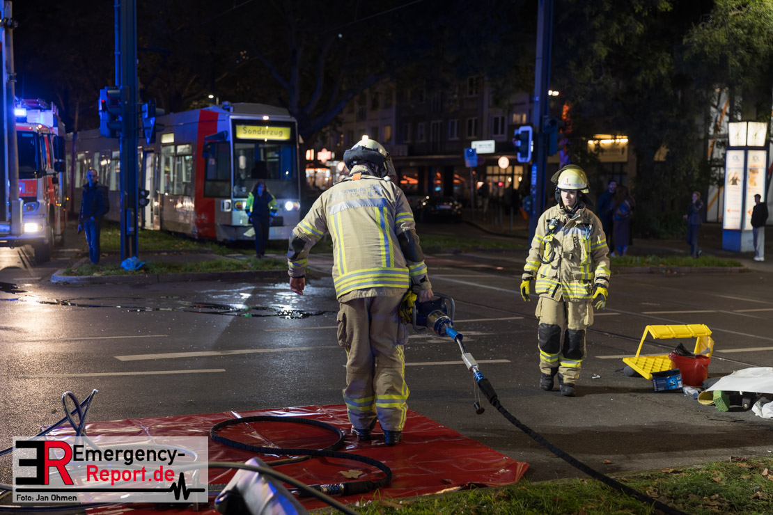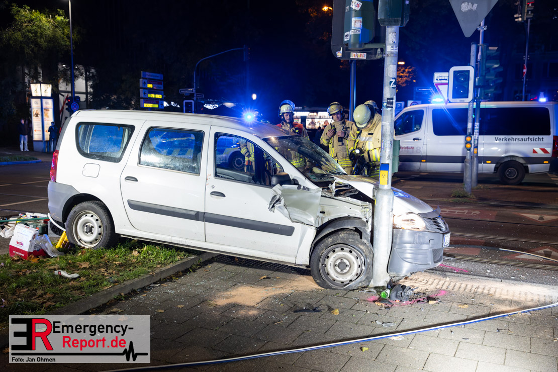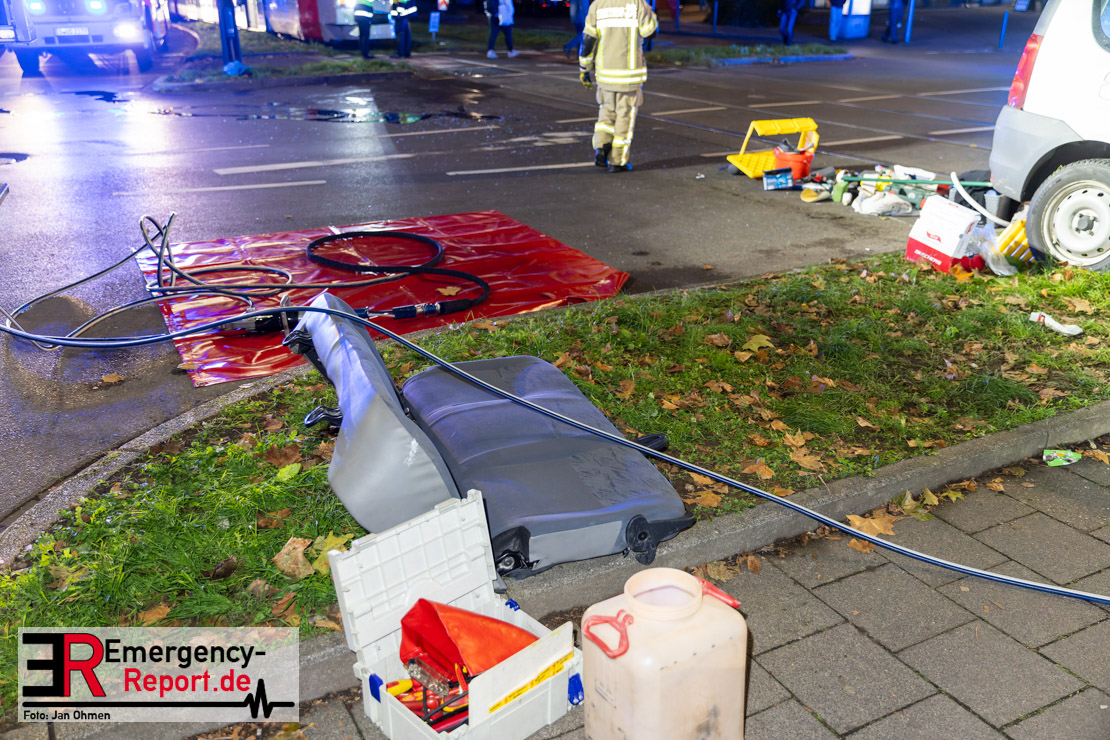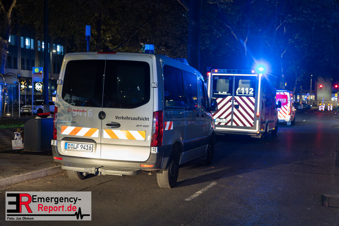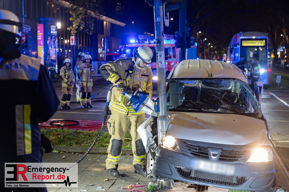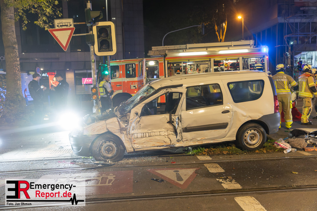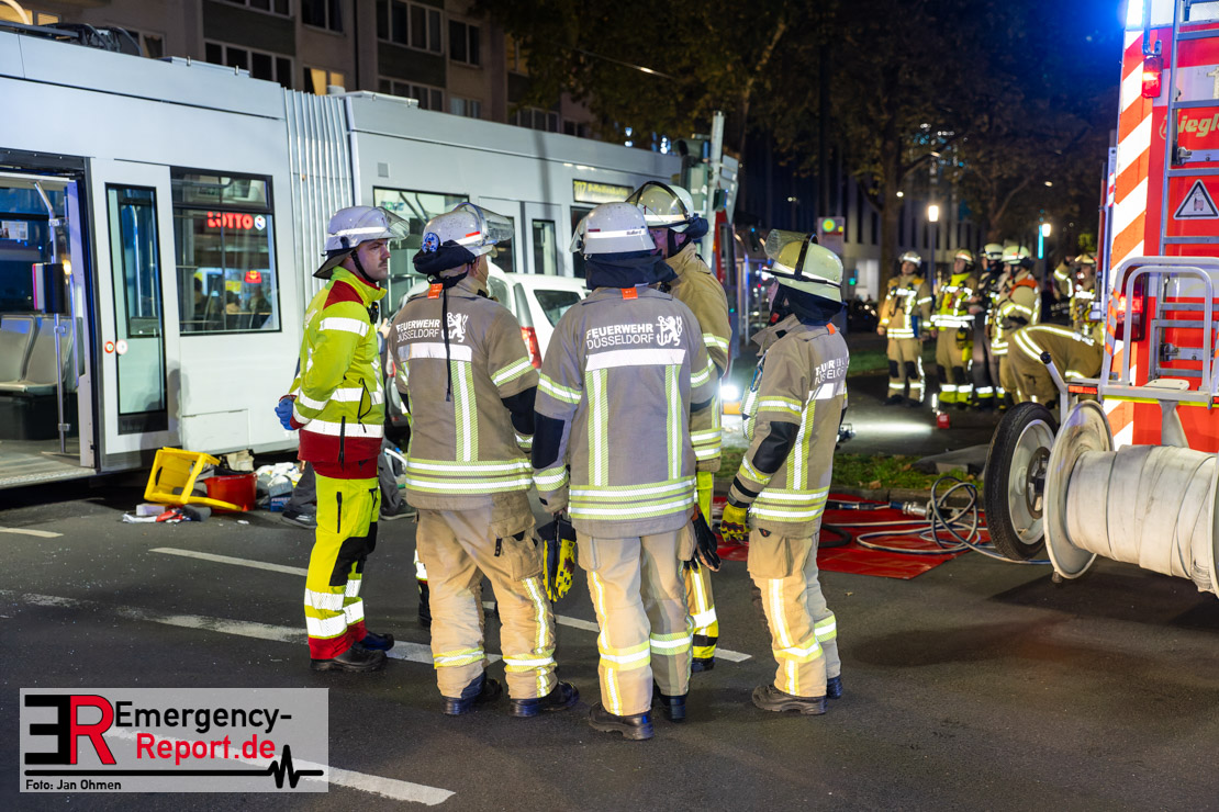 Dienstagabend um 19:23 Uhr meldete eine Person über den Notruf der Feuerwehr einen Verkehrsunfall zwischen einem PKW und einer Straßenbahn im Kreuzungsbereich in Stadtmitte. Bereits fünf Minuten nach der Alarmierung trafen die ersten Einsatzkräfte an der Unfallstelle ein und bestätigten die Meldung. Aus bislang ungeklärter Ursache war ein PKW mit einer Straßenbahn kollidiert. Der PKW wurde zwischen der Straßenbahn und einer Laterne eingeklemmt. Der Fahrer des PKWs wurde dadurch in seinem Fahrzeug eingeschlossen und verletzt und musste durch die Heckklappe von der Feuerwehr befreit werden. Ein Ersthelfer verletzte sich leicht an der Hand, als er mit dieser die Scheibe des verunfallten PKW einschlug. Ein Notarzt sowie Notfallsanitäter betreuten und untersuchten die verletzten Personen, von denen eine in ein Krankenhaus transportiert wurde. Der Fahrer der Straßenbahn wurde durch den Notfallmanager der Rheinbahn betreut. Auslaufende Betriebsmittel aus dem PKW wurden abgestreut und die Fahrzeugbatterie am verunfallten PKW wurde abgeklemmt. Zur Ermittlung der Unfallursache hat die Polizei ihre Arbeit aufgenommen. Nach gut einer Stunde rückten die letzten Kräfte der Feuerwehr zu ihren Standorten wieder ein.