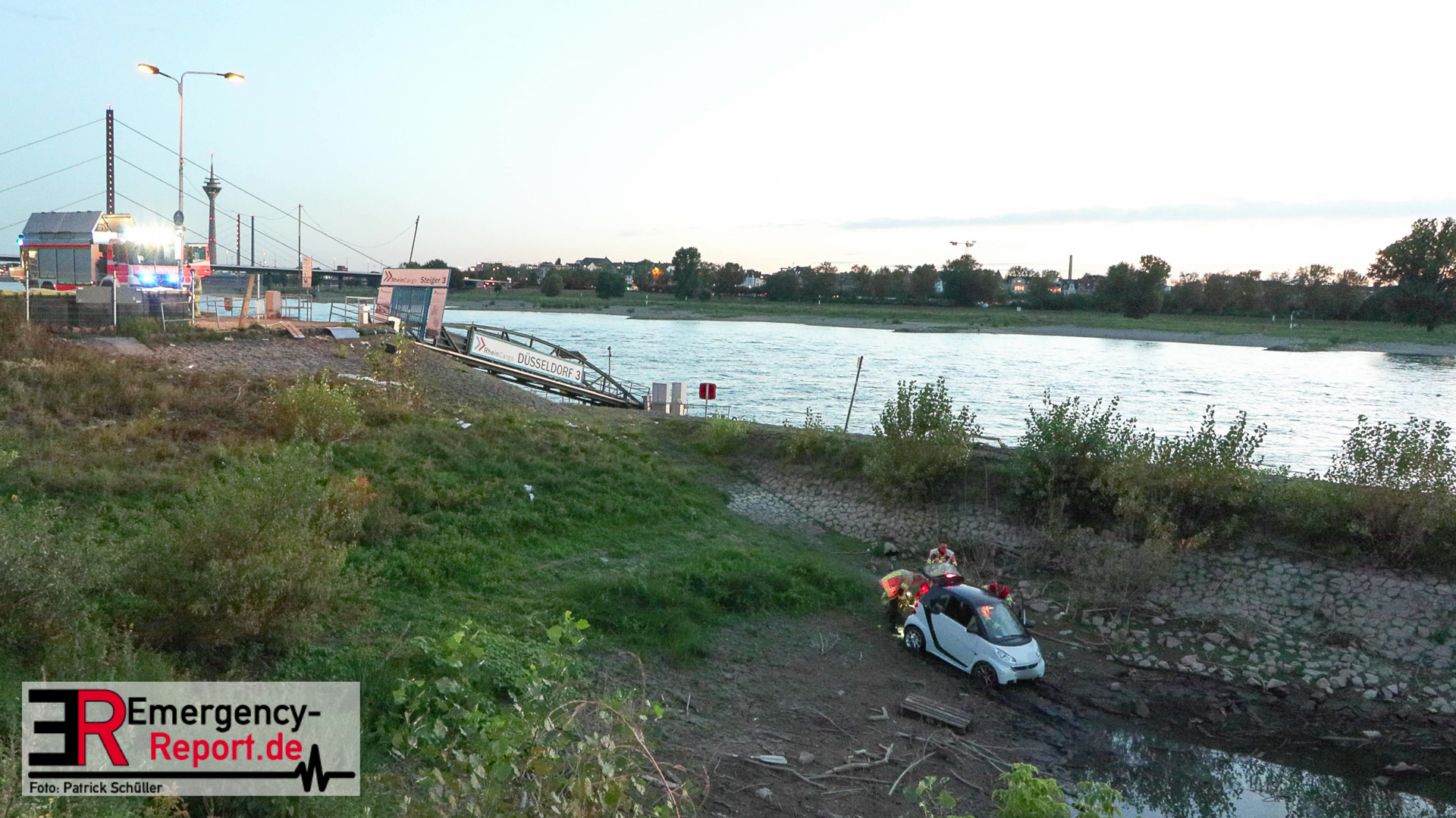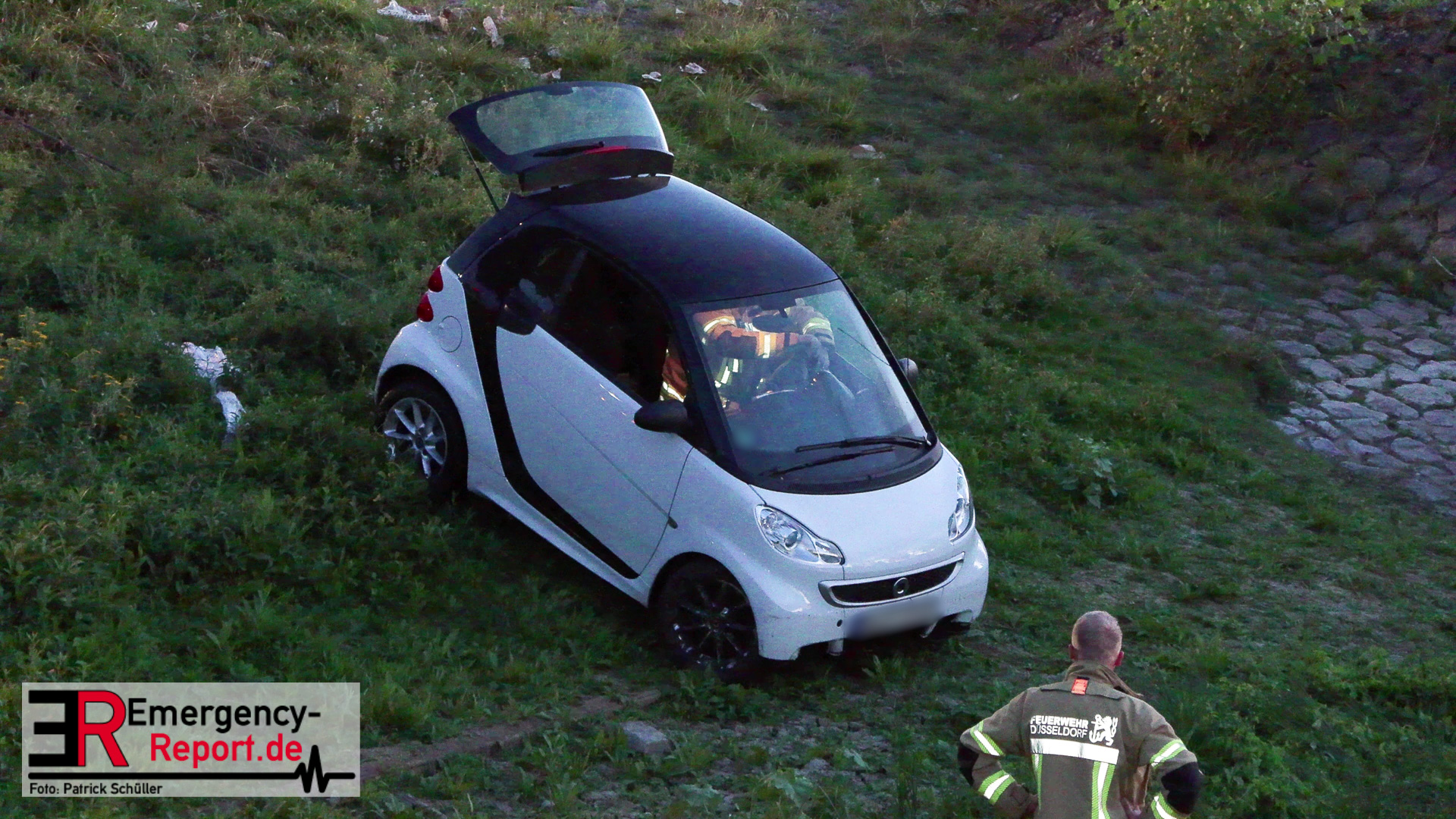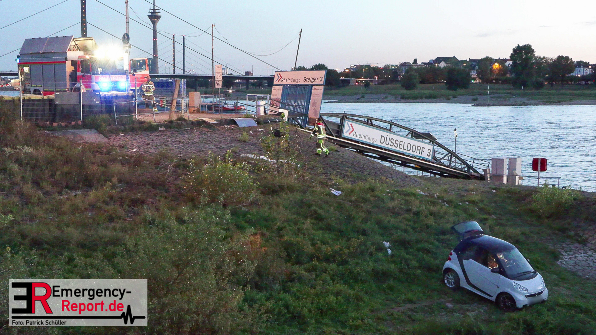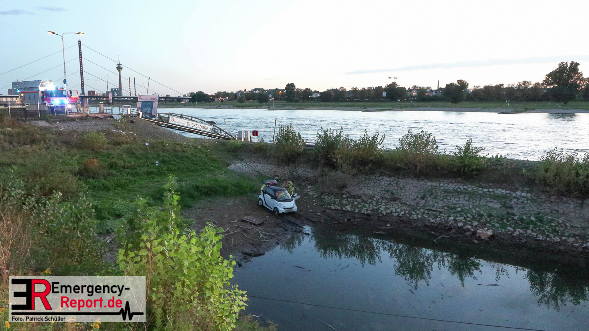 Am Abend des 08.09.2024 kam es in Düsseldorf, am Robert-Lehr-Ufer, zu einem kuriosen Unfall. Ein Smart war eine steile Uferböschung hinuntergerollt und im Wasser zum Stehen gekommen. Das Auto wurde durch die Feuerwehr, mittels Seilwinde eines Rüstwagens, geborgen. Verletzt wurde niemand.