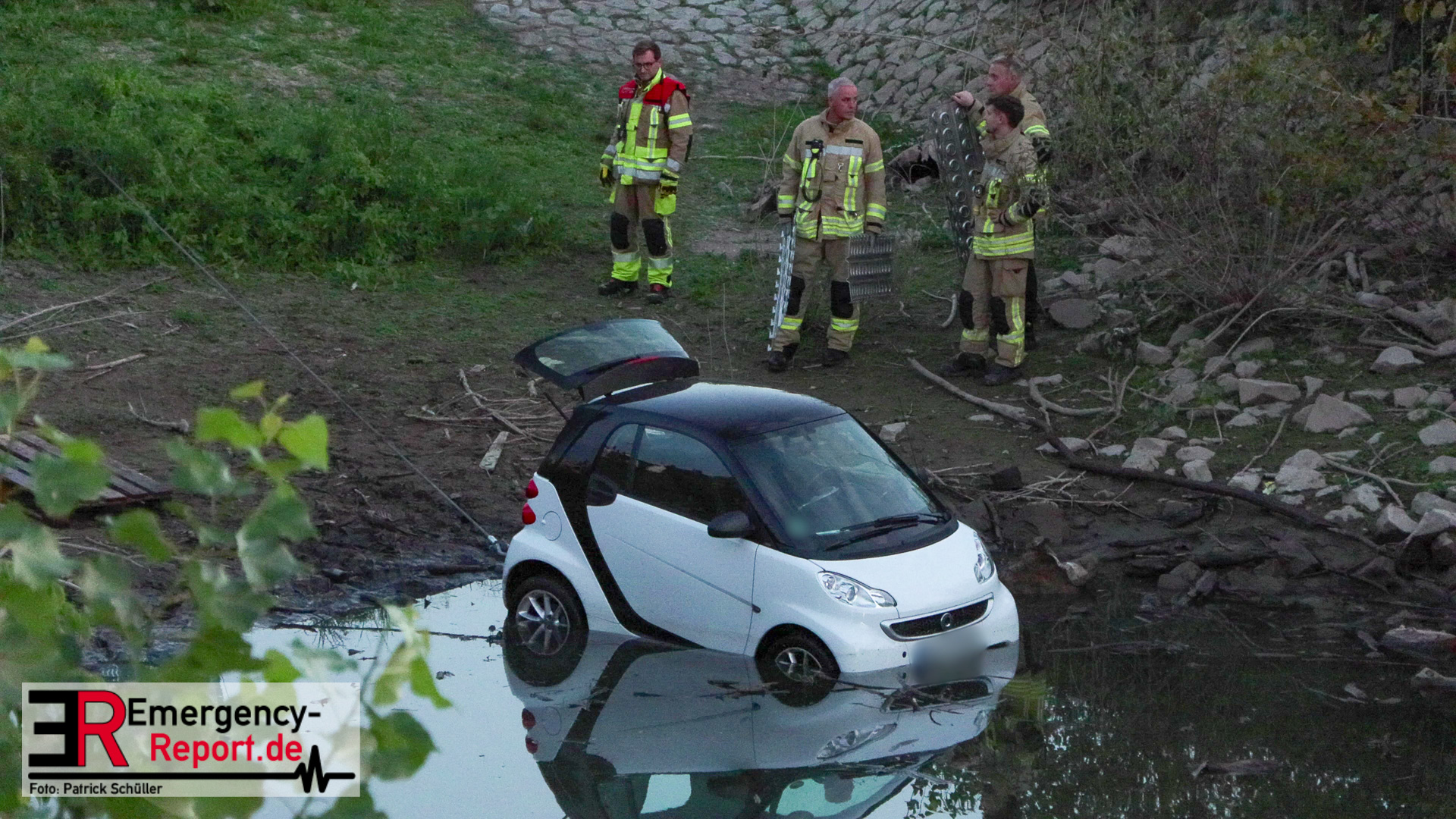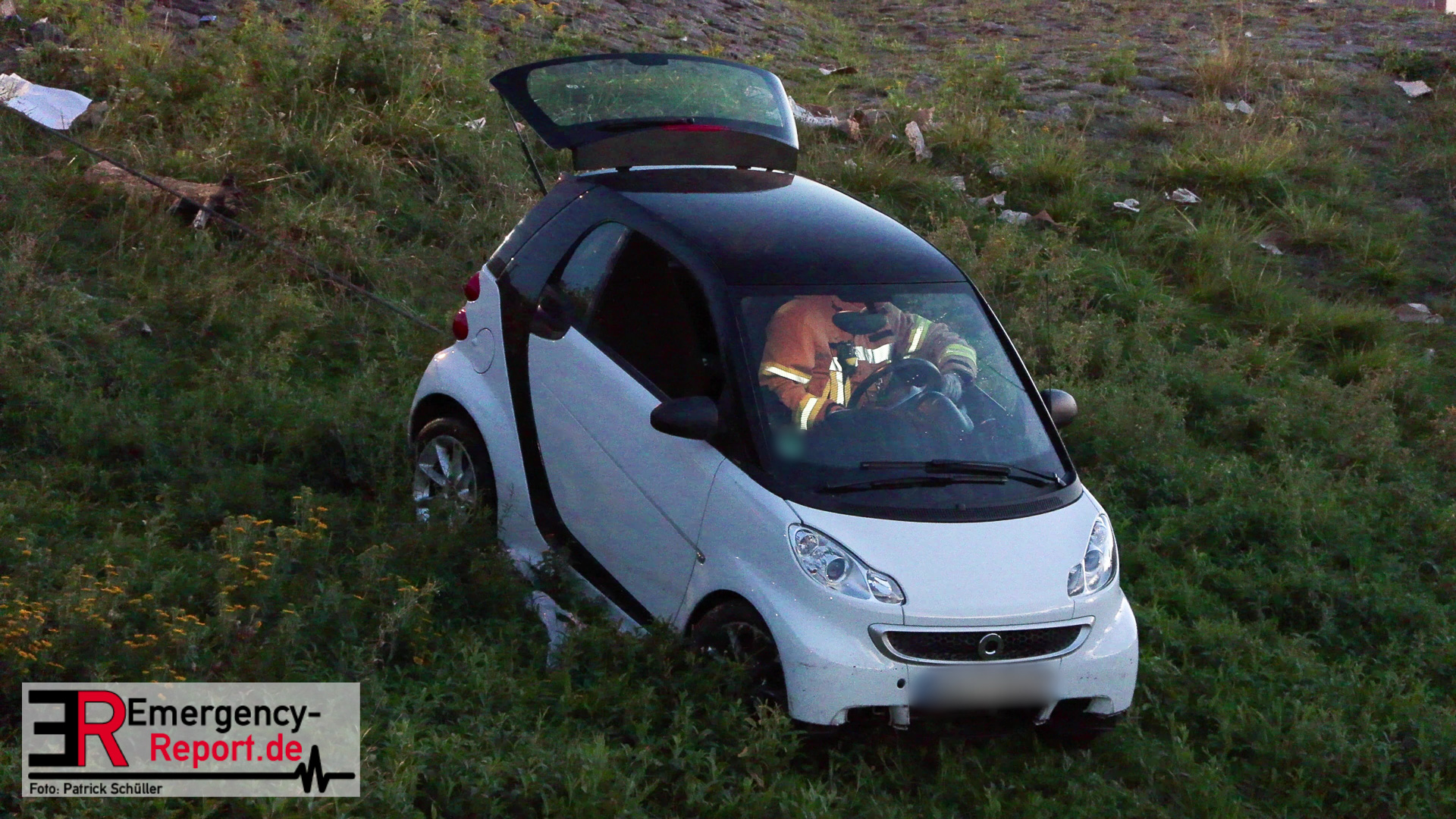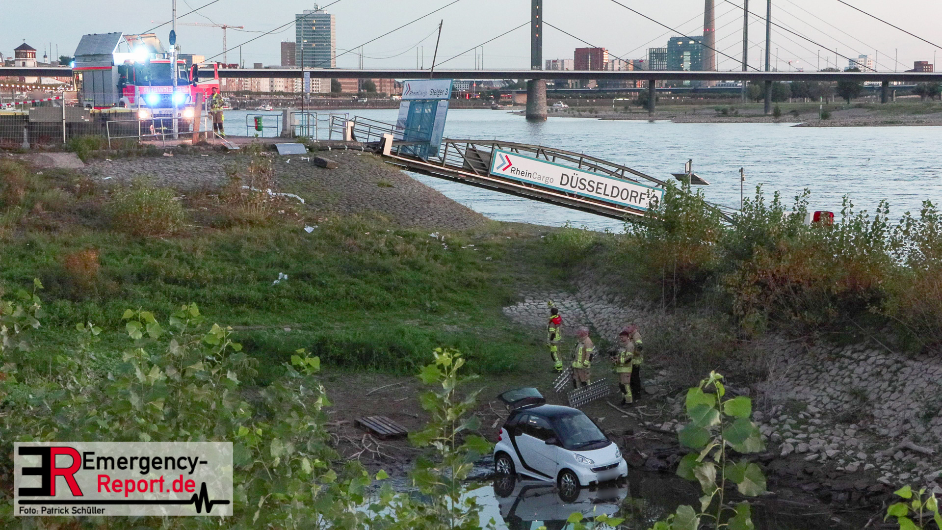 Am Abend des 08.09.2024 kam es in Düsseldorf, am Robert-Lehr-Ufer, zu einem kuriosen Unfall. Ein Smart war eine steile Uferböschung hinuntergerollt und im Wasser zum Stehen gekommen. Das Auto wurde durch die Feuerwehr, mittels Seilwinde eines Rüstwagens, geborgen. Verletzt wurde niemand.