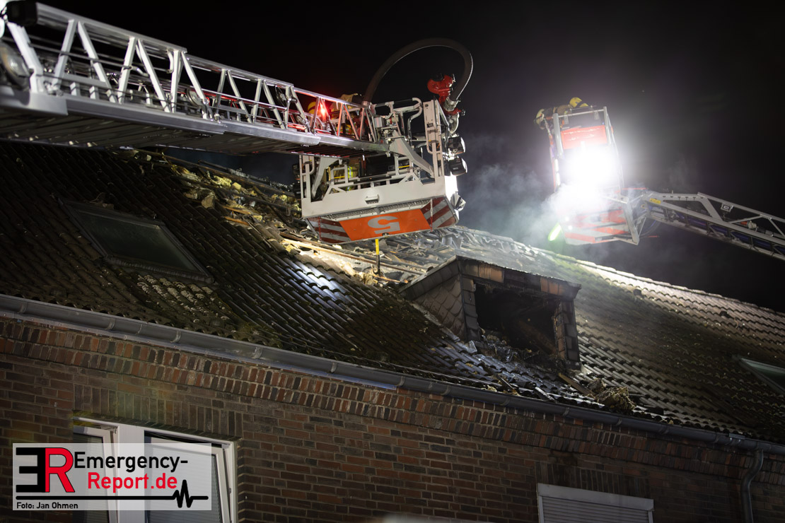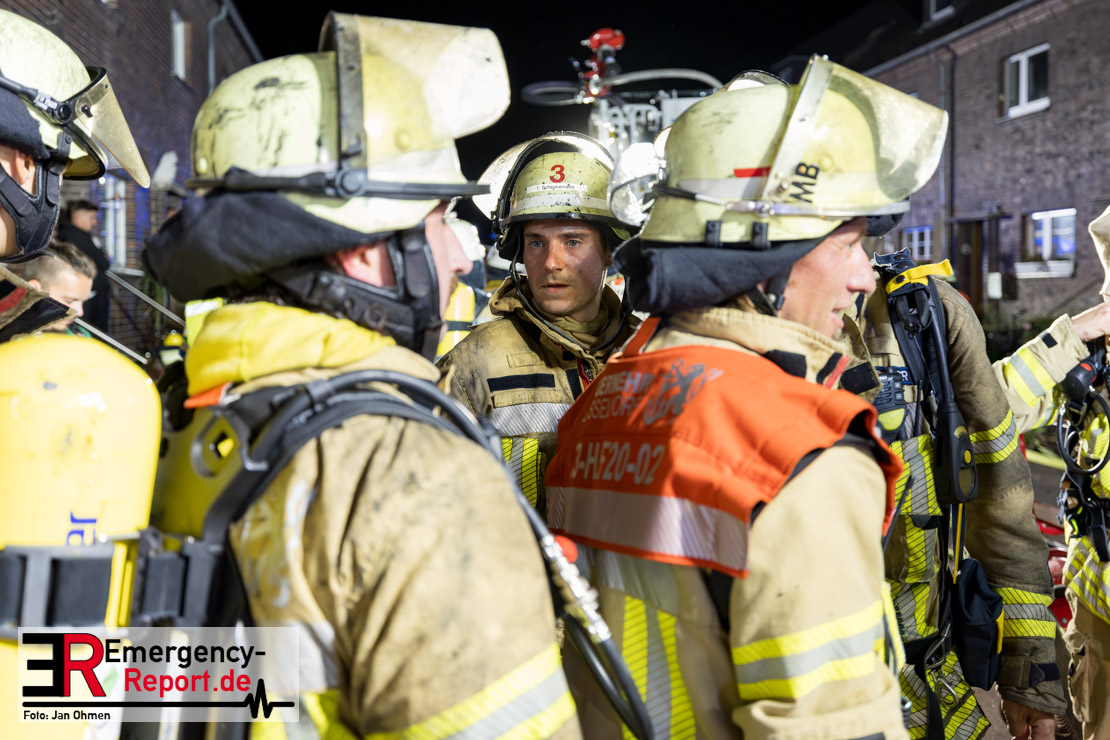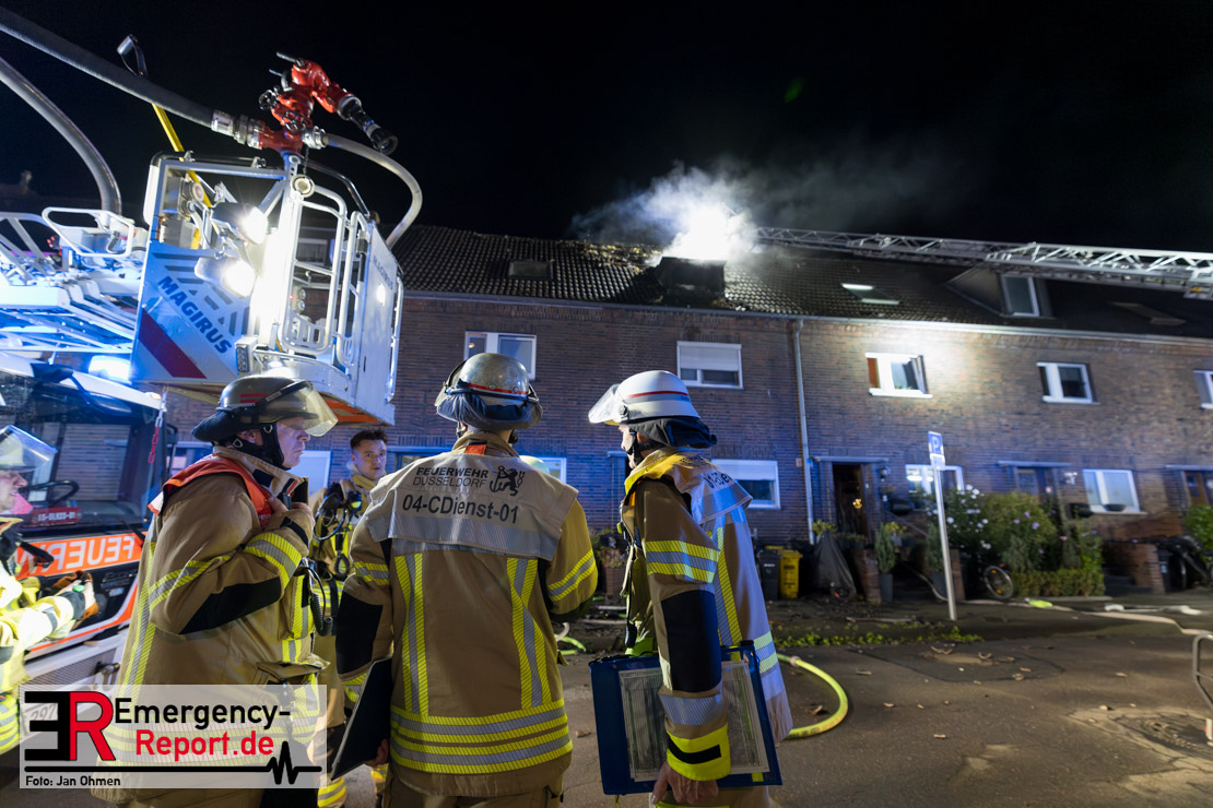 Gegen 22:30 erreichte die Leitstelle der Feuerwehr Düsseldorf ein Notruf, dass ein Dachstuhl eines Einfamilienhauses in Reihenbebauung in Brand geraten sei. Als die ersten Einsatzkräfte bereits wenige Minuten nach Alarmierung der an Brackeler Straße eintrafen, stellte sich die Situation wie folgt dar: Der Dachstuhle eines Einfamilienhauses brannte lichterloh. Das Feuer drohte auf die beiden Nachbargebäude überzugreifen. Sofort entsandte der Einsatzleiter mehrere Trupps unter Atemschutz zur Brandbekämpfung im inneren des Dachgeschosses und ließ zwei Drehleitern von außen das Feuer löschen. Aufgrund der möglichen Brandausbreitung wurden die Bewohner der Nachbargebäude aus ihren Häusern evakuiert. Durch die schnell eingeleiteten Löschmaßnahmen konnte ein Übergreifen des Feuers auf die Nachbargebäude aber verhindert werden. Die Bewohner ´der Nachbargebäude kamen für die Dauer des Einsatzes bei Nachbarn unter. Die Bewohnerin des brennenden Hauses wurde währenddessen Rettungsdienst der Landeshauptstadt untersucht und mit Verdacht auf eine Rauchgasvergiftung zur weiteren medizinischen Versorgung in ein nahegelegenes Krankenhaus transportiert. Nach gut 30 Minuten zeigten die massiven Löschmaßnahmen Wirkung und das Feuer war unter Kontrolle. Anschließend wurden durch die Feuerwehr umfangreiche Nachlöscharbeiten durchgeführt, welche sich sehr aufwendig gestalteten, da das Dach von innen und außen durch Einsatzkräfte geöffnet werden musste. Nach dreieinhalb Stunden konnten die 60 haupt- und ehrenamtlichen Einsatzkräfte der Feuerwehr Düsseldorf und des Rettungsdienstes der Landeshauptstadt zu ihren Standorten zurückkehren. Die Kriminalpolizei hat die Ermittlungen zur Brandursache aufgenommen.