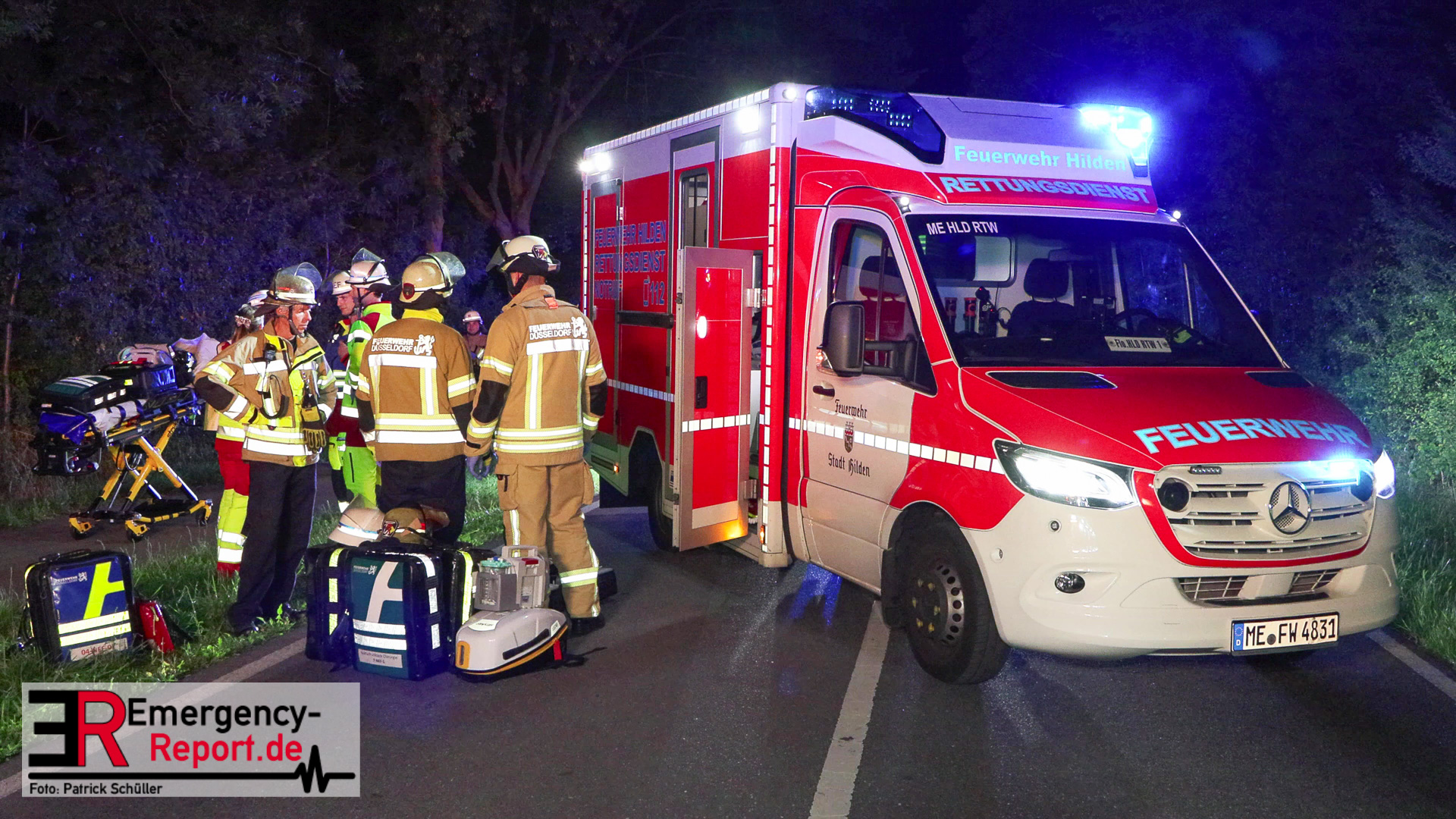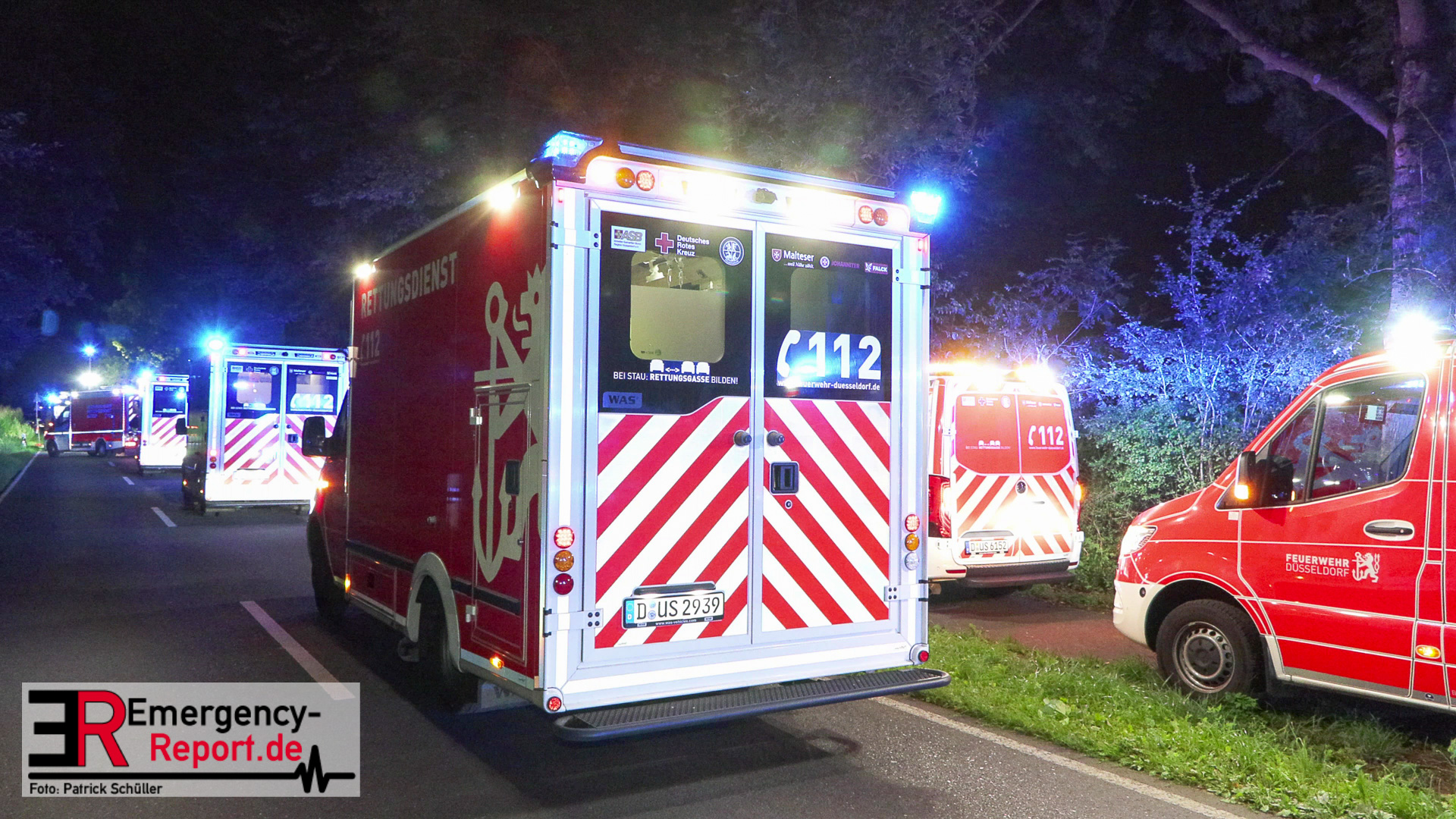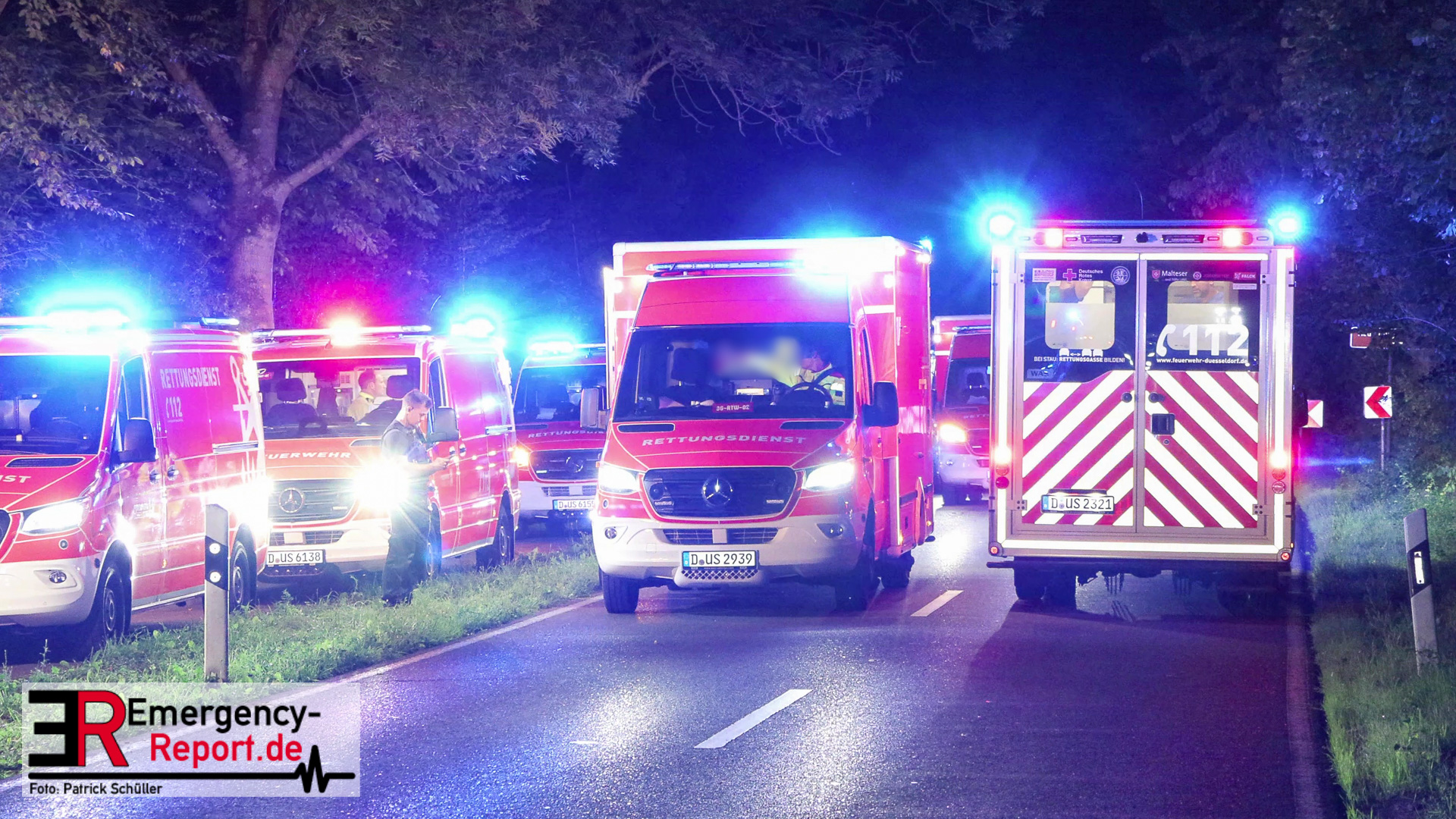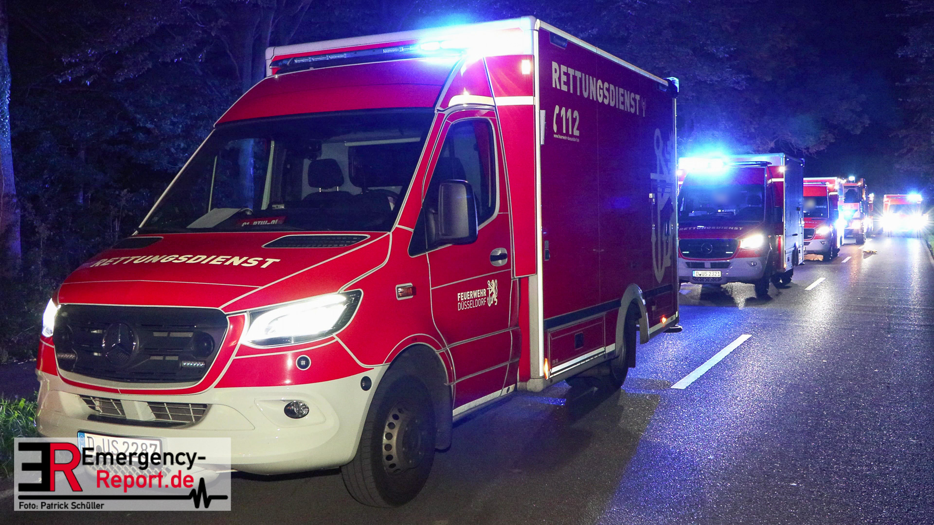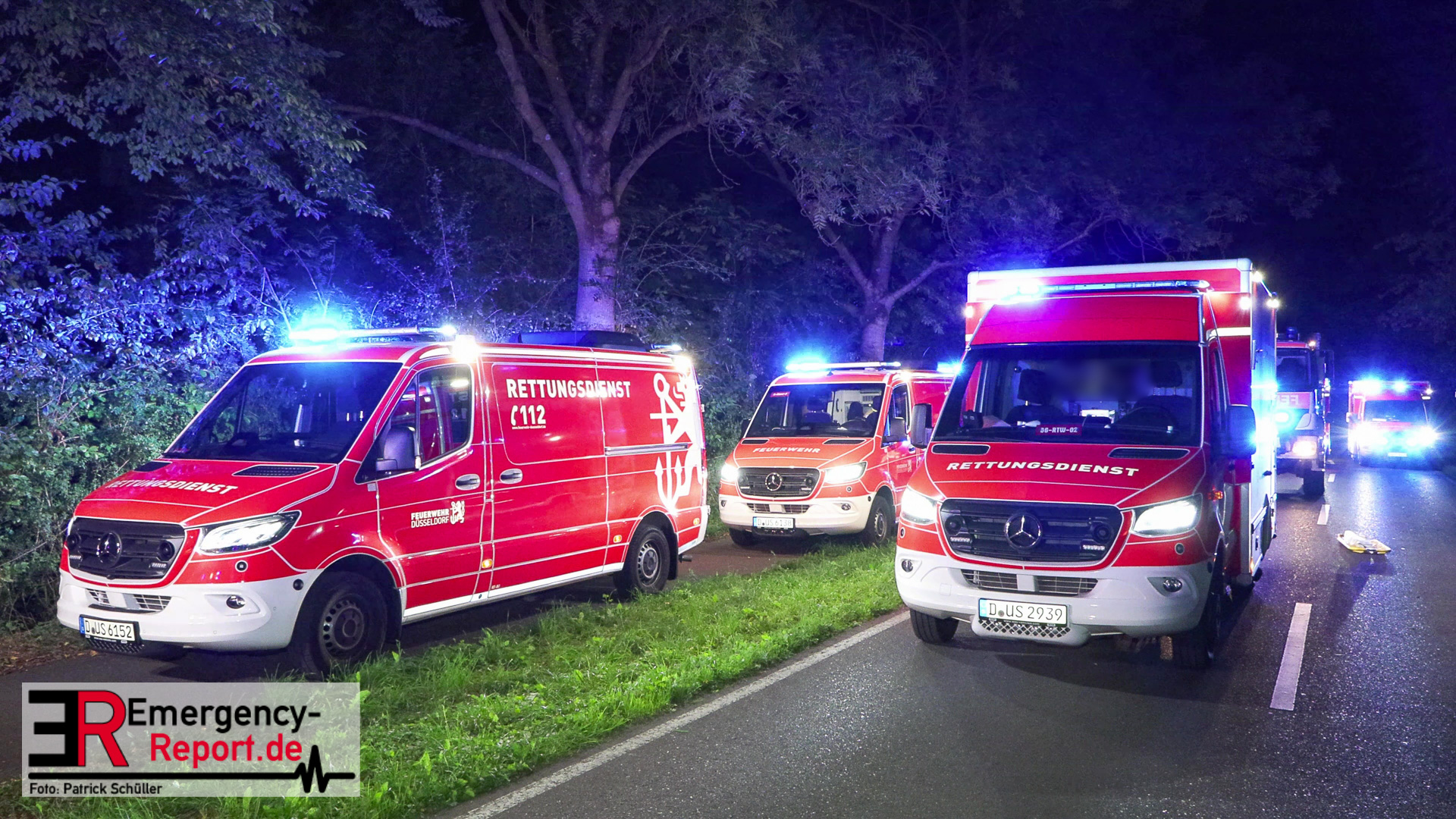 Am späten Samstagabend erreichte die Leitstelle der Feuerwehr Düsseldorf die Meldung über einen Verkehrsunfall auf dem Baumberger Weg im Stadtteil Urdenbach. Umgehend entsandte die Leitstelle mehrere Einheiten von Feuerwehr und Rettungsdienst zur Einsatzstelle. Da sich die Einsatzstelle in der Nähe der Stadtgrenze zu Monheim am Rhein befand, waren ebenfalls Einsatzkräfte aus Monheim am Einsatz beteiligt. Als die ersten Einsatzkräfte nur wenige Minuten später vor Ort eintrafen, fanden sie einen Pkw nach einem Alleinunfall vor. Die fünf Fahrzeuginsassen befanden sich bereits außerhalb des Fahrzeugs. Vier von ihnen waren lebensgefährlich verletzt, für einen Menschen kam bereits jede Hilfe zu spät. Sofort versorgten die Notärzte und Notfallsanitäter die Verletzten. Zur Unterstützung forderte der Einsatzleiter weitere Rettungsdiensteinheiten sowie einen Rettungshubschrauber aus Dortmund an. Trotz der sofort eingeleiteten medizinischen Versorgung verstarb eine weitere Person noch an der Einsatzstelle. Die anderen drei Fahrzeuginsassen transportierte der Rettungsdienst in Düsseldorfer Krankenhäuser.