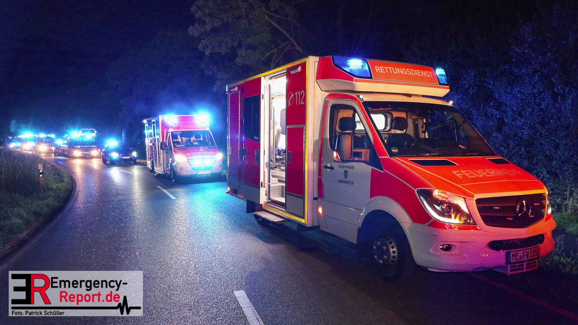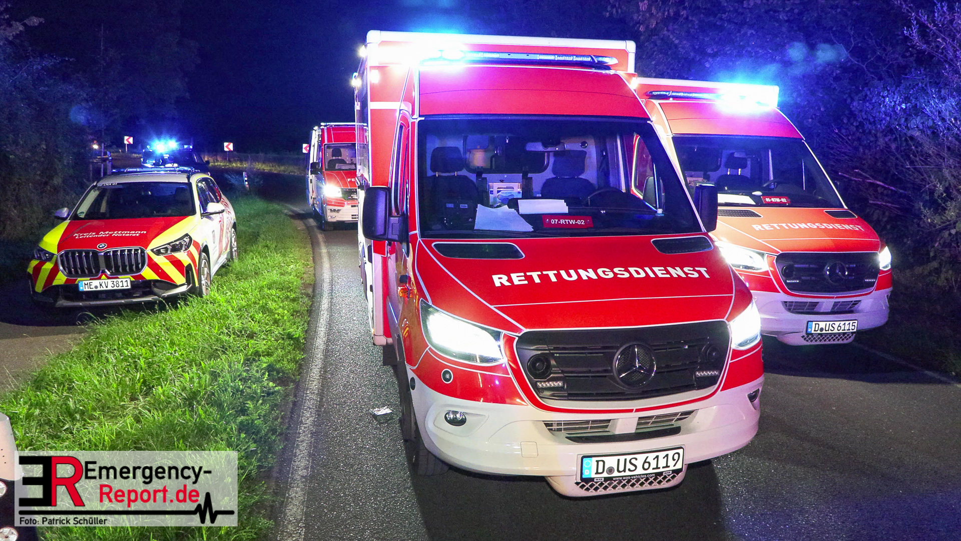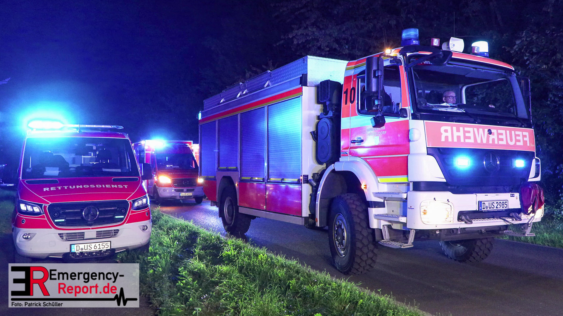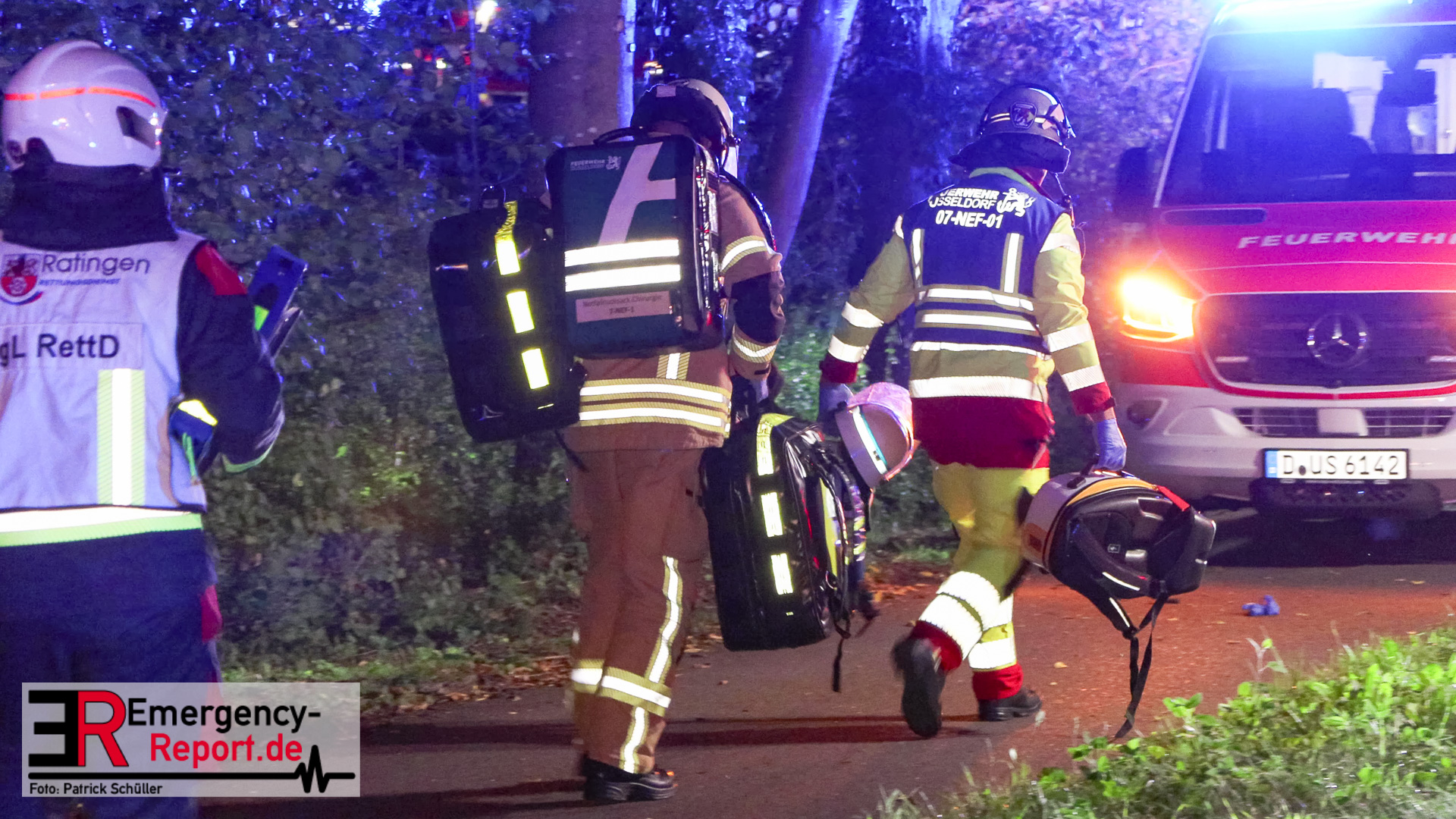 Am späten Samstagabend erreichte die Leitstelle der Feuerwehr Düsseldorf die Meldung über einen Verkehrsunfall auf dem Baumberger Weg im Stadtteil Urdenbach. Umgehend entsandte die Leitstelle mehrere Einheiten von Feuerwehr und Rettungsdienst zur Einsatzstelle. Da sich die Einsatzstelle in der Nähe der Stadtgrenze zu Monheim am Rhein befand, waren ebenfalls Einsatzkräfte aus Monheim am Einsatz beteiligt. Als die ersten Einsatzkräfte nur wenige Minuten später vor Ort eintrafen, fanden sie einen Pkw nach einem Alleinunfall vor. Die fünf Fahrzeuginsassen befanden sich bereits außerhalb des Fahrzeugs. Vier von ihnen waren lebensgefährlich verletzt, für einen Menschen kam bereits jede Hilfe zu spät. Sofort versorgten die Notärzte und Notfallsanitäter die Verletzten. Zur Unterstützung forderte der Einsatzleiter weitere Rettungsdiensteinheiten sowie einen Rettungshubschrauber aus Dortmund an. Trotz der sofort eingeleiteten medizinischen Versorgung verstarb eine weitere Person noch an der Einsatzstelle. Die anderen drei Fahrzeuginsassen transportierte der Rettungsdienst in Düsseldorfer Krankenhäuser.