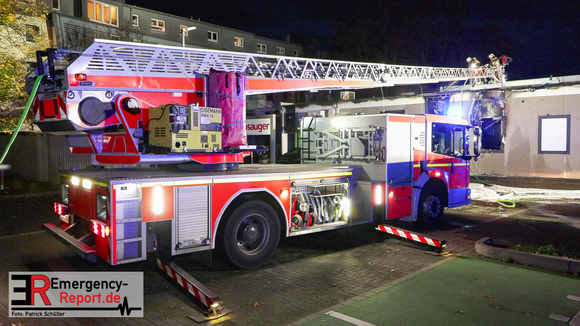 Am Montagnachmittag wurde die Feuerwehr Düsseldorf zu einem Feuer an einer Tankstelle am Südring gerufen. Bereits auf der Anfahrt war, im Bereich der Tankstelle, eine starke Rauchentwicklung zu erkennen. Nach den ersten Erkundungen ergab sich für die Einsatzkräfte folgendes Bild: Im hinteren Bereich des Tankstellenshops kam es zu einem Brand. Dort drohte das Feuer sich auf die Dachkonstruktion auszubreiten. Zusätzlich war der Verkaufsraum der Tankstelle stark verraucht. Die Feuerwehr leitete die Löschmaßnahmen ein, kontrollierte den Tankstellenshop und rettete eine männliche Person aus dem Bereich. Der Mann wurde durch den Brand lebensgefährlich verletzt, notärztlich an der Einsatzstelle versorgt und zur weiteren ärztlichen Behandlung in ein Krankenhaus transportiert. Der Rettungsdienst der Landeshauptstadt versorgte drei weitere Menschen medizinisch – eine weitere Behandlung in einem Krankenhaus war nicht erforderlich. An die Löscharbeiten schlossen sich noch zeitintensive Nachlöscharbeiten an, um auch die letzten versteckten Glutnester zu identifizieren.