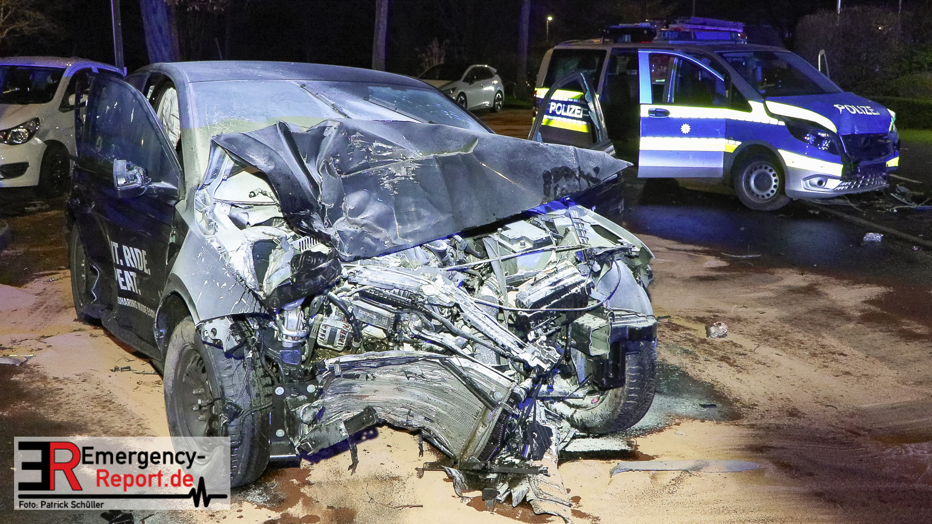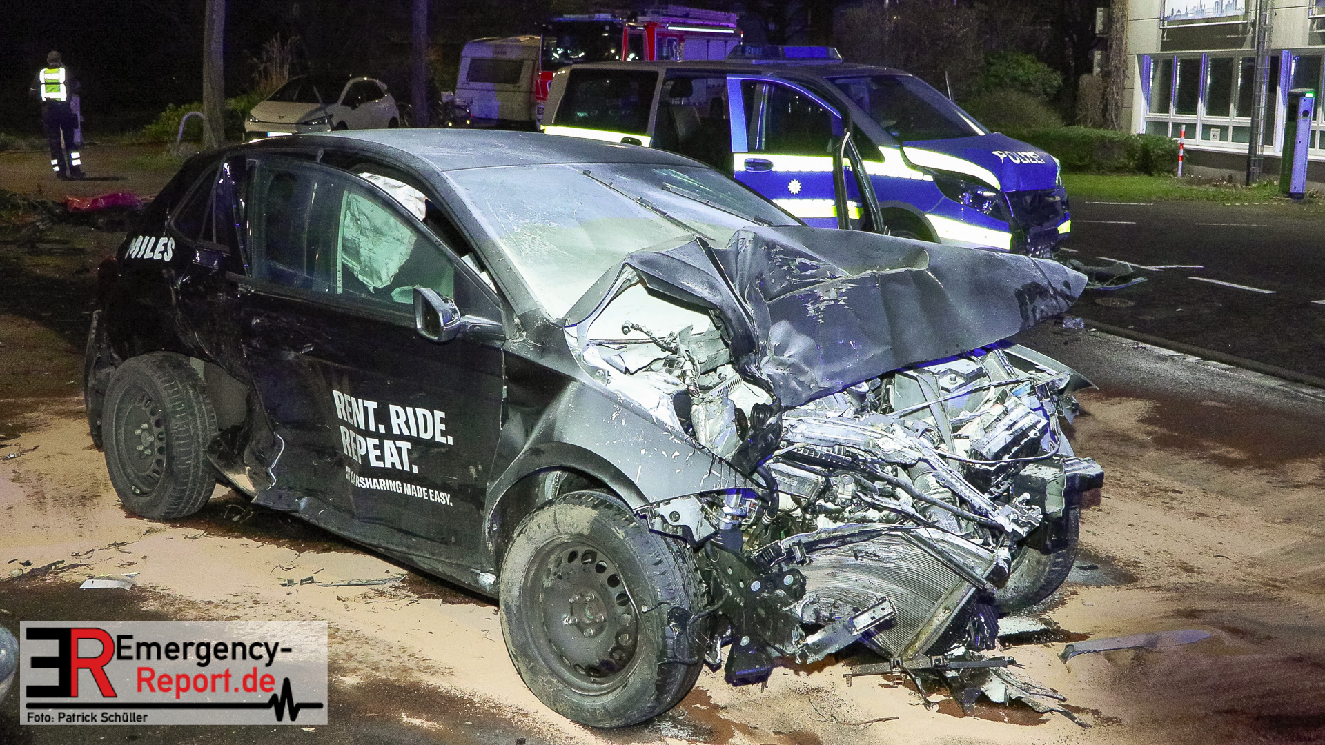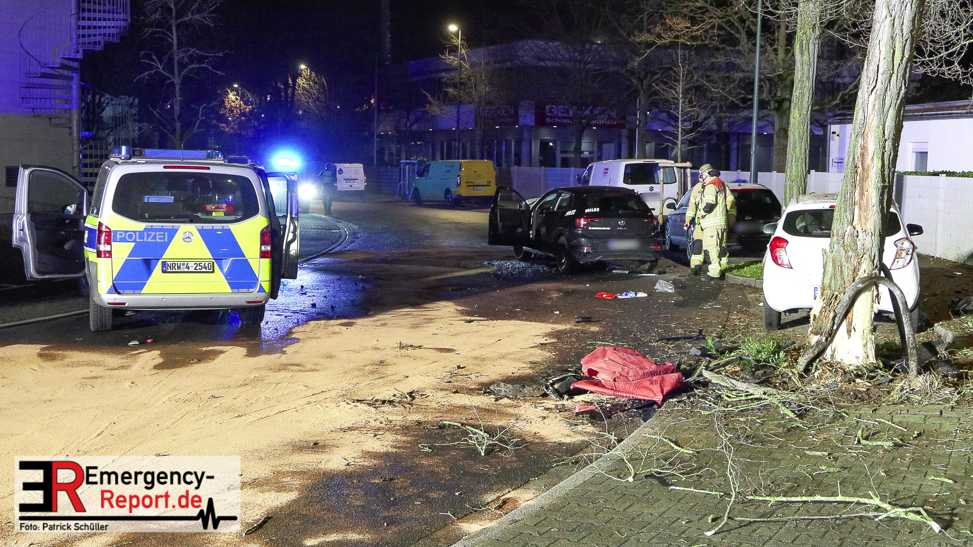 Der VW des Sharingunternehmens war einem Einsatzteam der Polizeiwache Wersten aufgefallen und sollte kontrolliert werden. Der zunächst unbekannte Fahrzeugführer des VW wollte sich offenkundig nicht kontrollieren lassen und flüchtete mit erhöhter Geschwindigkeit vor der Polizei durch das Düsseldorfer Stadtgebiet. Auf der Potsdamer Straße beschädigte der flüchtende VW mehrere Außenspiegel geparkter Fahrzeuge. Auf der Straße In der Steele verlor der Fahrzeugführer die Kontrolle über den VW, wodurch dieser von der Fahrbahn abkam, im Anschluss mit einem Baum kollidierte und auf der Fahrbahn zum Stehen kam. Hierbei geriet der Mietwagen in Brand. Dabei kollidierte der nachfolgende Streifwagen unmittelbar mit dem Unfallwagen und schob diesen in einen geparkten PKW. Der schwelende Brand konnte mittels Feuerlöscher durch die eingesetzten Polizeivollzugsbeamten gelöscht und die 14 und 15 Jahre alten Fahrzeuginsassen, beide aus Hassels, gerettet werden. Der 14-jährige Fahrzeugführer und sein 15-jähriger deutscher Beifahrer wurden verletzt und mit einem Rettungswagen zur stationären Behandlung in ein Krankenhaus gebracht. Die beiden eingesetzten Polizeivollzugsbeamten blieben unverletzt. Der 14-jährige Fahrzeugführer war nicht im Besitz einer gültigen Fahrerlaubnis. Der Jugendliche war in der Vergangenheit bereits durch einen gleich gelagerten Sachverhalt polizeilich in Erscheinung getreten. Der 14-Jährige muss nun mit einer Strafanzeige unter anderem wegen des Verdachts des Fahrens ohne Fahrerlaubnis und des verbotenen Kraftfahrzeugrennens rechnen. Die Ermittlungen dauern an.