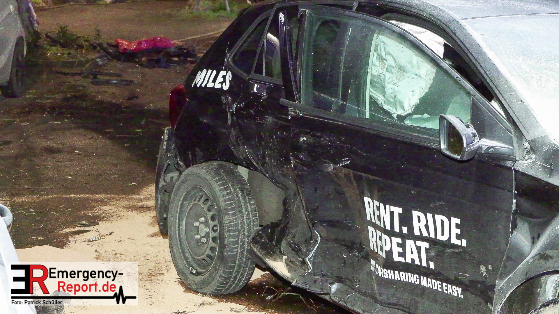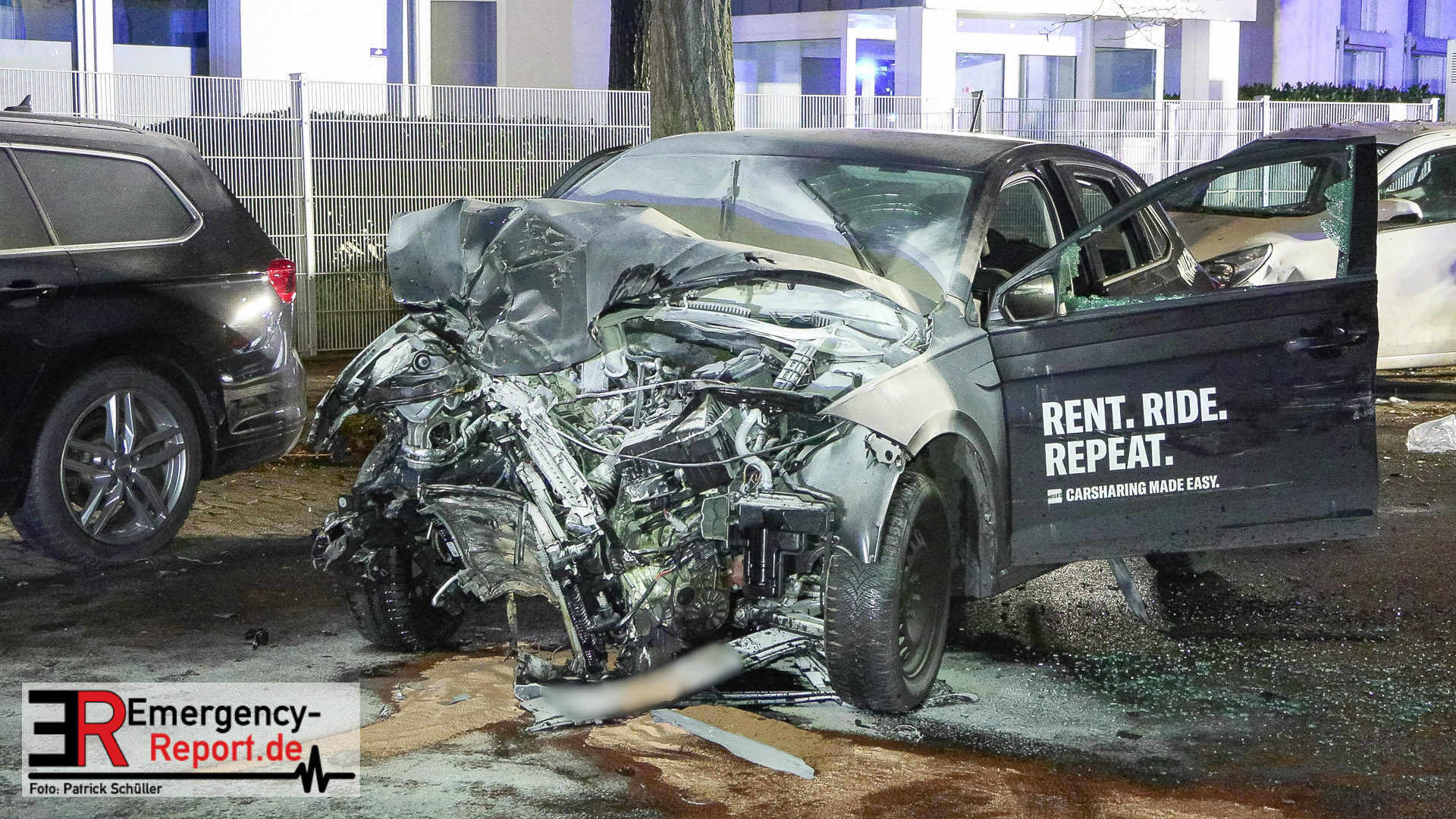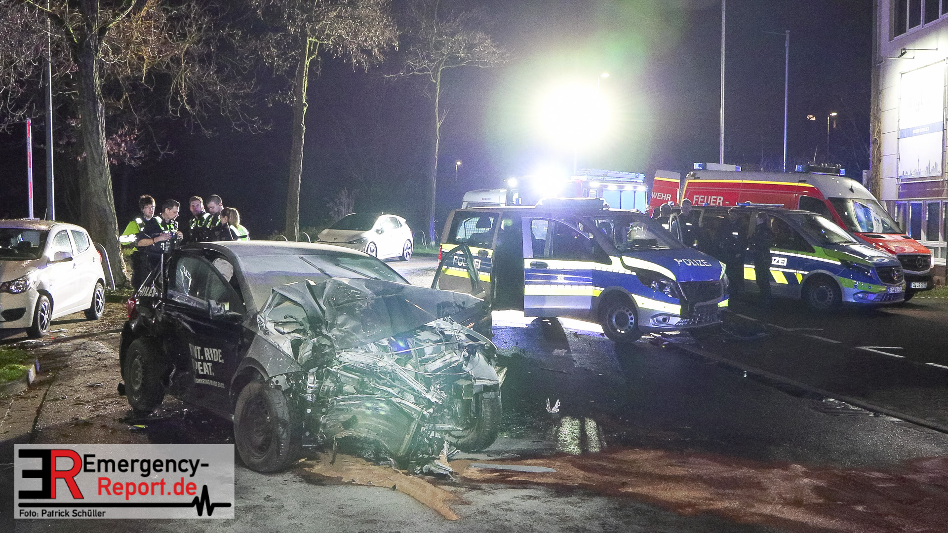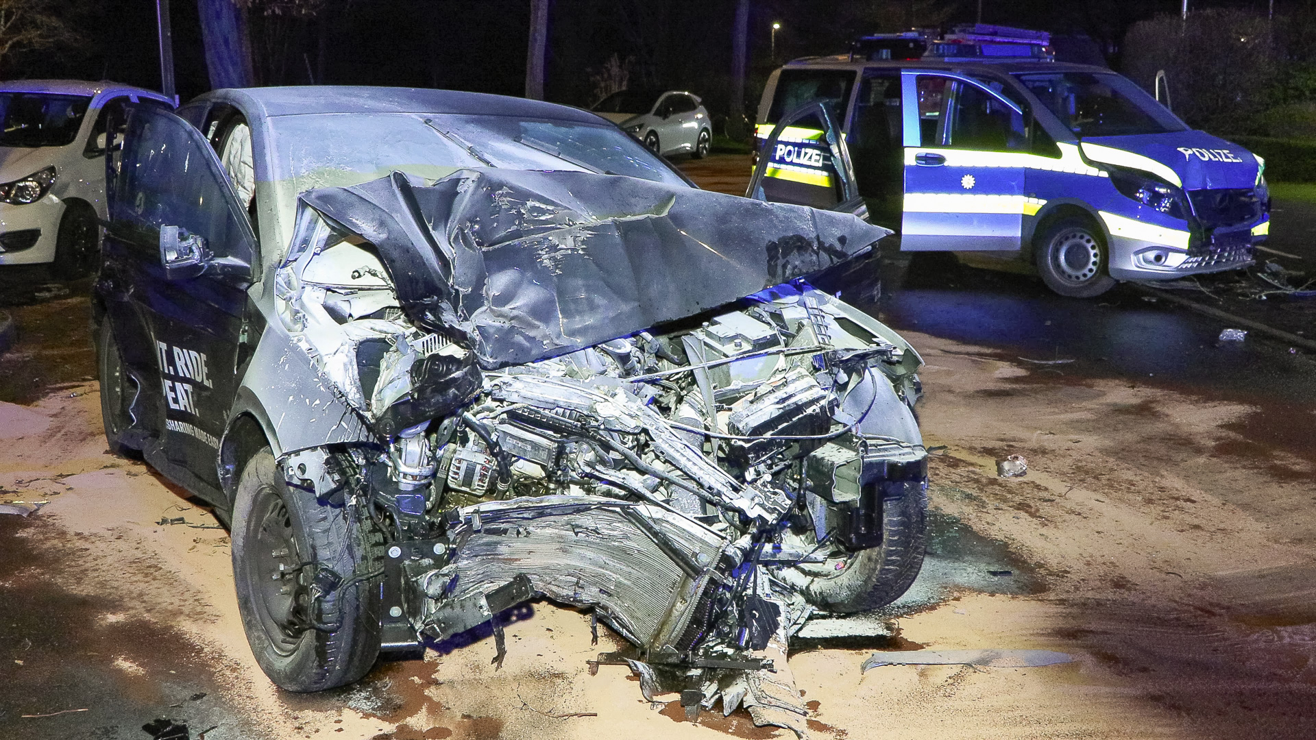 Der VW des Sharingunternehmens war einem Einsatzteam der Polizeiwache Wersten aufgefallen und sollte kontrolliert werden. Der zunächst unbekannte Fahrzeugführer des VW wollte sich offenkundig nicht kontrollieren lassen und flüchtete mit erhöhter Geschwindigkeit vor der Polizei durch das Düsseldorfer Stadtgebiet. Auf der Potsdamer Straße beschädigte der flüchtende VW mehrere Außenspiegel geparkter Fahrzeuge. Auf der Straße In der Steele verlor der Fahrzeugführer die Kontrolle über den VW, wodurch dieser von der Fahrbahn abkam, im Anschluss mit einem Baum kollidierte und auf der Fahrbahn zum Stehen kam. Hierbei geriet der Mietwagen in Brand. Dabei kollidierte der nachfolgende Streifwagen unmittelbar mit dem Unfallwagen und schob diesen in einen geparkten PKW. Der schwelende Brand konnte mittels Feuerlöscher durch die eingesetzten Polizeivollzugsbeamten gelöscht und die 14 und 15 Jahre alten Fahrzeuginsassen, beide aus Hassels, gerettet werden. Der 14-jährige Fahrzeugführer und sein 15-jähriger deutscher Beifahrer wurden verletzt und mit einem Rettungswagen zur stationären Behandlung in ein Krankenhaus gebracht. Die beiden eingesetzten Polizeivollzugsbeamten blieben unverletzt. Der 14-jährige Fahrzeugführer war nicht im Besitz einer gültigen Fahrerlaubnis. Der Jugendliche war in der Vergangenheit bereits durch einen gleich gelagerten Sachverhalt polizeilich in Erscheinung getreten. Der 14-Jährige muss nun mit einer Strafanzeige unter anderem wegen des Verdachts des Fahrens ohne Fahrerlaubnis und des verbotenen Kraftfahrzeugrennens rechnen. Die Ermittlungen dauern an.