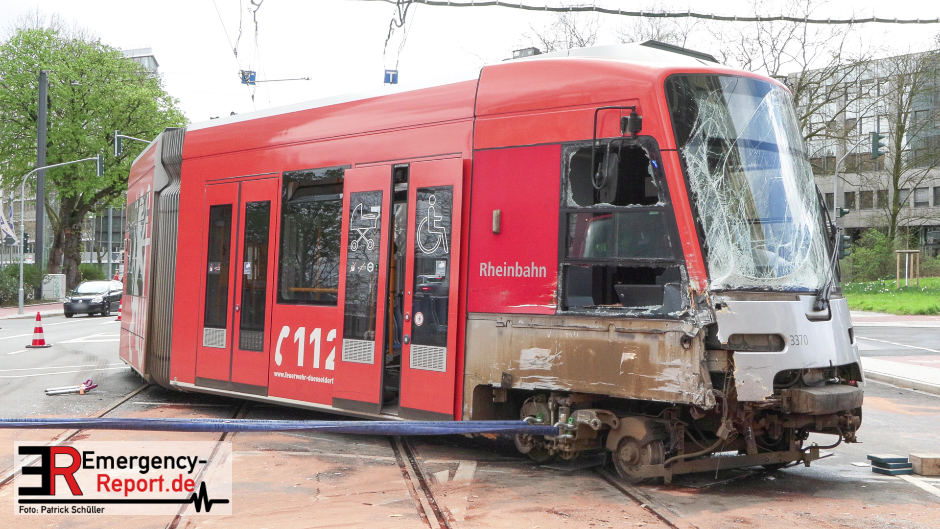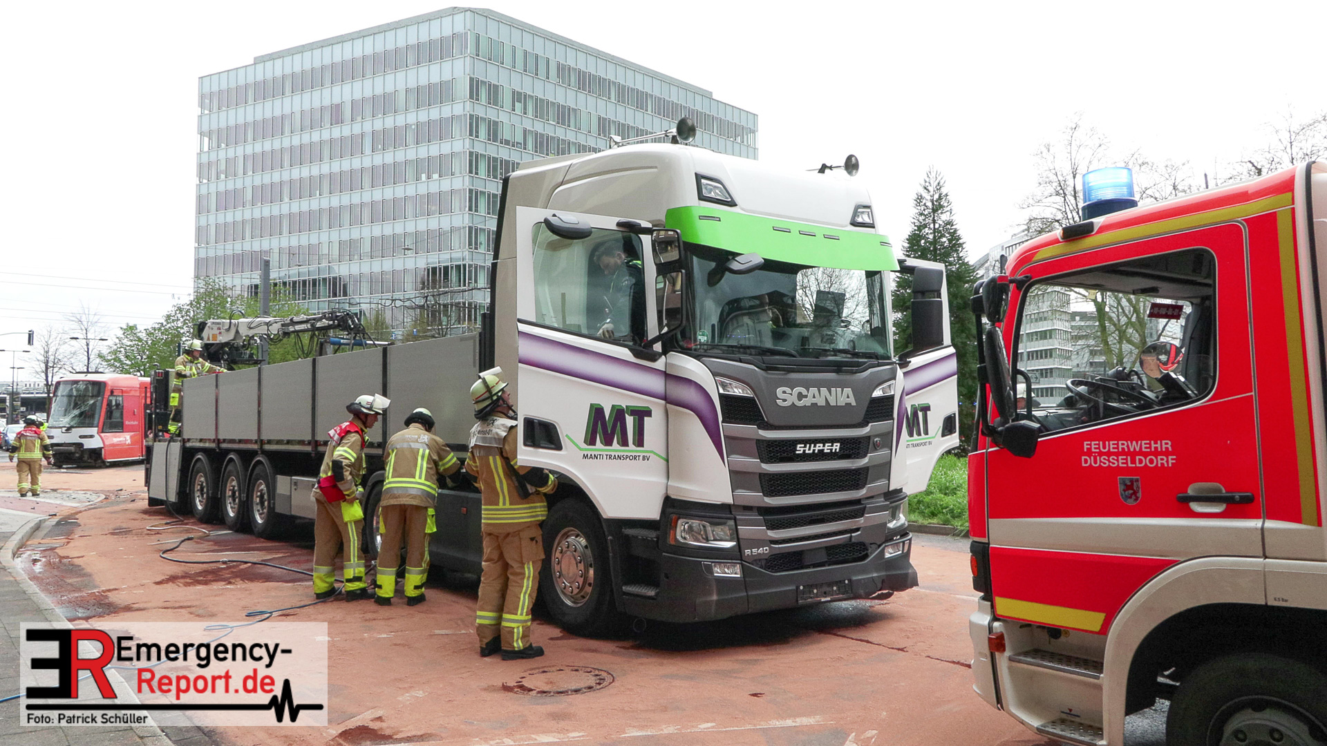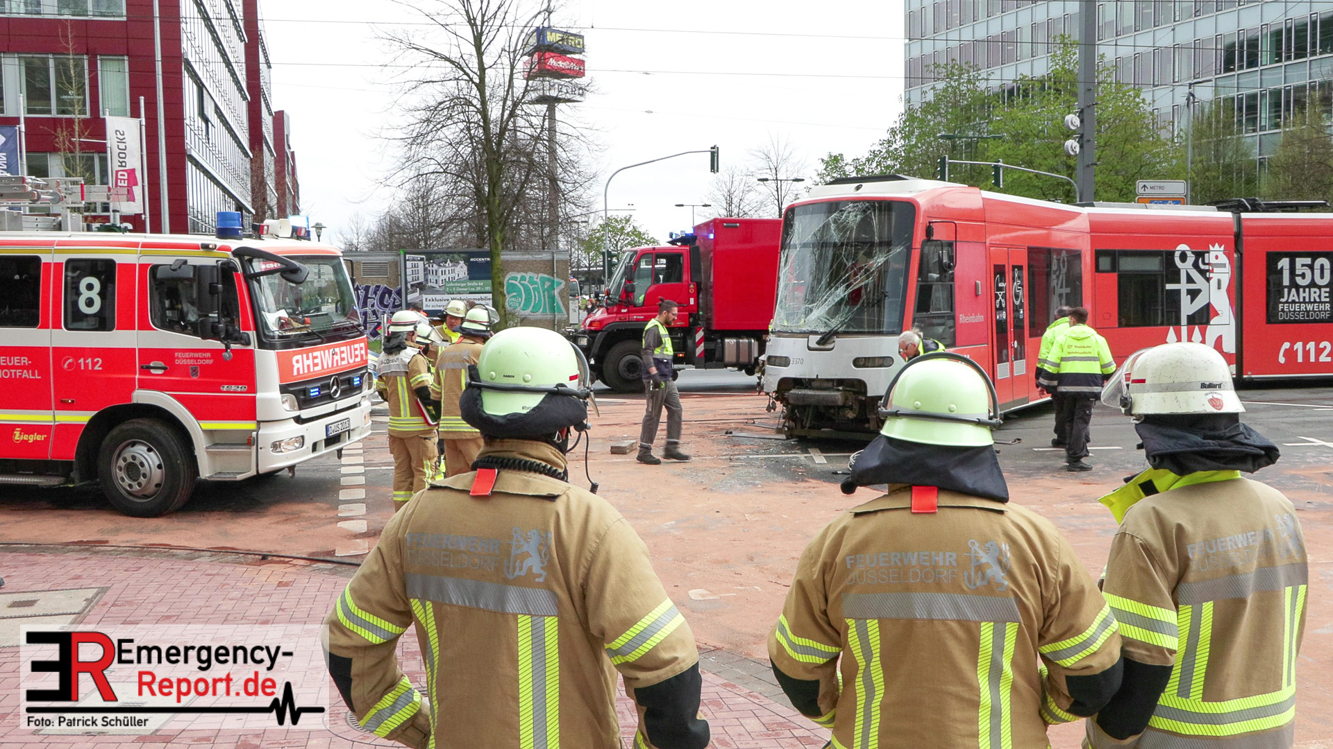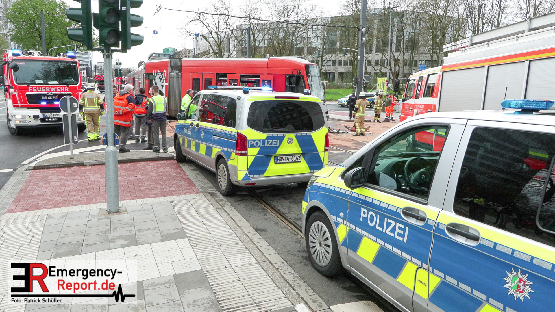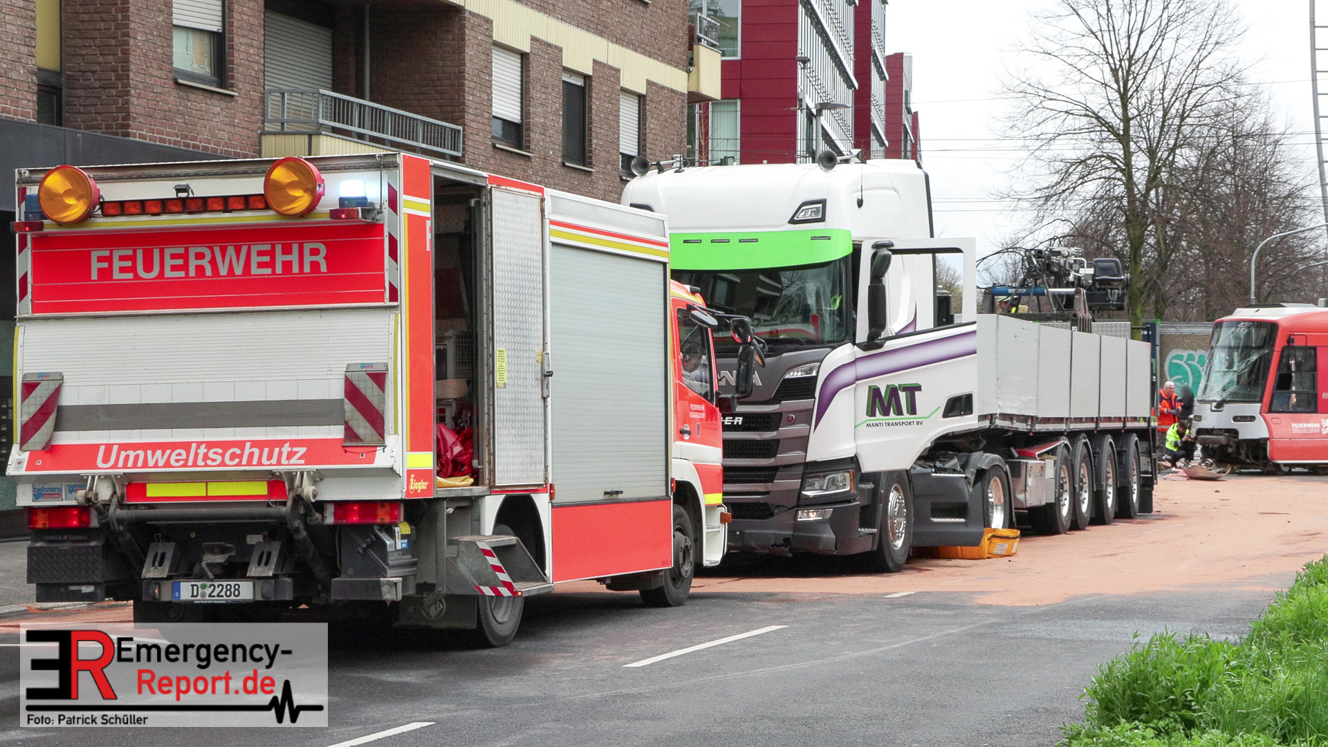 Mittwochmittag um kurz nach 13 Uhr meldete die Leitstelle der Rheinbahn einen Verkehrsunfall zwischen einem Lkw und einer Straßenbahn im Kreuzungsbereich in Grafenberg. Bereits fünf Minuten nach der Alarmierung trafen die ersten Einsatzkräfte an der Unfallstelle ein und bestätigten die Meldung. Aus bislang ungeklärter Ursache war ein Lkw mit einer Straßenbahn kollidiert. Die Bahn hatte die Fahrerseite des Lkw erfasst und dabei den Tank des Fahrzeuges beschädigt, sodass Dieselkraftstoff austrat und großflächig auf die Fahrbahn lief. Durch den Aufprall entgleiste die Bahn, welche zu der Zeit mit Passagieren unterwegs war, von denen sich drei Insassen Verletzungen zu zogen. Zudem wurde der Fahrer des Lkw verletzt. Notärzte sowie Notfallsanitäter betreuten und untersuchten die leicht verletzten Personen, von denen zwei in ein Krankenhaus transportiert wurden. Um ein weiteres Austreten des Dieselkraftstoffes aus dem beschädigten Tank zu verhindern, pumpten Einsatzkräfte den Inhalt mittels Spezialpumpen in ein Fass um und streuten den ausgelaufenen Kraftstoff mit Bindemittel ab. Zur Ermittlung der Unfallursache hat die Polizei ihre Arbeit aufgenommen.