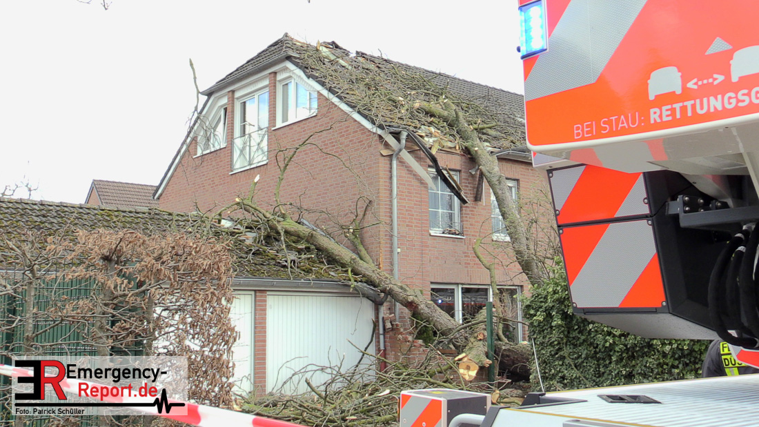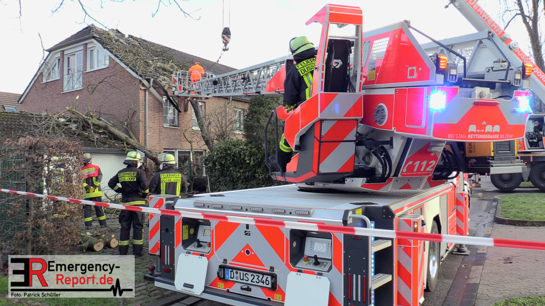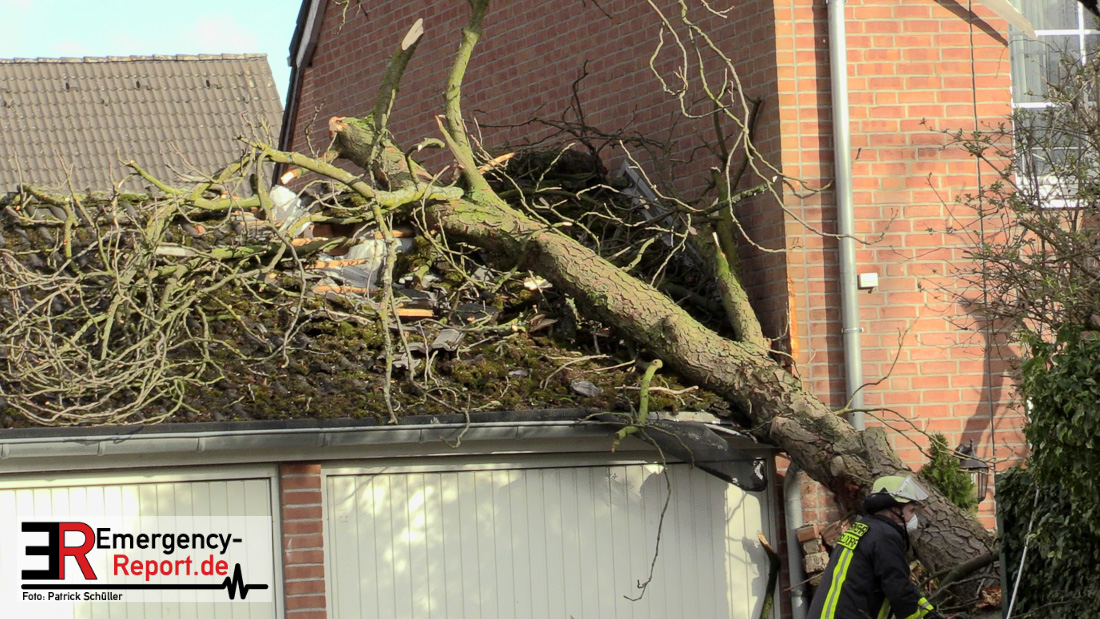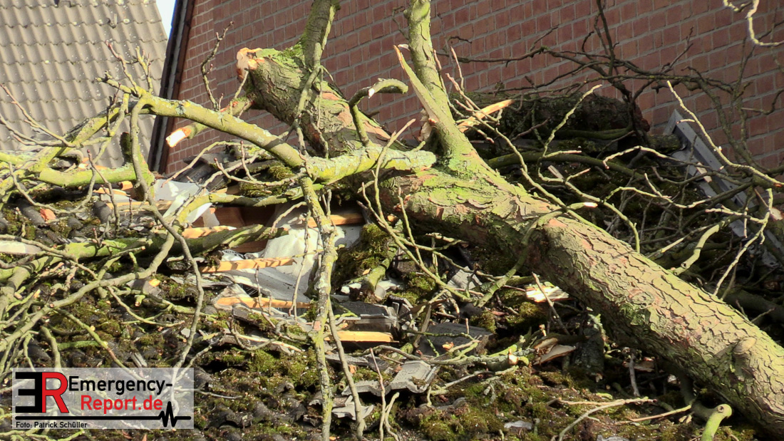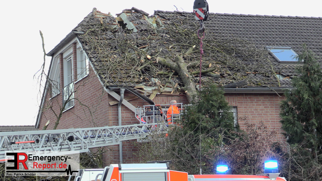 Bei Eintreffen der ersten Einsatzkräfte stellte sich heraus, dass ein großer Baum auf ein Wohnhaus und auf eine Garage gestürzt war. Das Dach des Hauses und das Dach der Garage wurden durch den Baum stark beschädigt. Durch den Feuerwehrkran wurde der Baumstamm angehoben und vom Dach entfernt. Verletzt wurde glücklicherweise niemand.