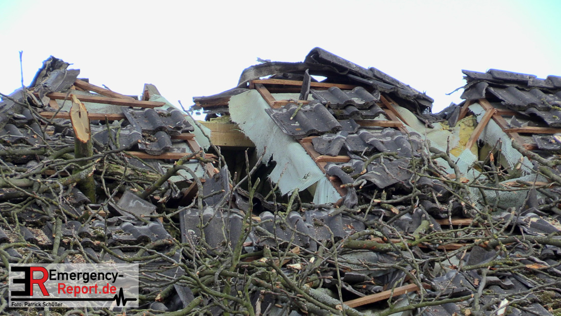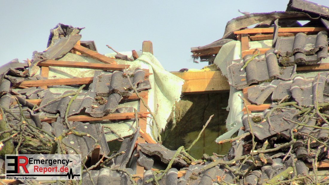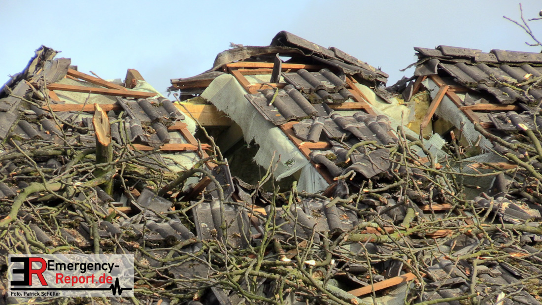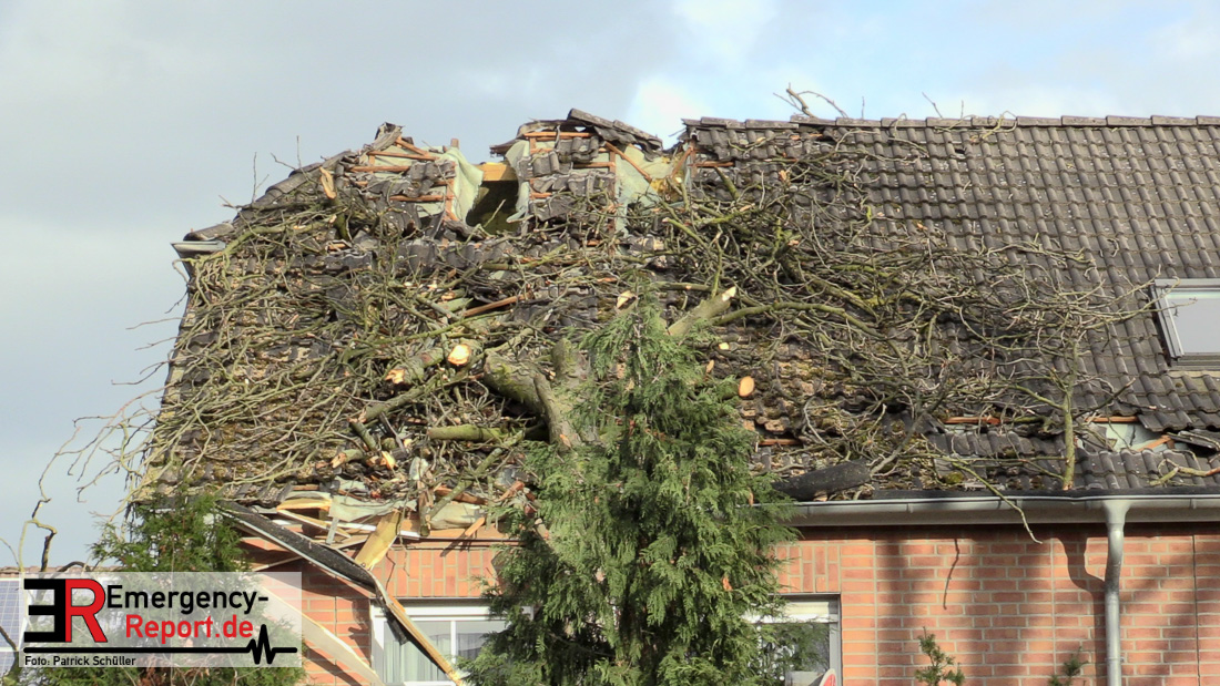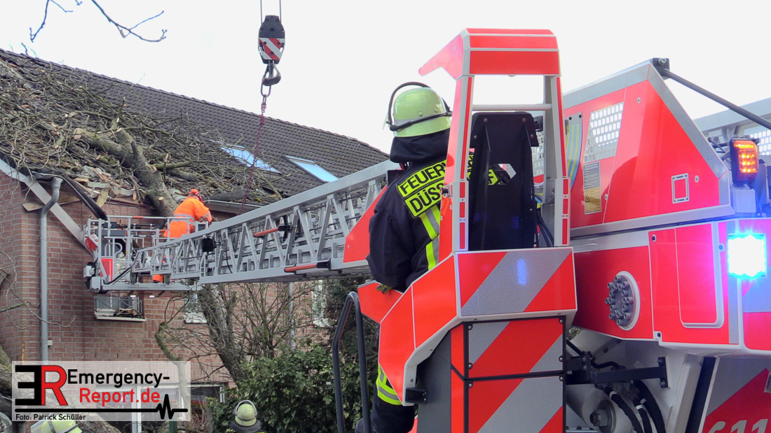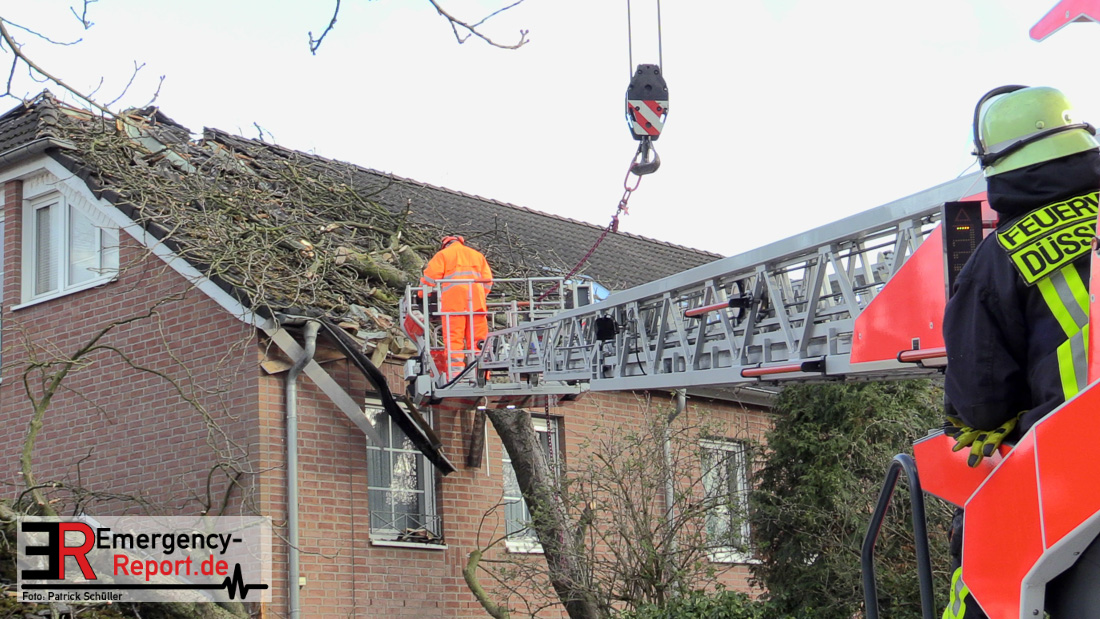 Bei Eintreffen der ersten Einsatzkräfte stellte sich heraus, dass ein großer Baum auf ein Wohnhaus und auf eine Garage gestürzt war. Das Dach des Hauses und das Dach der Garage wurden durch den Baum stark beschädigt. Durch den Feuerwehrkran wurde der Baumstamm angehoben und vom Dach entfernt. Verletzt wurde glücklicherweise niemand.