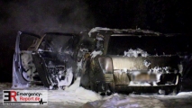 Ausgelaufener Kraftstoff aus dem geschmolzenen Tank entzündete sich immer wieder mit großen Stichflammen, sodass schließlich mit Schaum gelöscht werden musste.