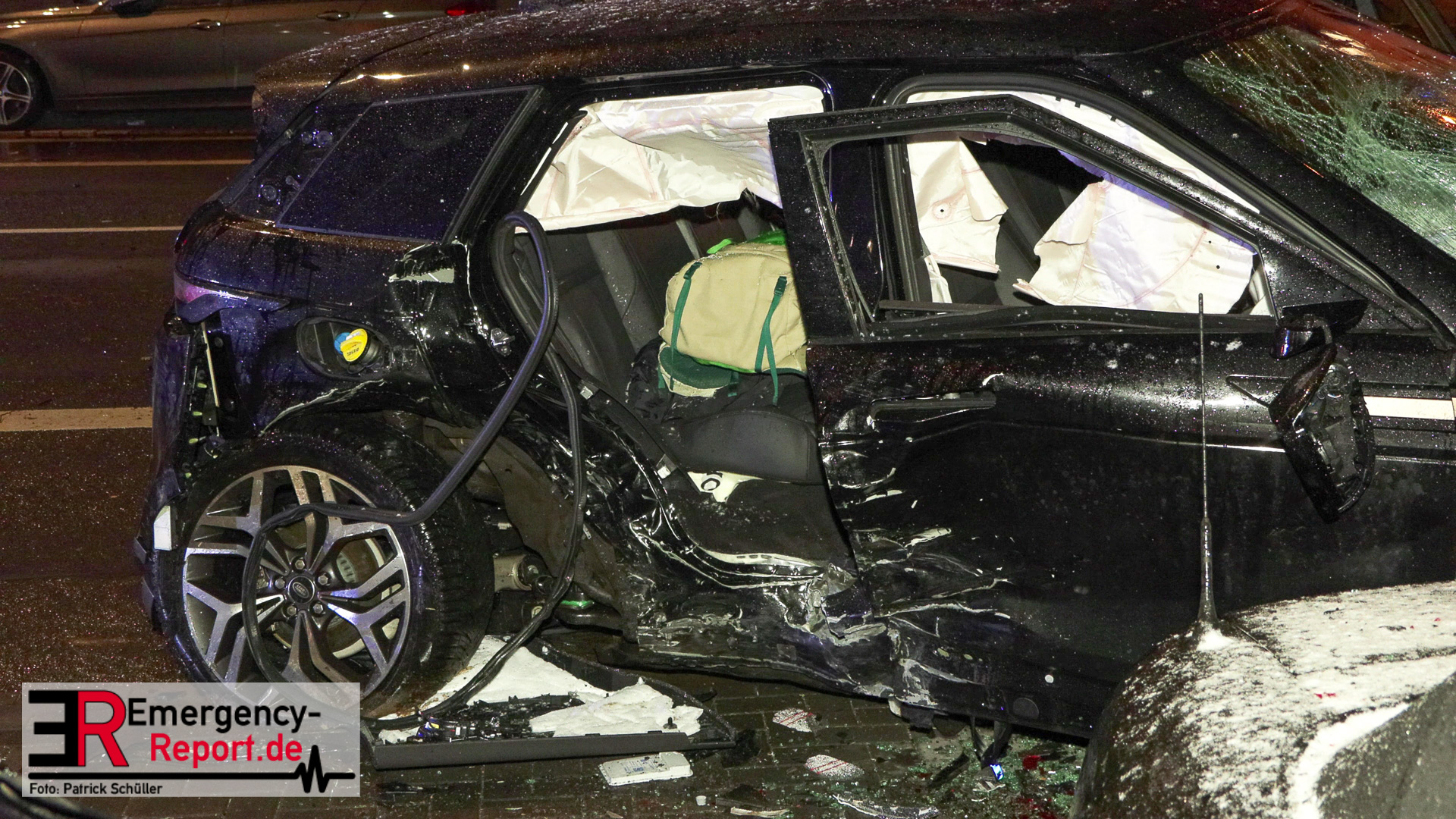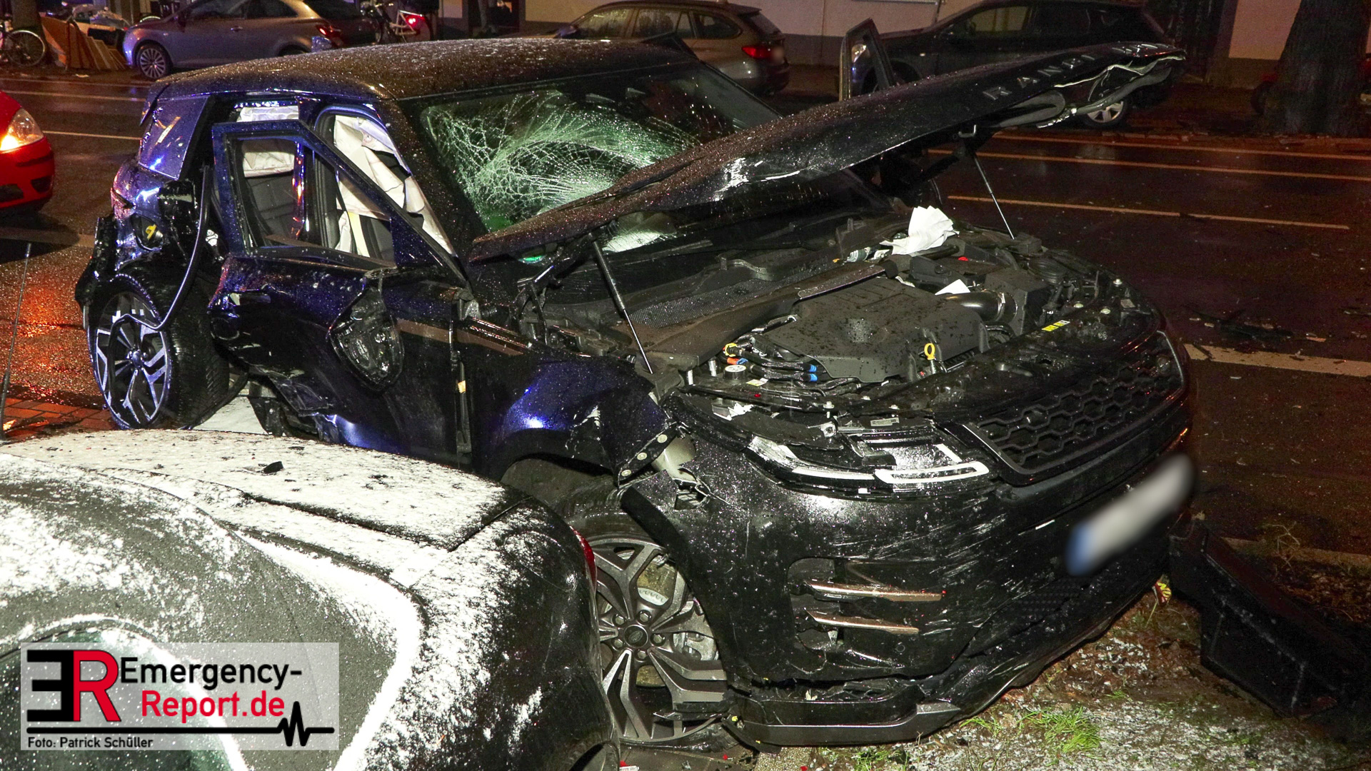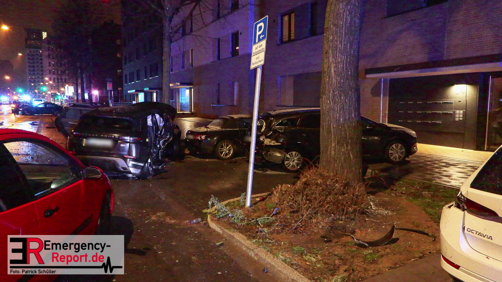 Durch die Wucht des Aufpralls touchierte der SUV noch mehrere geparkte Fahrzeuge und kam frontal vor einem Baum zum Stehen. Der 35-Jährige und sein 39 Jahre alter Beifahrer wurden schwer verletzt in umliegende Krankenhäuser eingeliefert. Von den vier Insassen des Mercedes wurden der Fahrer sowie zwei 31- und 26-jährige Insassen leicht, eine 40 Jahre alte Frau lebensgefährlich verletzt.